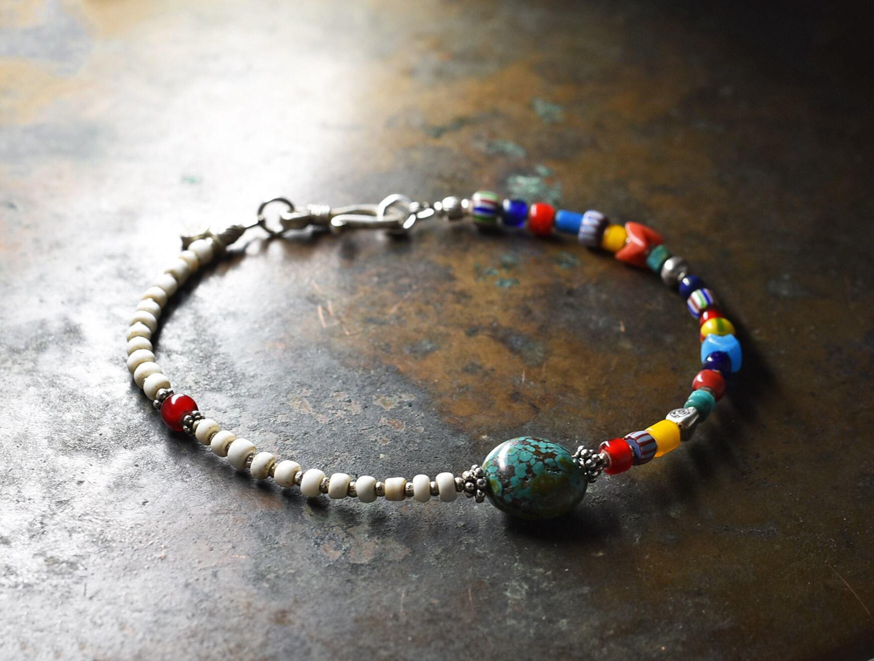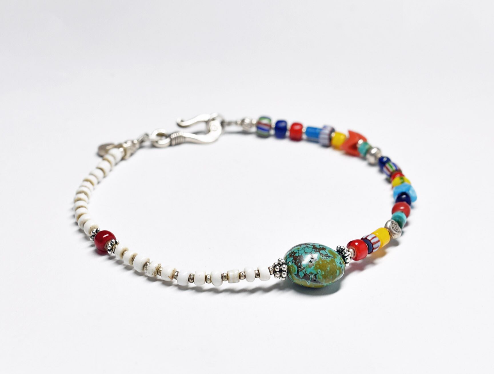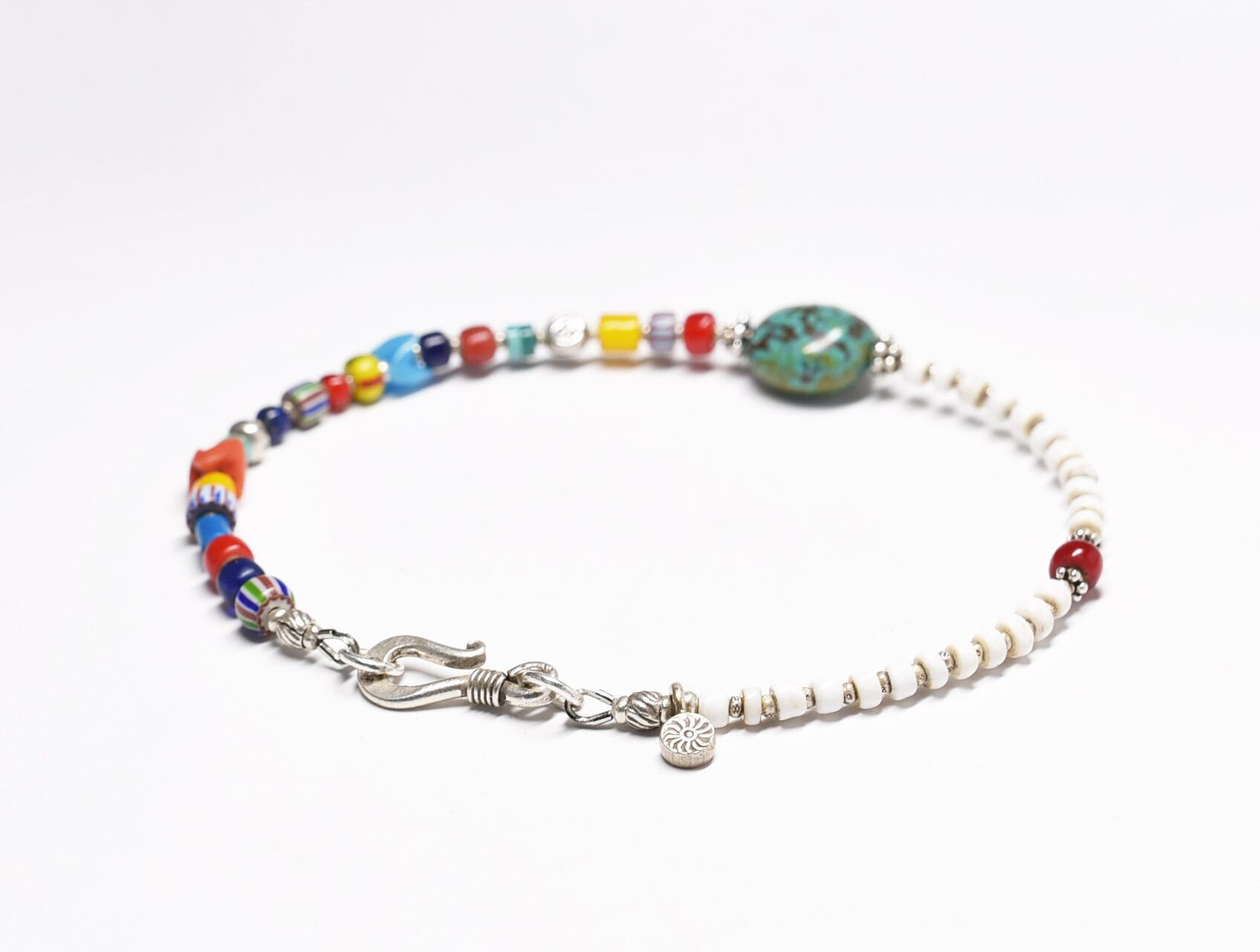 チベタンターコイズとカラフルなアンティークビーズ、カレンシルバーなど繋いだアンクレットです。