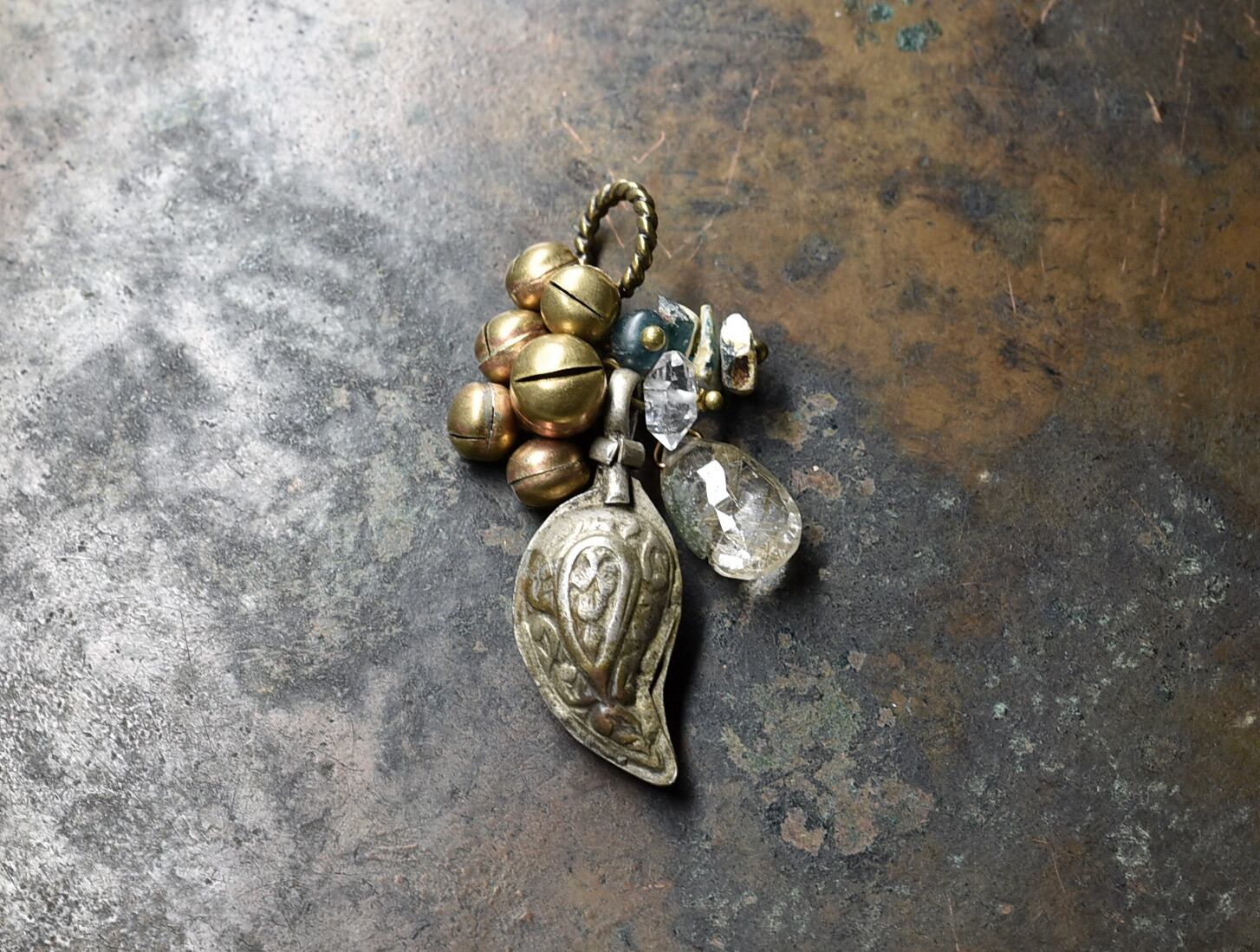 アフガニスタンoldシルバーとたわわな鈴、ガーデンルチルクォーツ、ハーキマーダイヤモンド、アンティークビーズのペンダントトップ