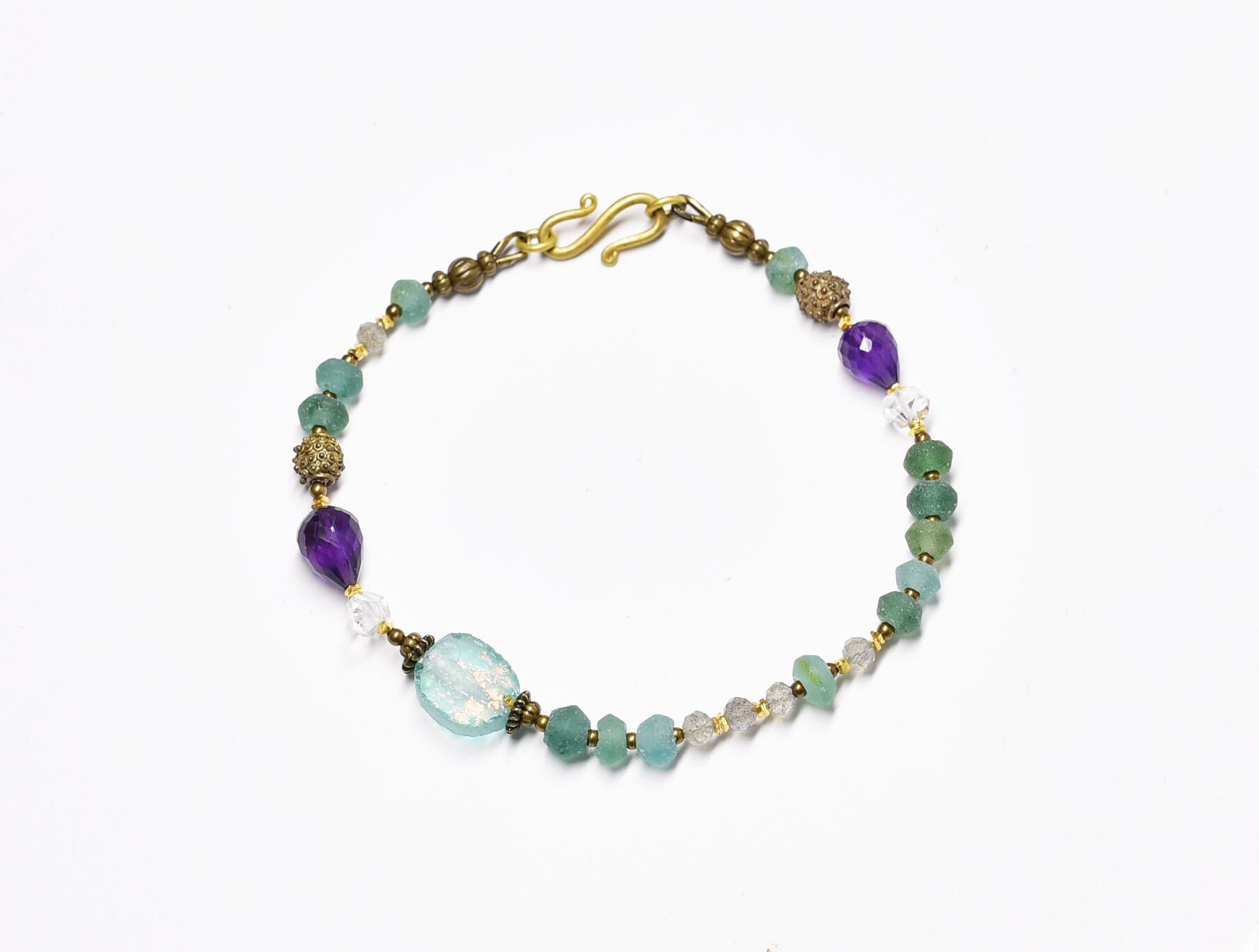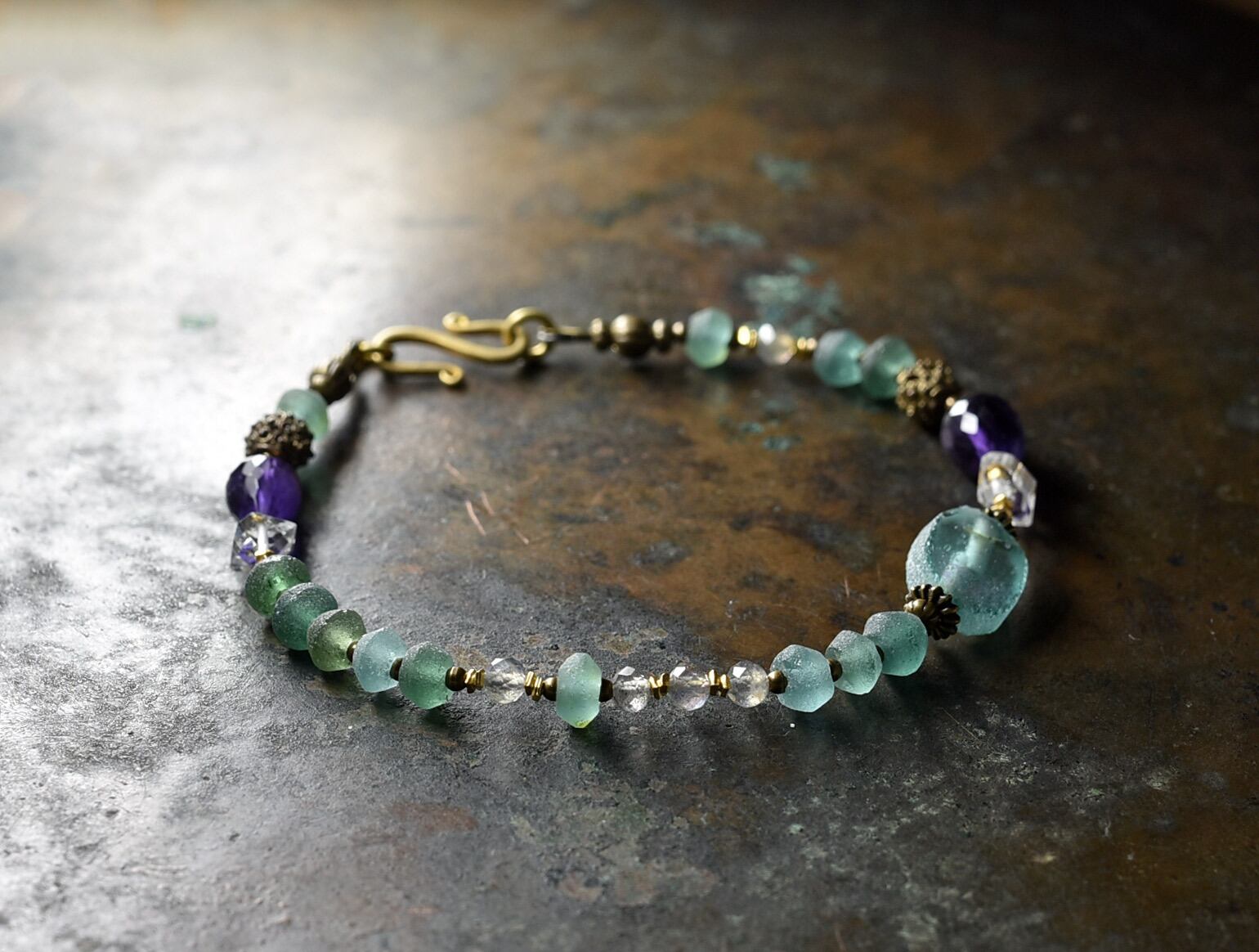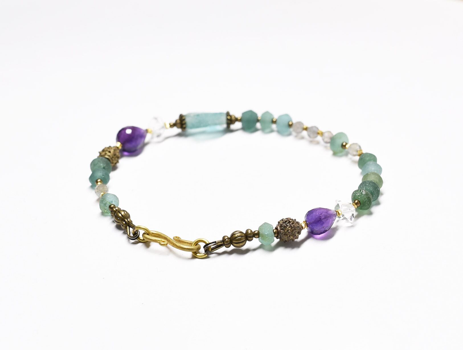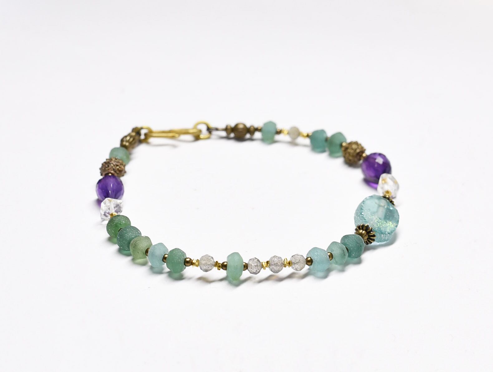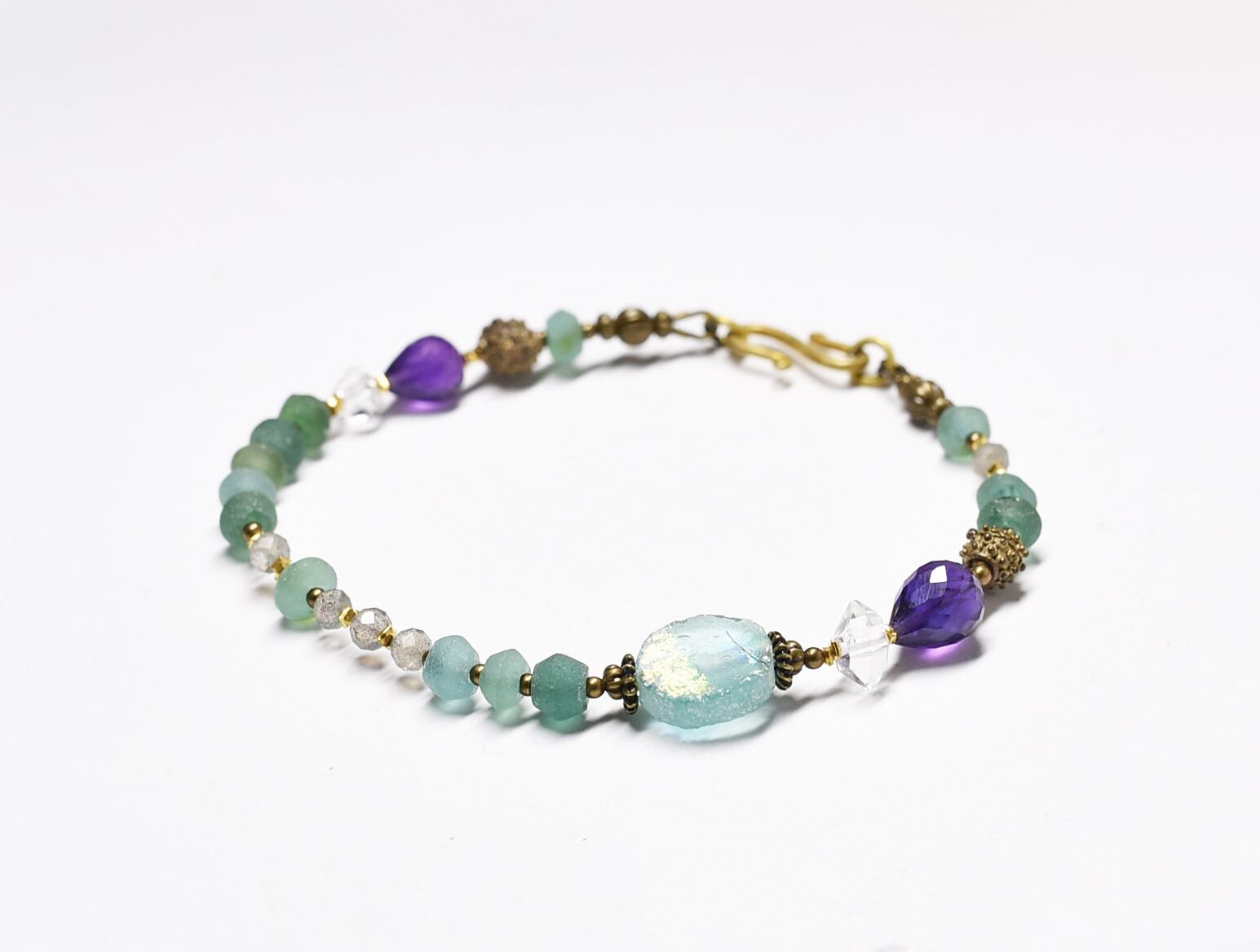 2種類のローマングラスと、アメジスト、ハーキマーダイヤモンド、ラブラドライトを繋いだブレスです。