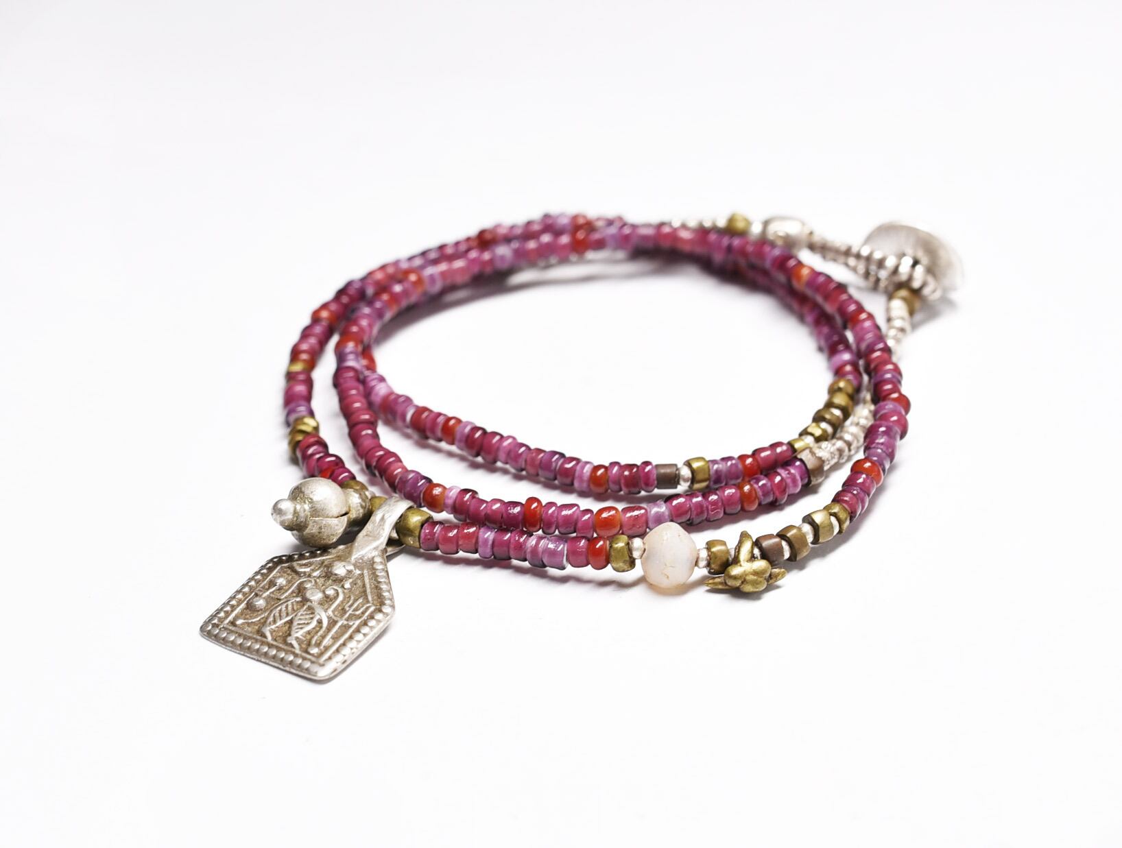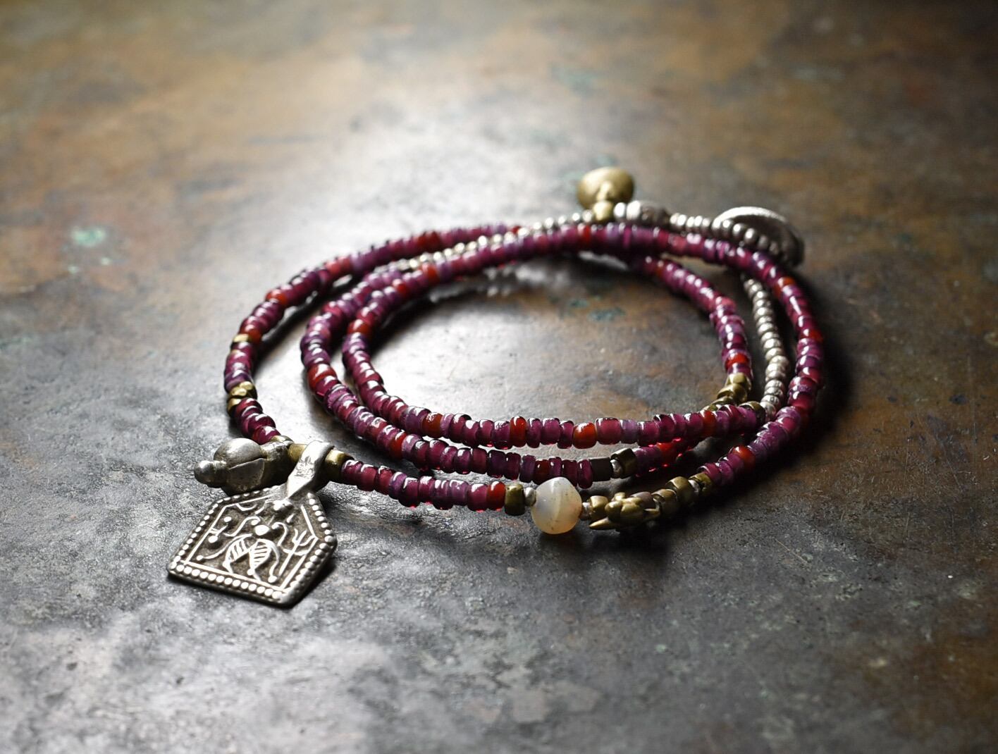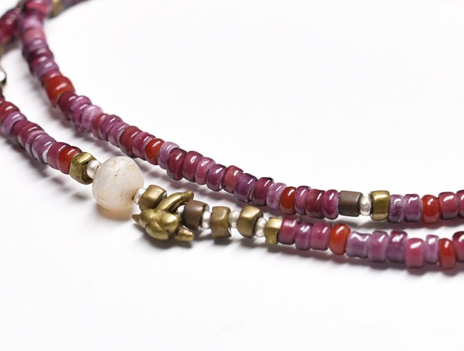 濃淡のある紫色や赤色のビーズはホワイトハーツと呼ばれるアンティークビーズです。