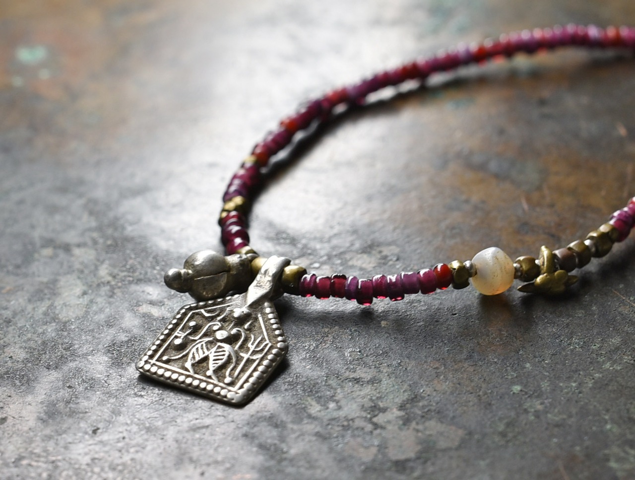 oldインドシルバートップと葡萄色ホワイトハーツ、古代瑪瑙の華奢なネックレス