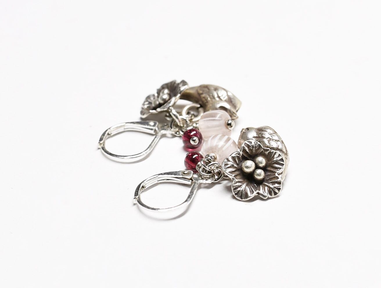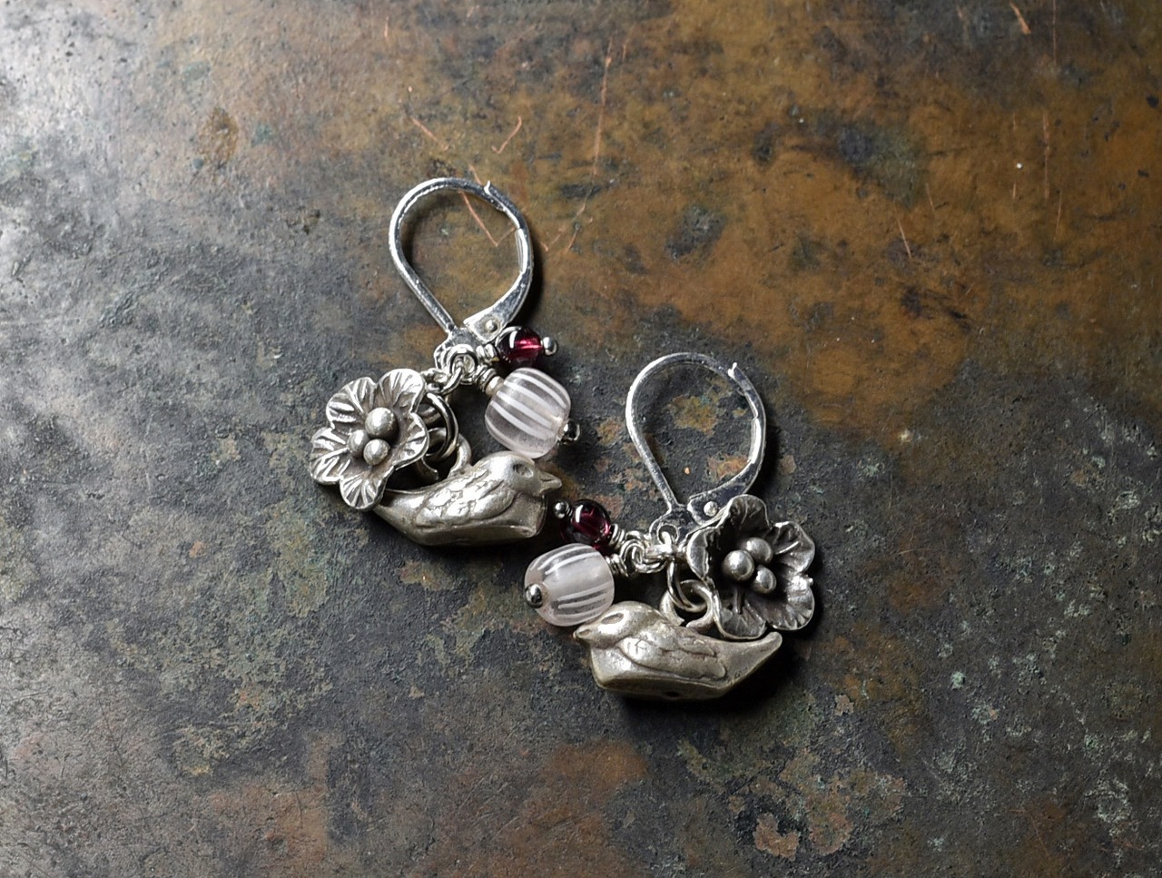 小鳥とお花のカレンシルバーチャームに、アンティークビーズ、ガーネットを繋げたピアスです。