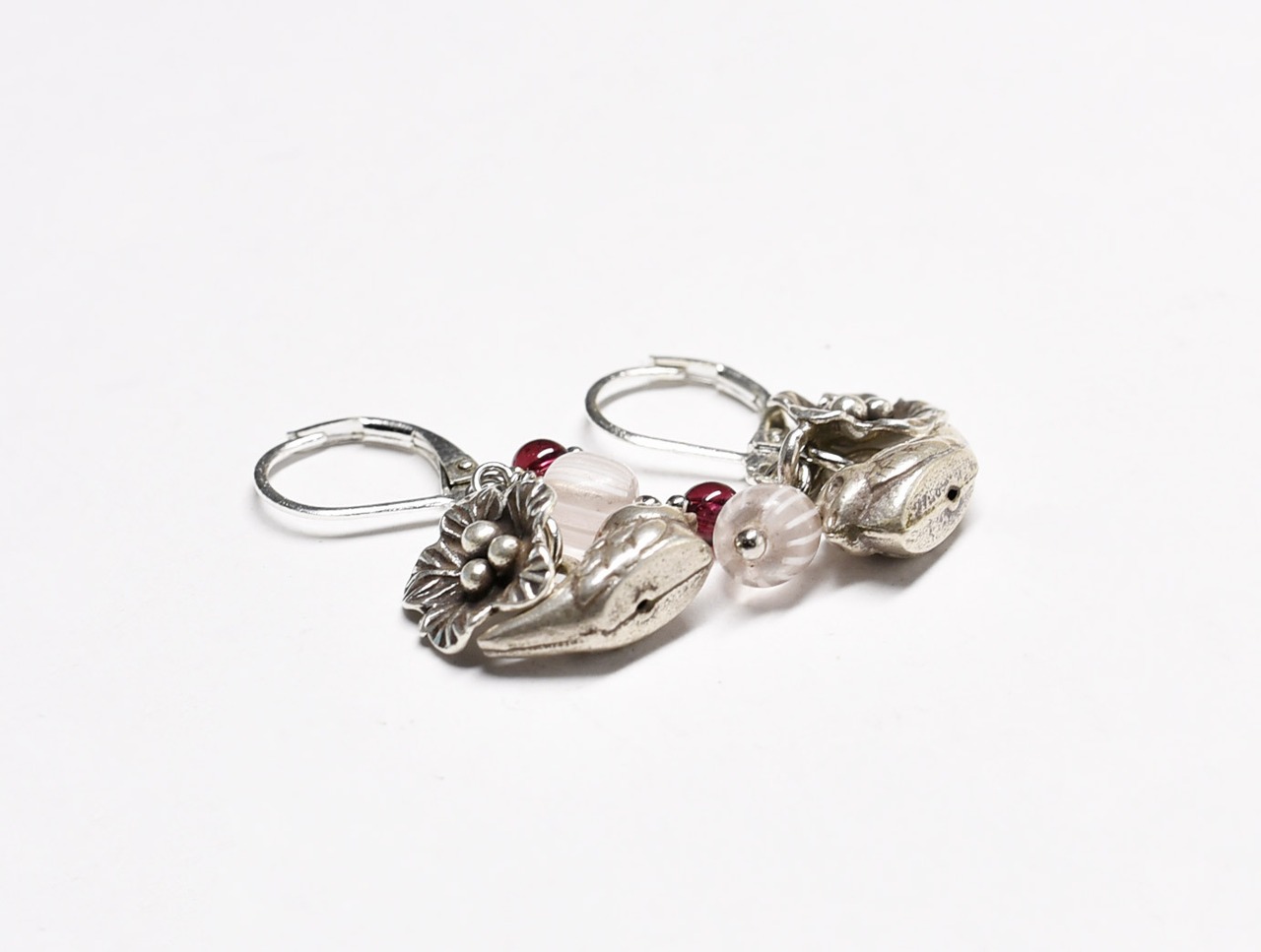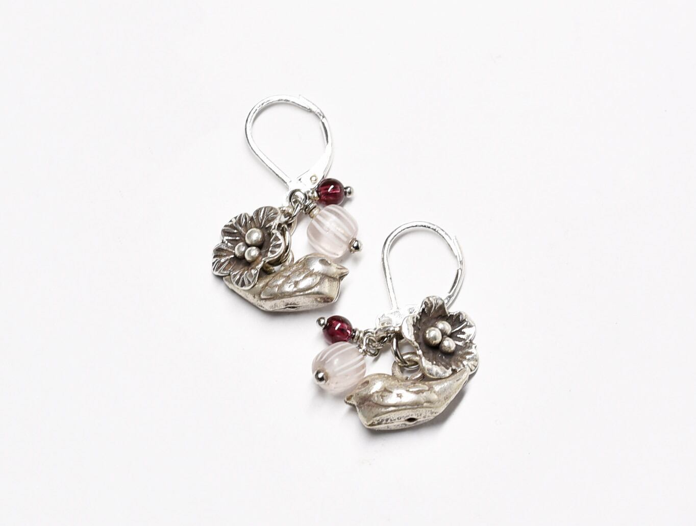 小鳥とお花カレンシルバー、グーズベリーとガーネットのピアス