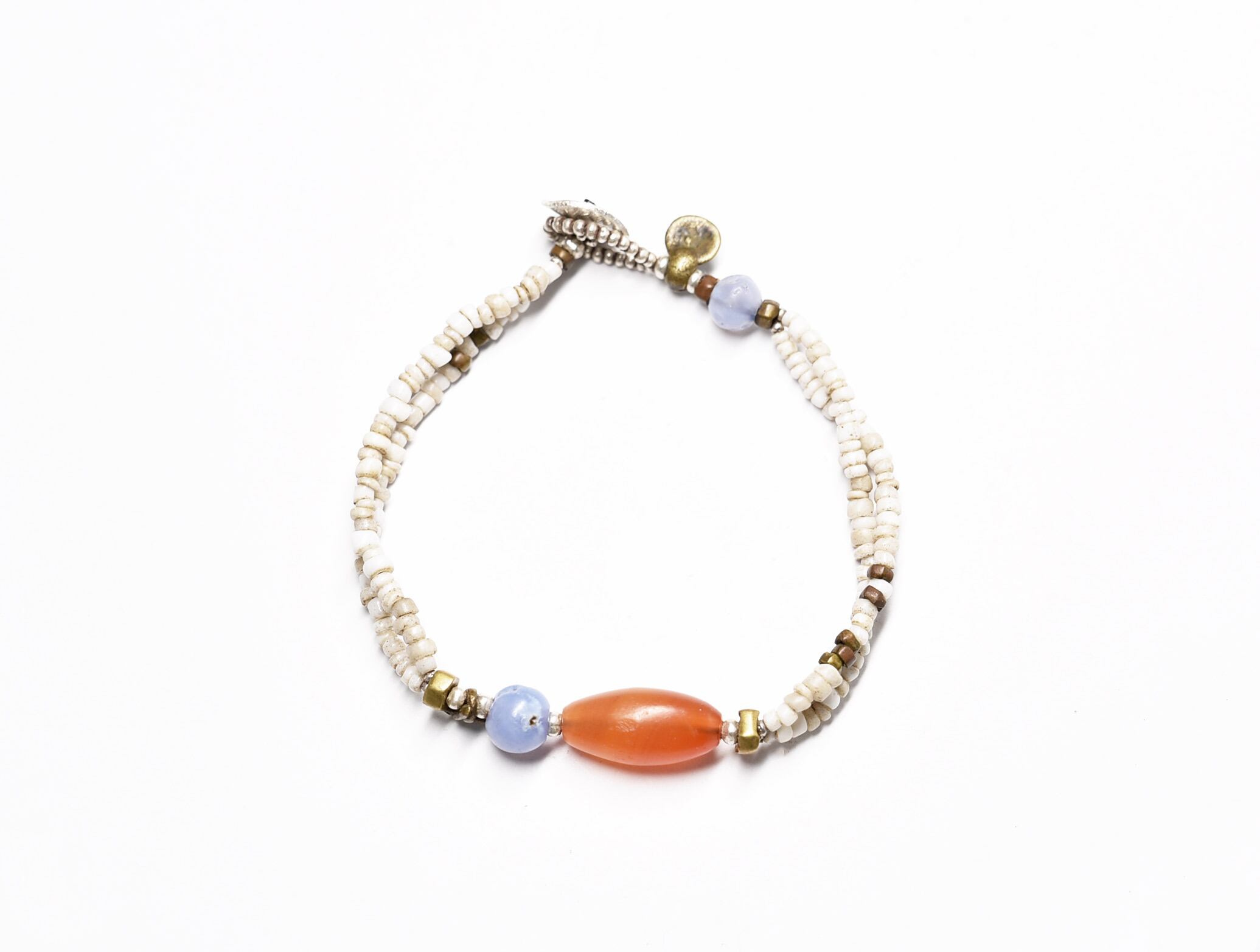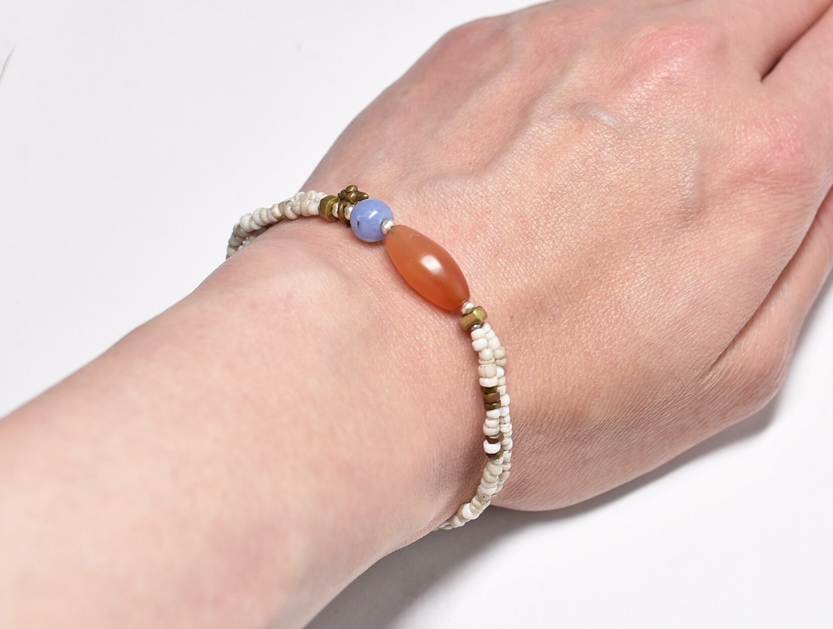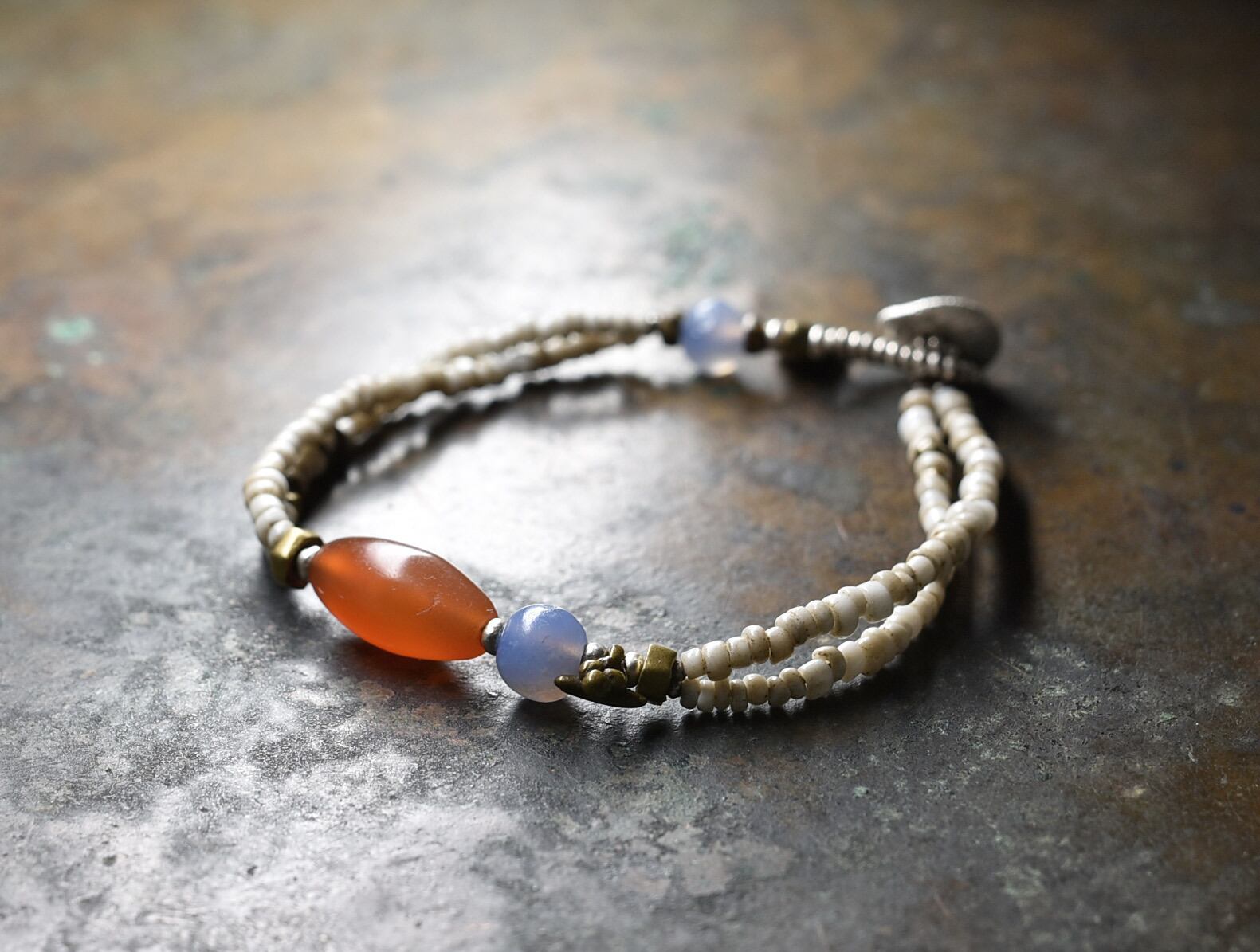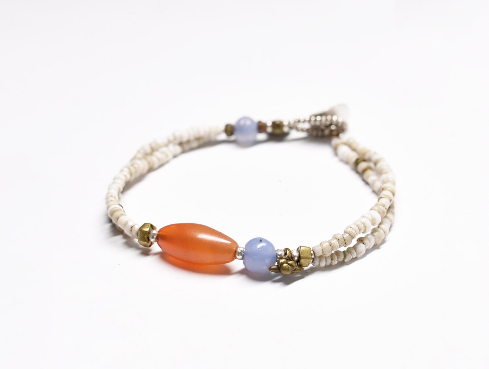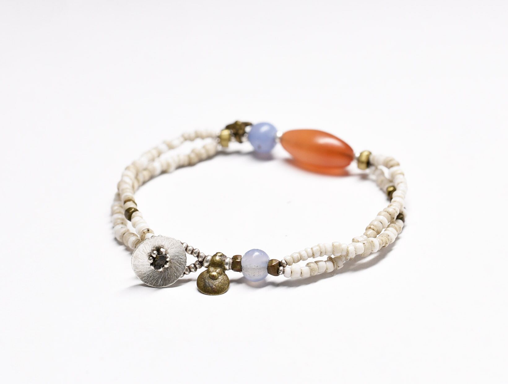 古代カーネリアン、古代ブルーレース、アンティークホワイトビーズ、oldオリッサブラス、カレンシルバーを繋いだ2連のブレスです。