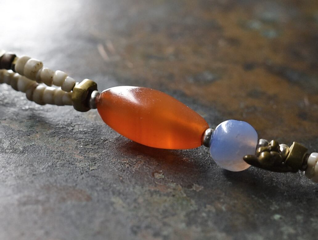 素材:古代カーネリアン、古代ブルーレース、ガラス、真鍮、カレンシルバー、ロウビキ紐