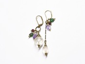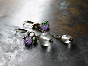 アンティークボヘミアビーズとラフロックアメジスト、ガーネットをリングとチェーンで繋いだアンシメトリーなピアスです。