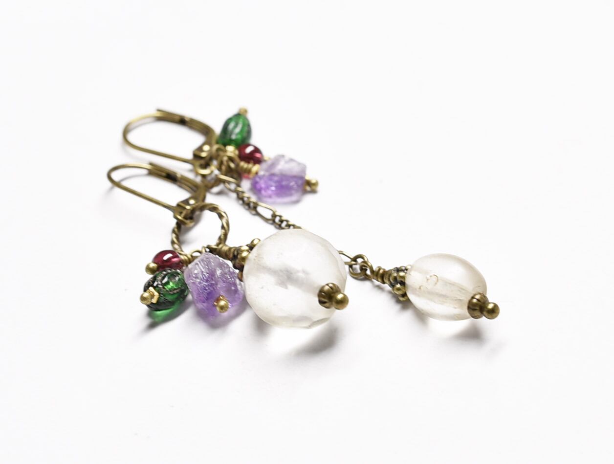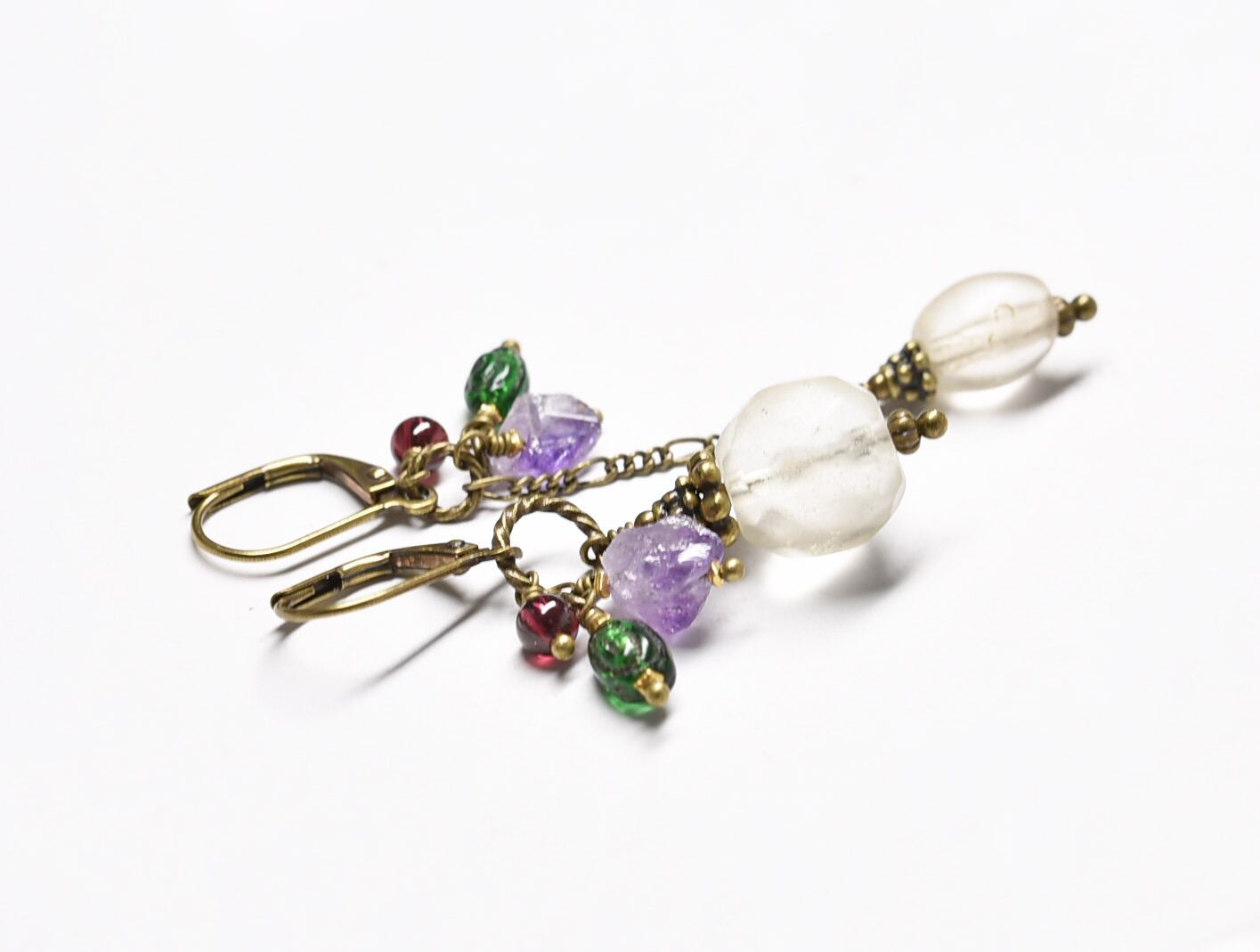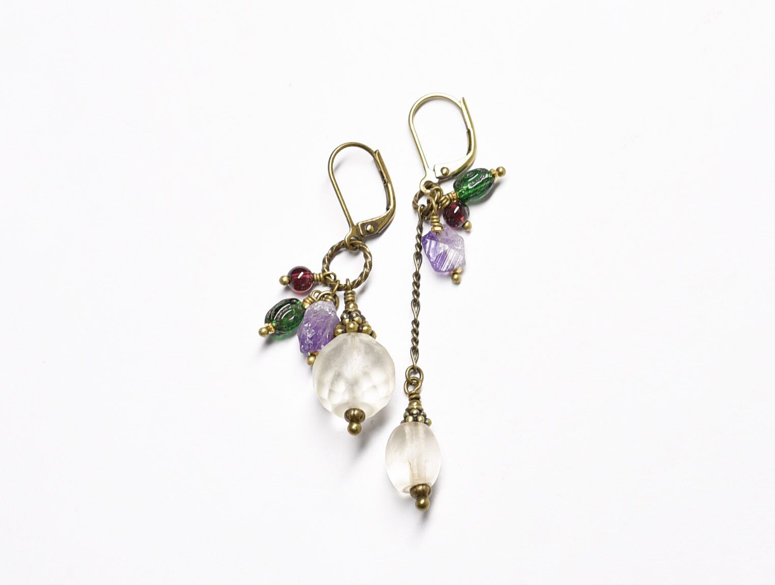 素材:ガラス、ガーネット、ラフロックアメジスト、真鍮、カレンシルバー