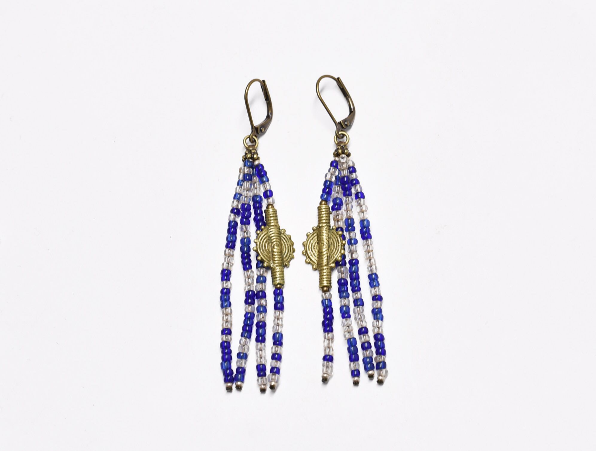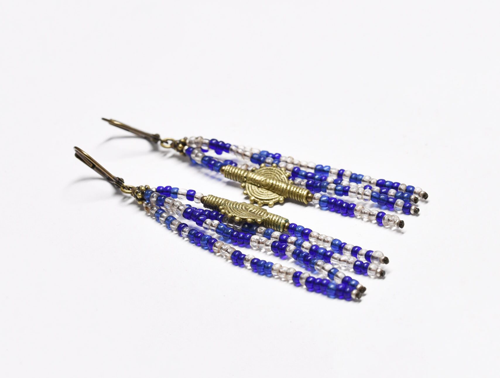 アンティークヴェネチアビーズと民族ブラスのフリンジピアス(ブルー&クリア)