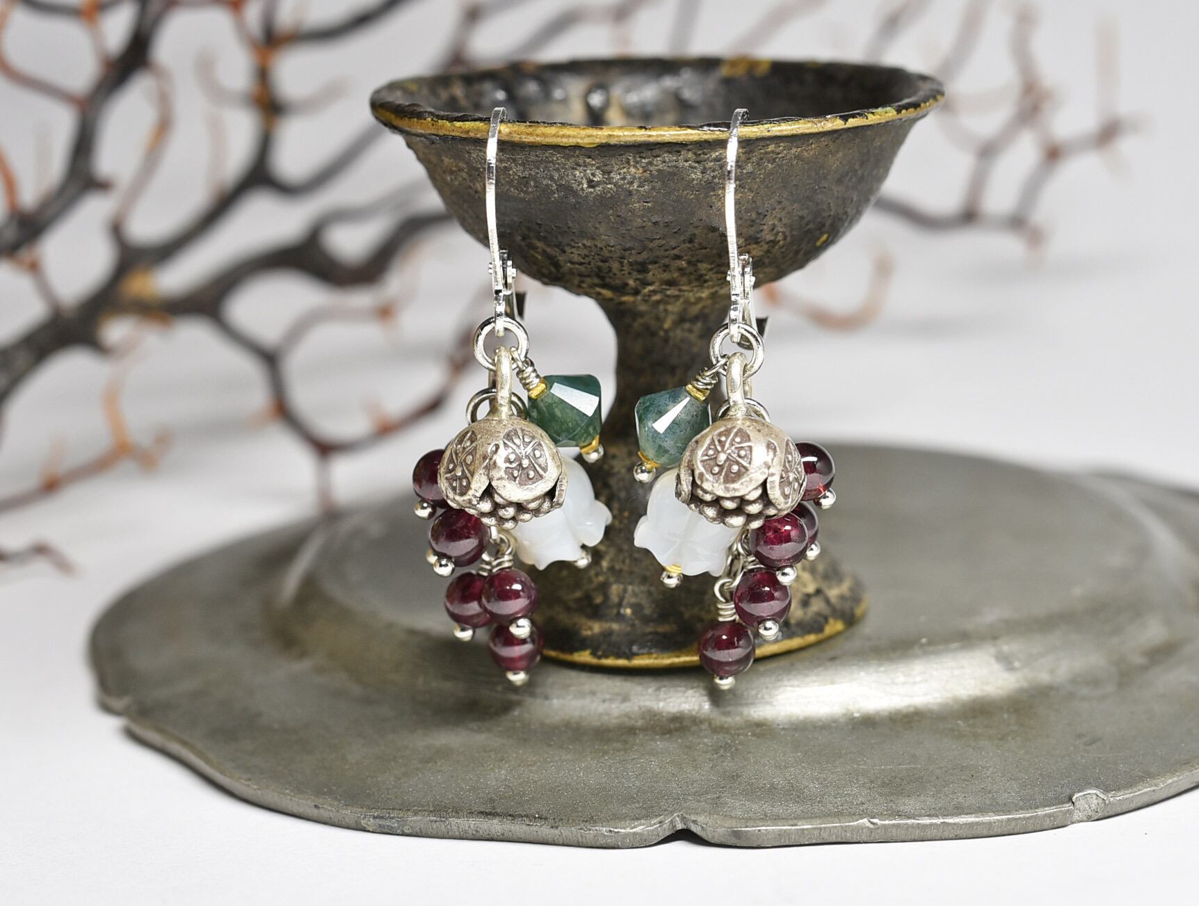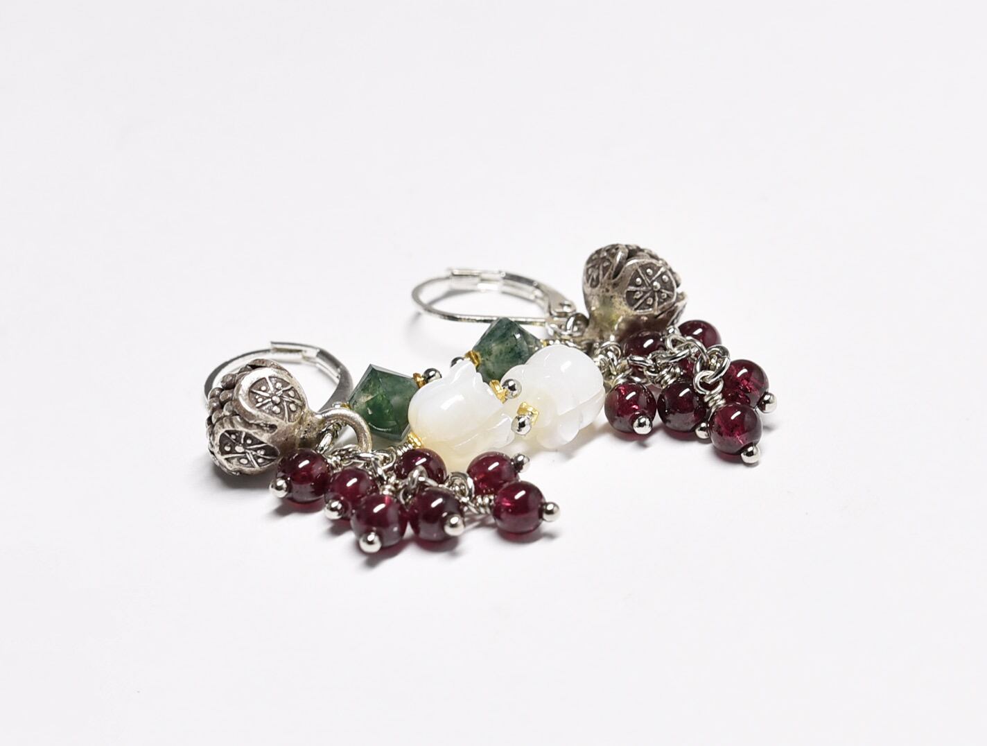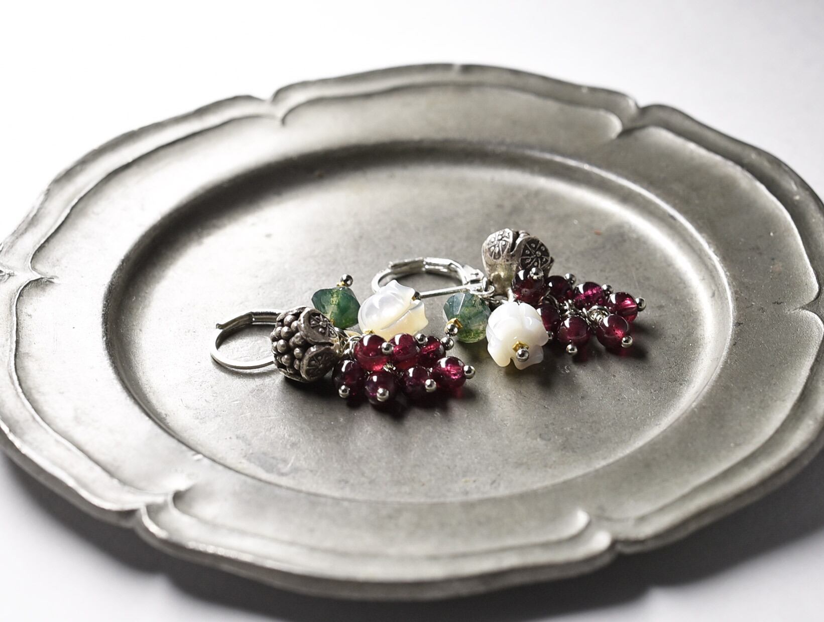 たわわなガーネットとモスアゲート、すずらんの形をしたシェル、丸いお花のカレンシルバーを繋いだピアスです。