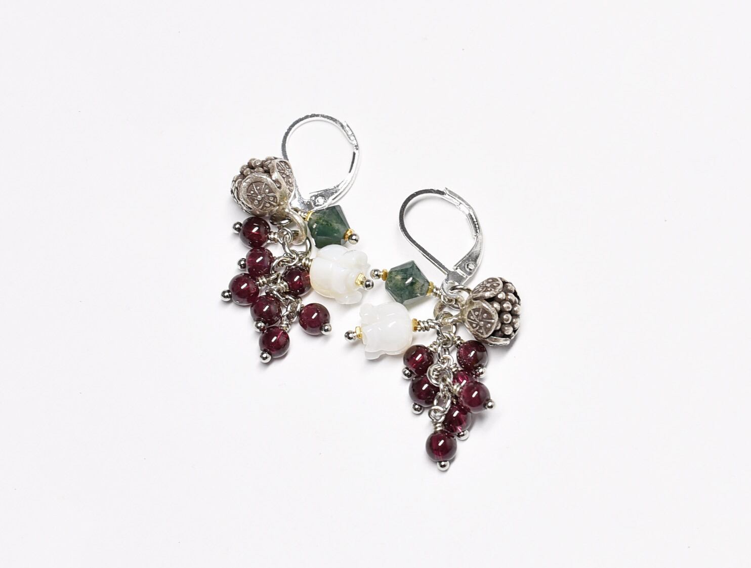たわわなガーネットとモスアゲート、白蝶貝のすずらん、コロンと丸いお花カレンシルバーのピアス(再販)