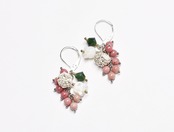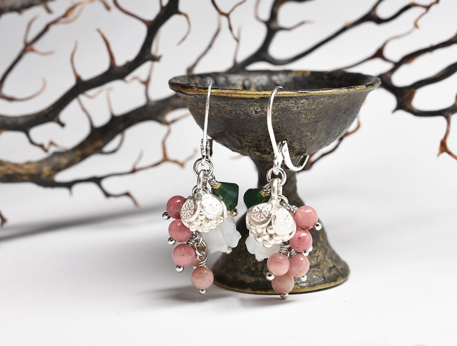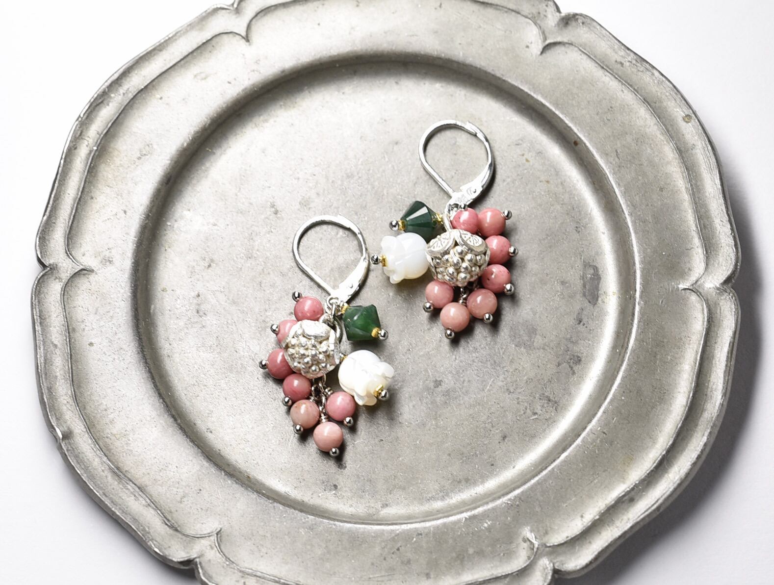 たわわなロードナイトとモスアゲート、すずらんの形をしたシェル、丸いお花のカレンシルバーを繋いだピアスです。