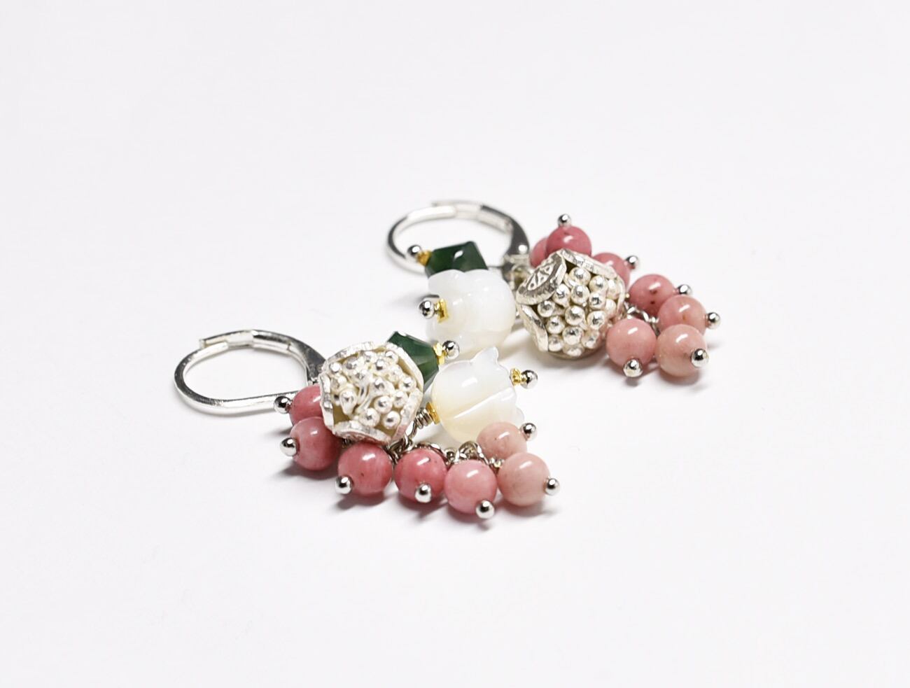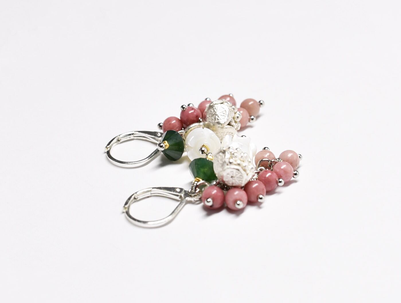 たわわなロードナイトとモスアゲート、白蝶貝のすすらん、コロンと丸いお花カレンシルバーのピアス