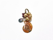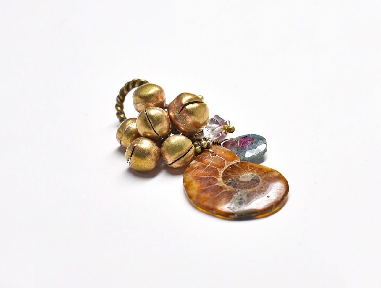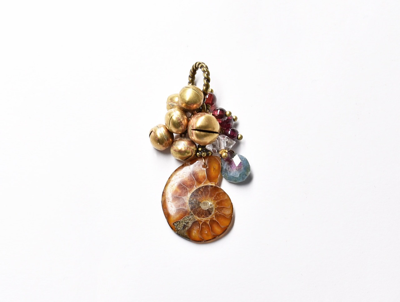 アンモナイトとたわわな鈴、ルビーインゾイサイト、ガーネットとハーキマーダイヤモンドを繋いだペンダントトップです。