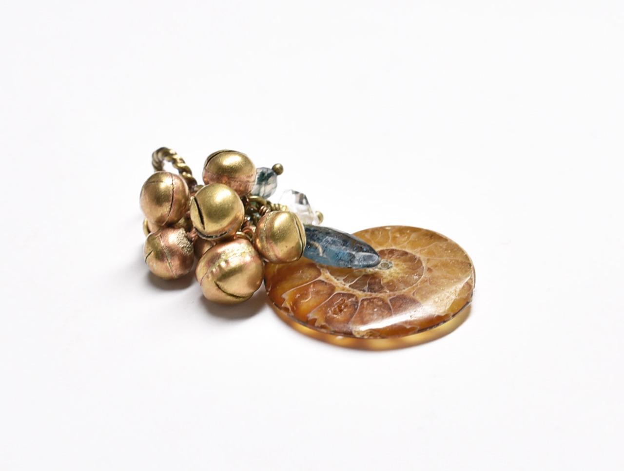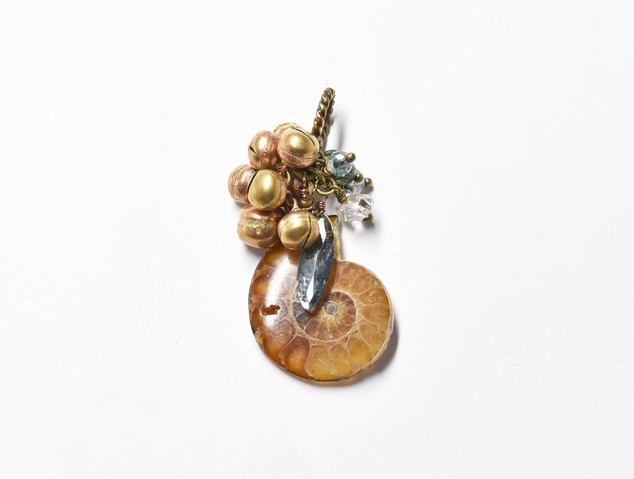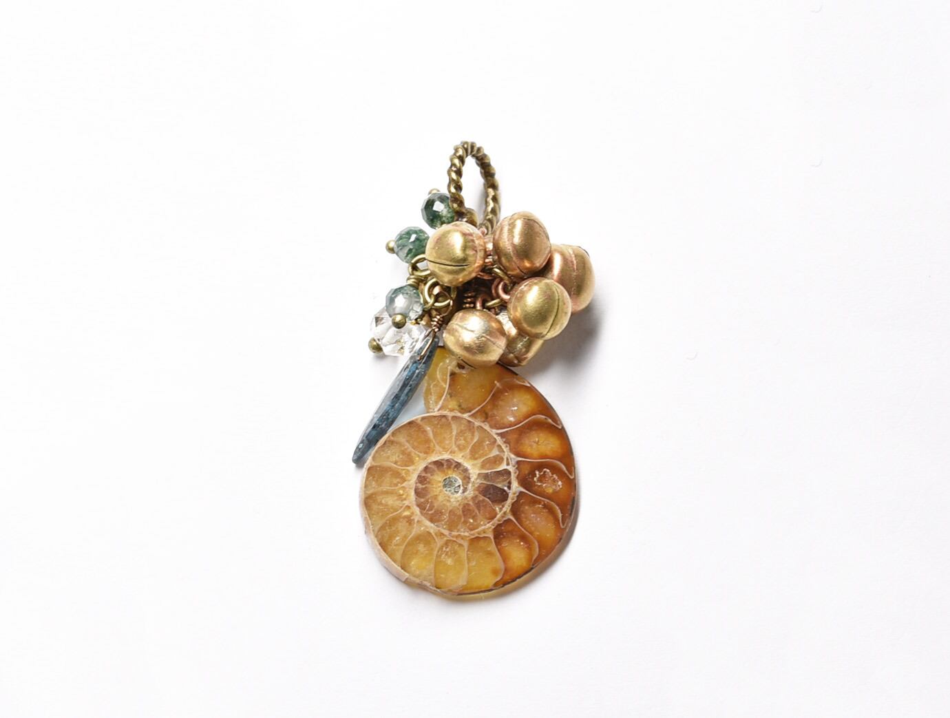 アンモナイトとたわわな鈴、ブルーグリーンカイヤナイト、モスアゲートとハーキマーダイヤモンドを繋いだペンダントトップです。