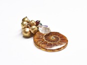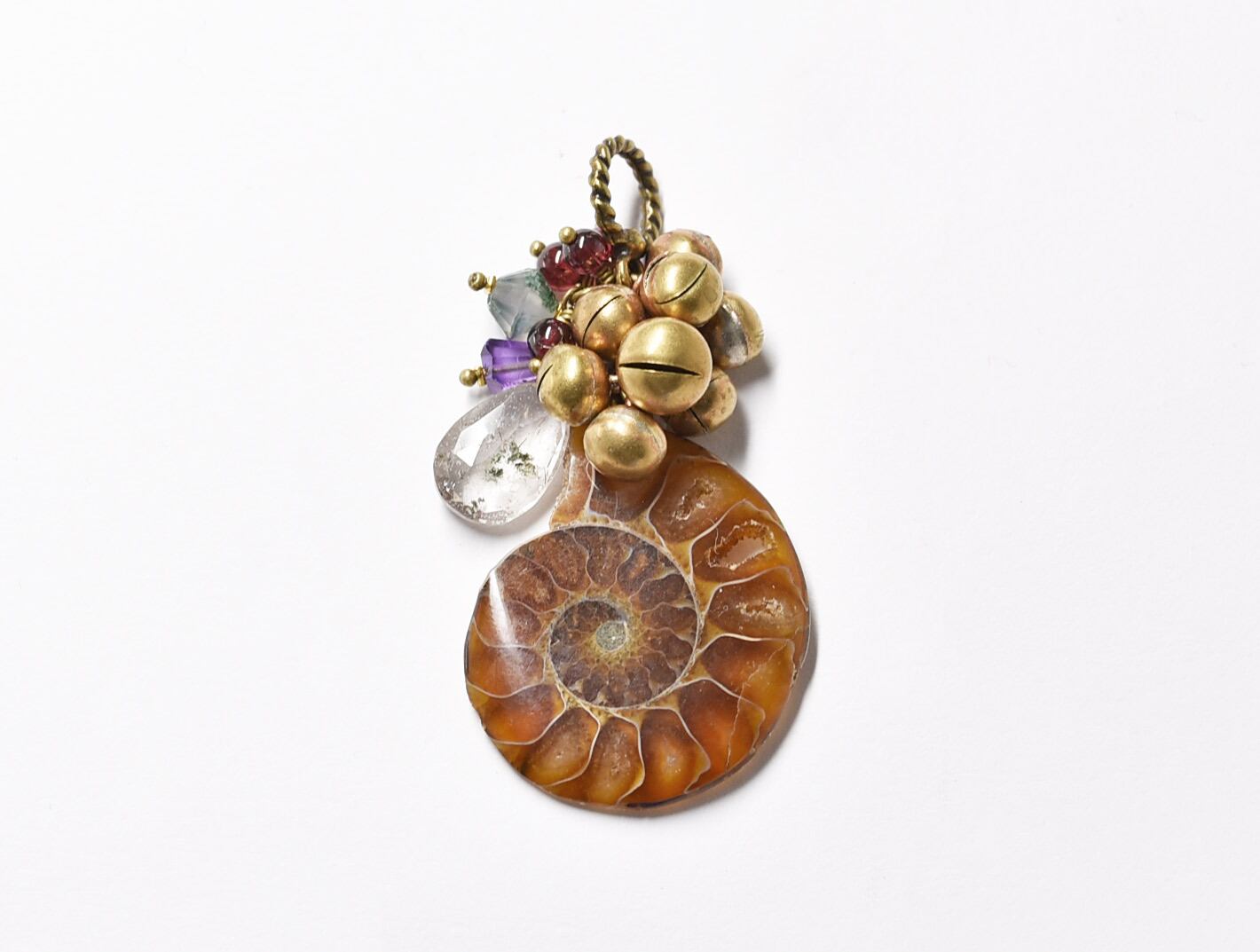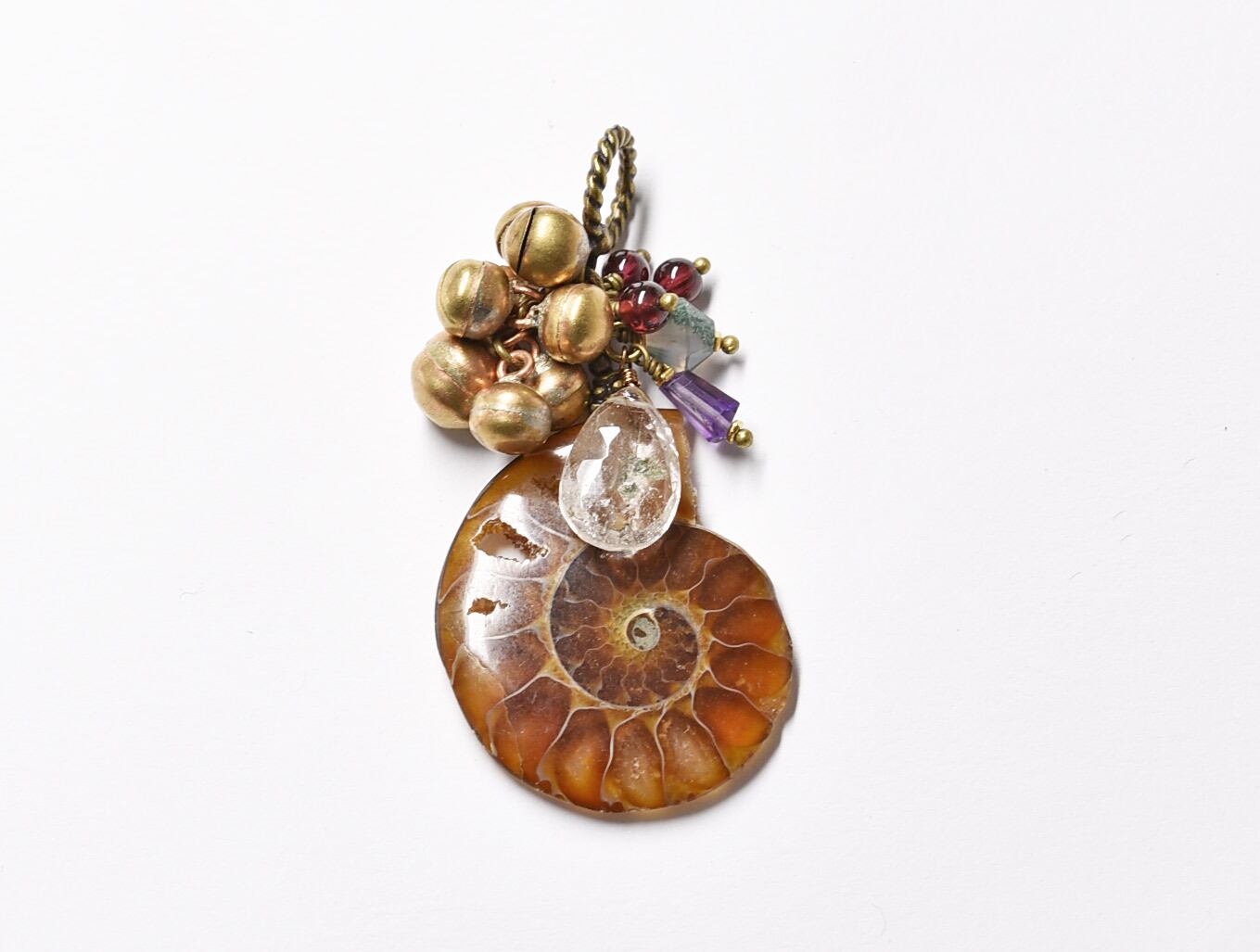 アンモナイトとたわわな鈴、ガーデンルチルクォーツ、アメジスト、モスアゲート、ガーネットを繋いだペンダントトップです。