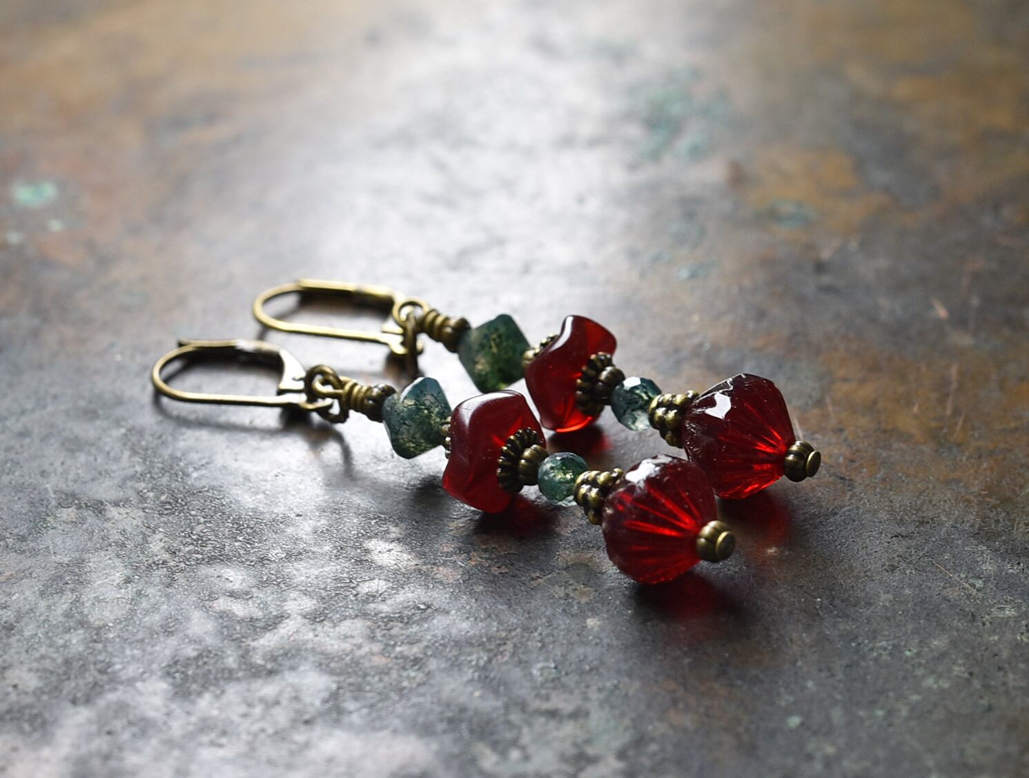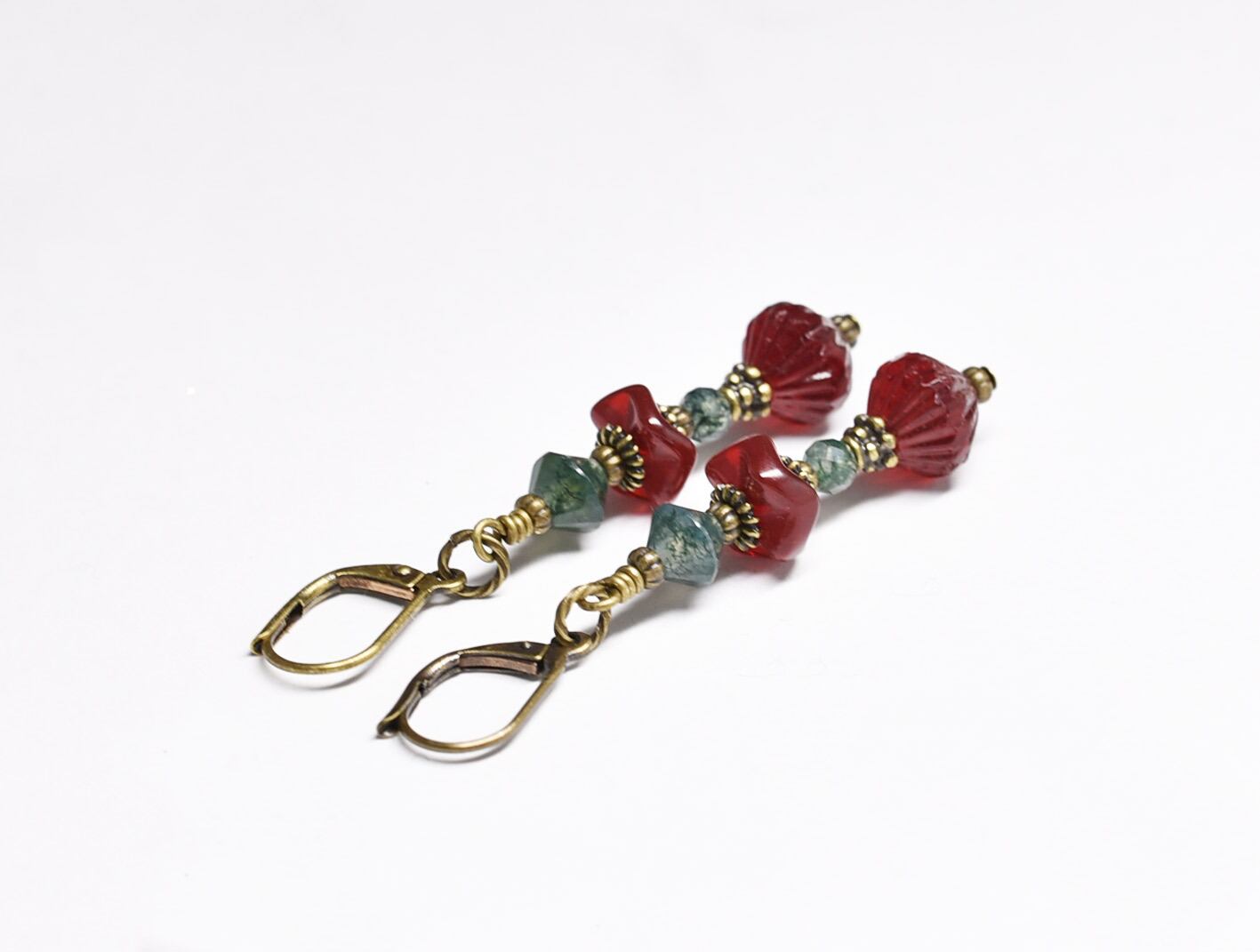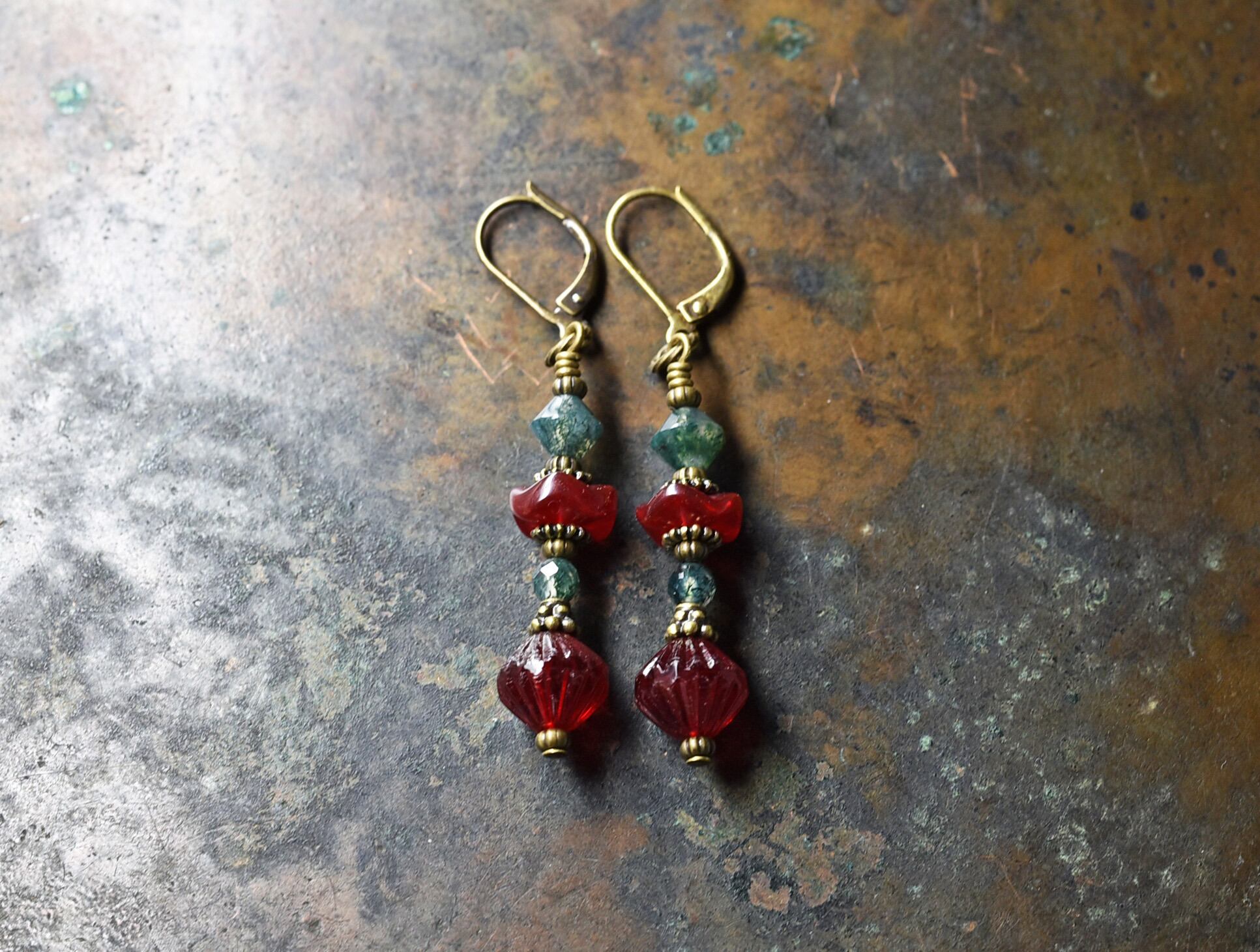真っ赤なヴィンテージビーズとモスアゲートのピアス