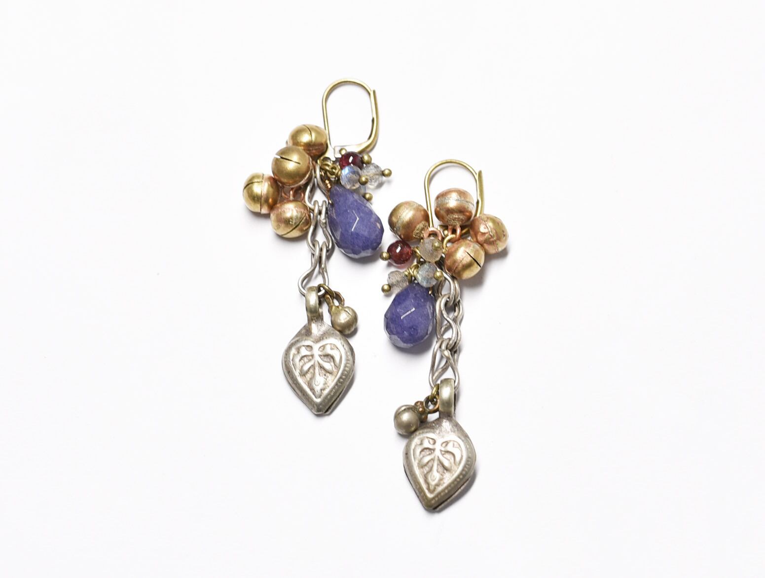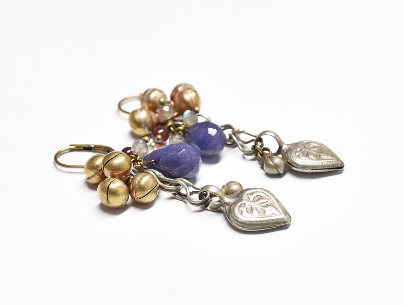 ハート民族メタルパーツと鈴、サファイアアゲート、ラブラドライトとガーネットのピアス