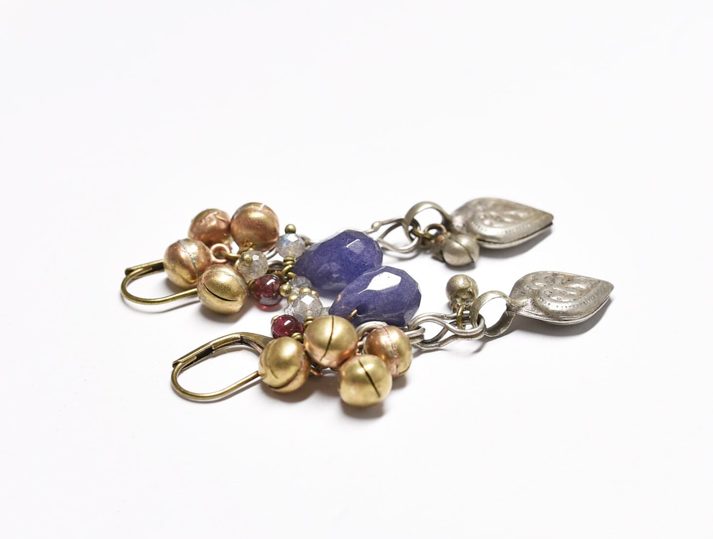民族のメタルパーツや鈴、サファイアゲート、ラブラドライト、ガーネットを繋いだ揺れるピアスです。