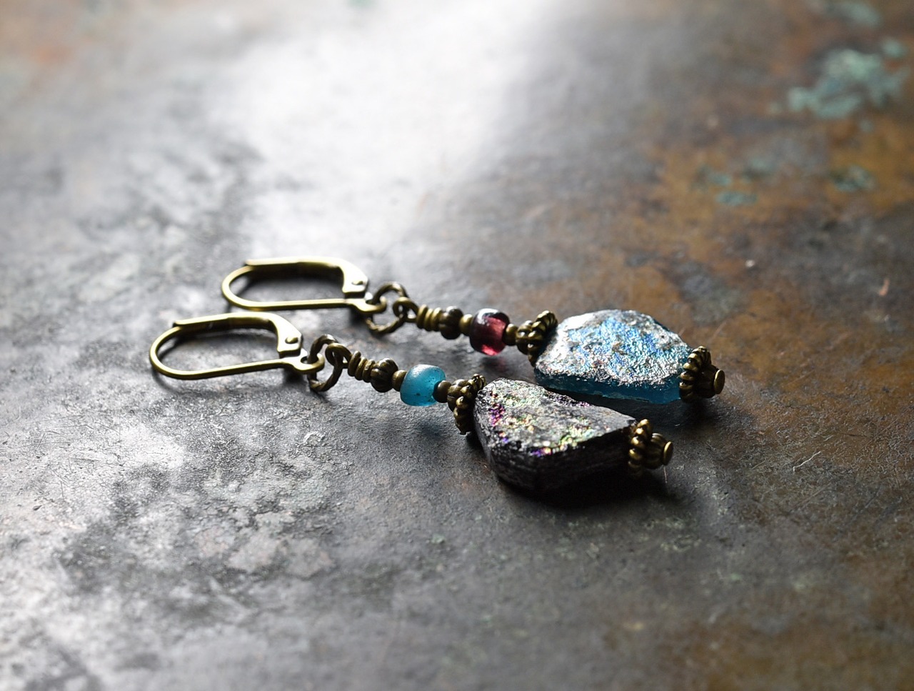 スカイブルー&パープル銀化ローマングラスのカラーアンシメトリーピアス