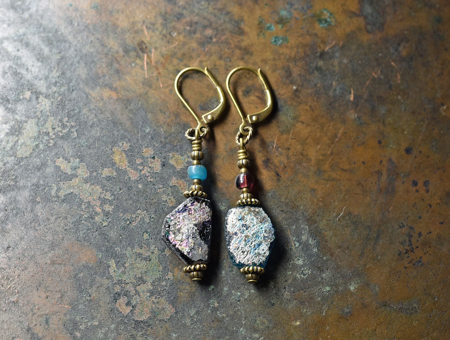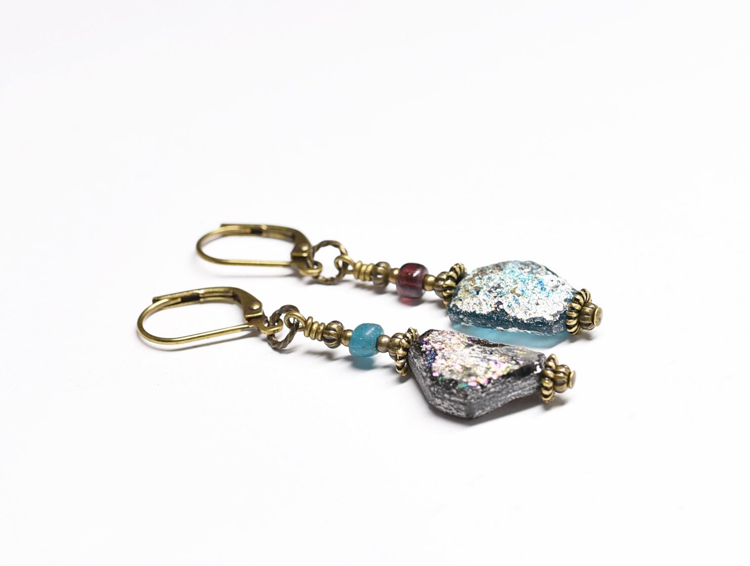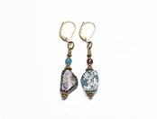 銀化したローマングラスと小さなアンティークビーズを繋いだカラーアンシメトリーなピアスです。