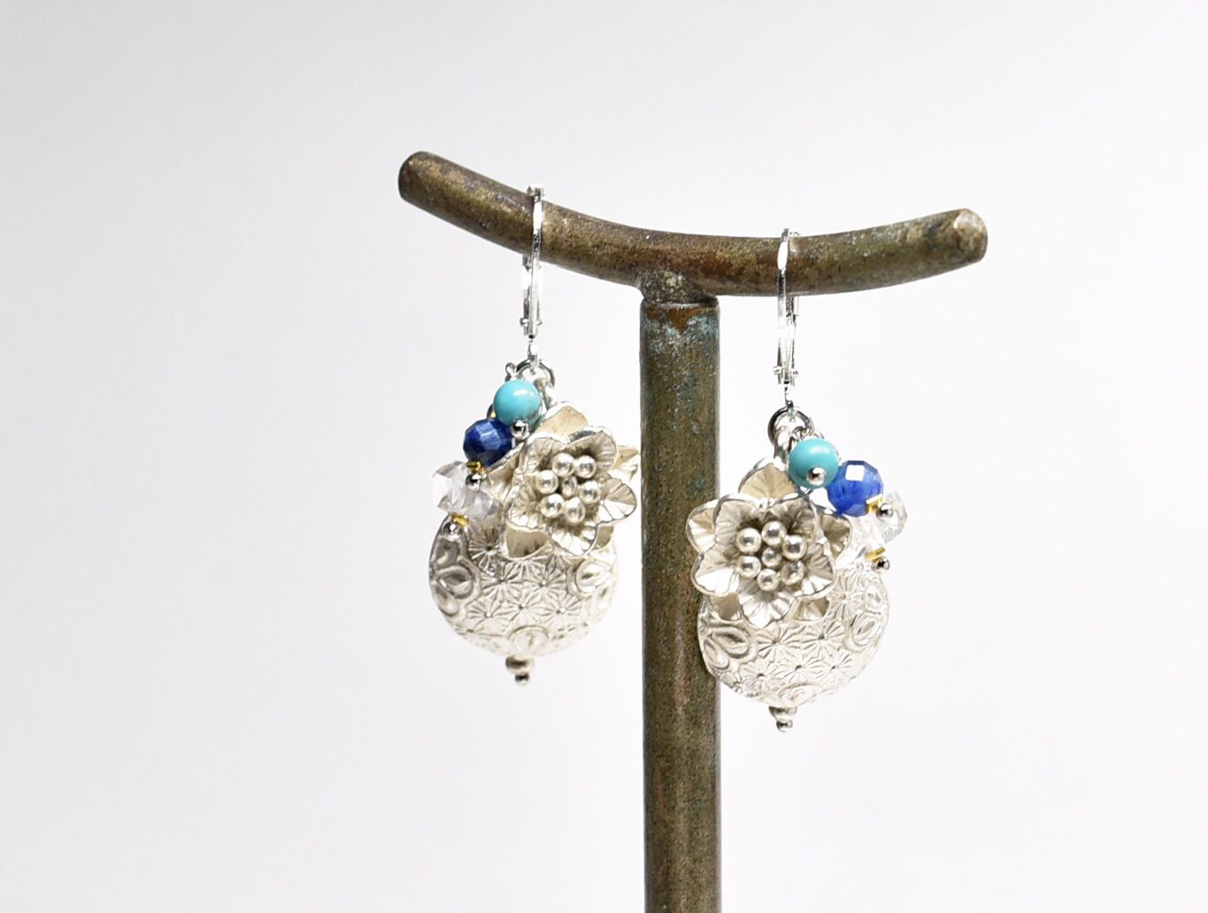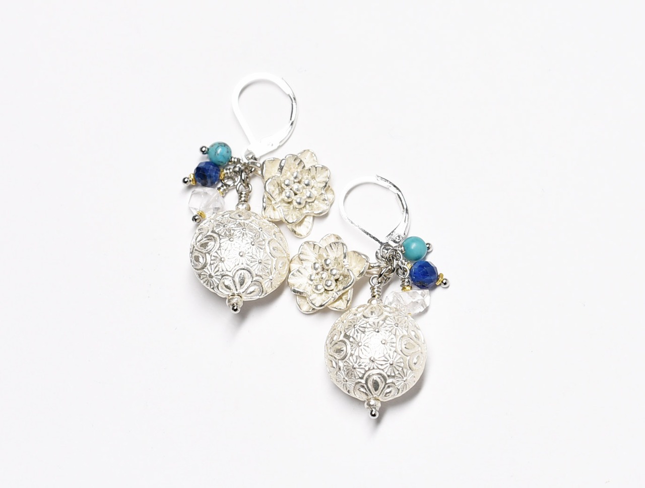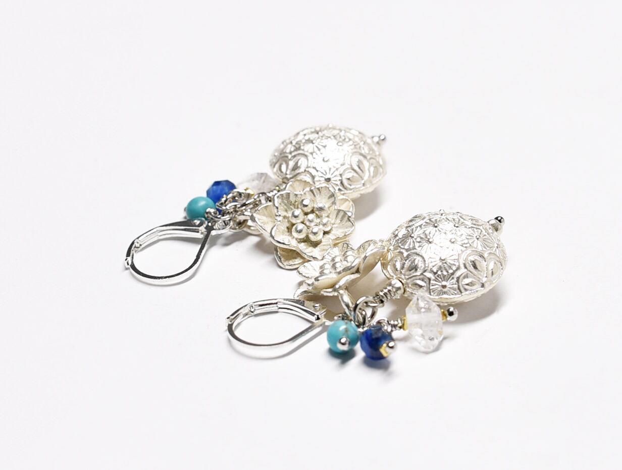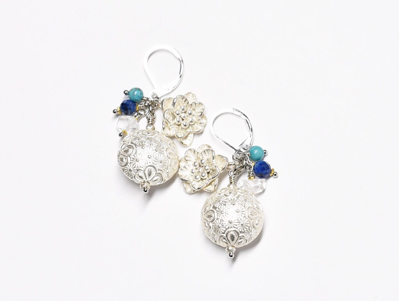 繊細模様のぷっくりカレンシルバーとお花、ハーキマーダイヤモンド、カイヤナイト、ターコイズのピアス
