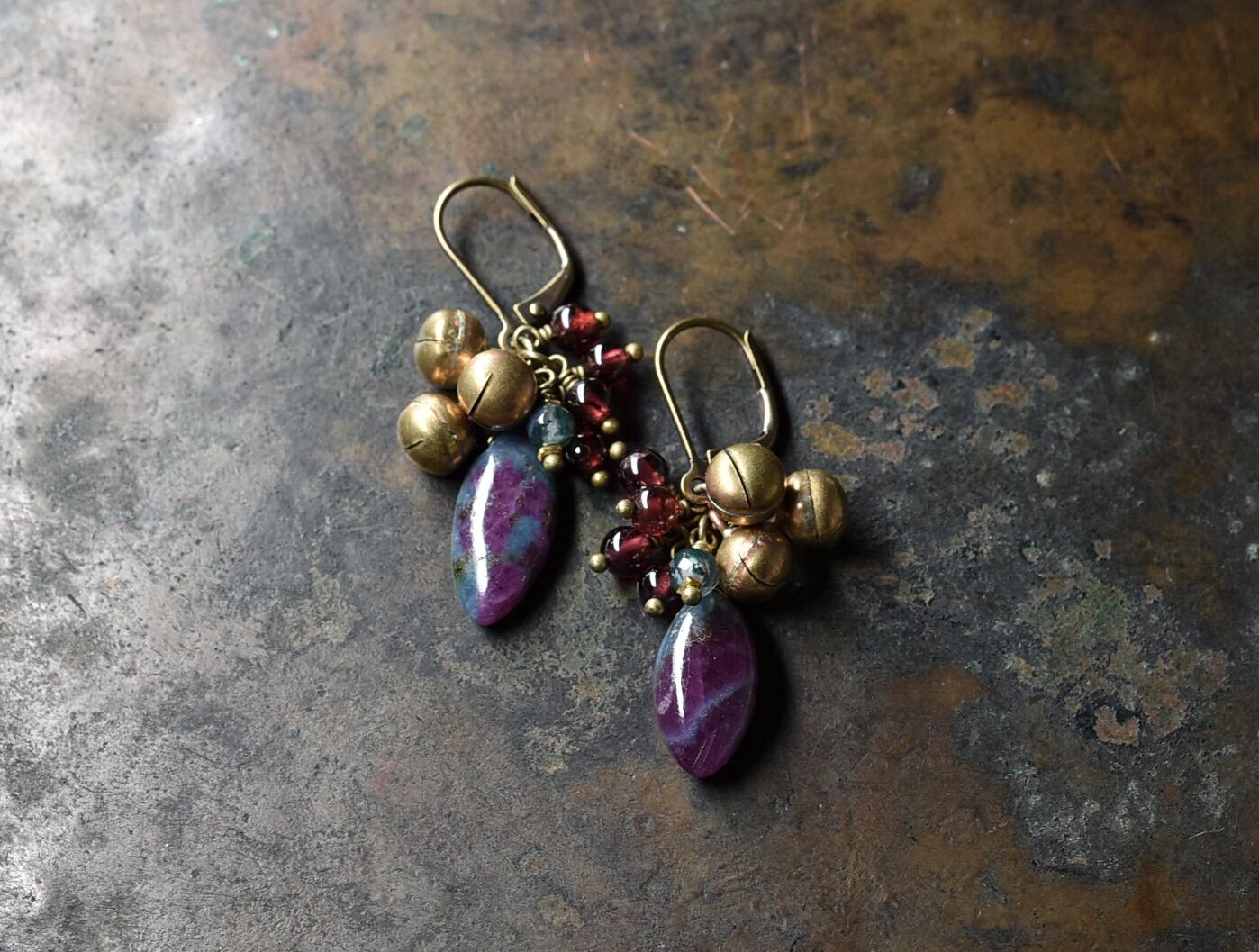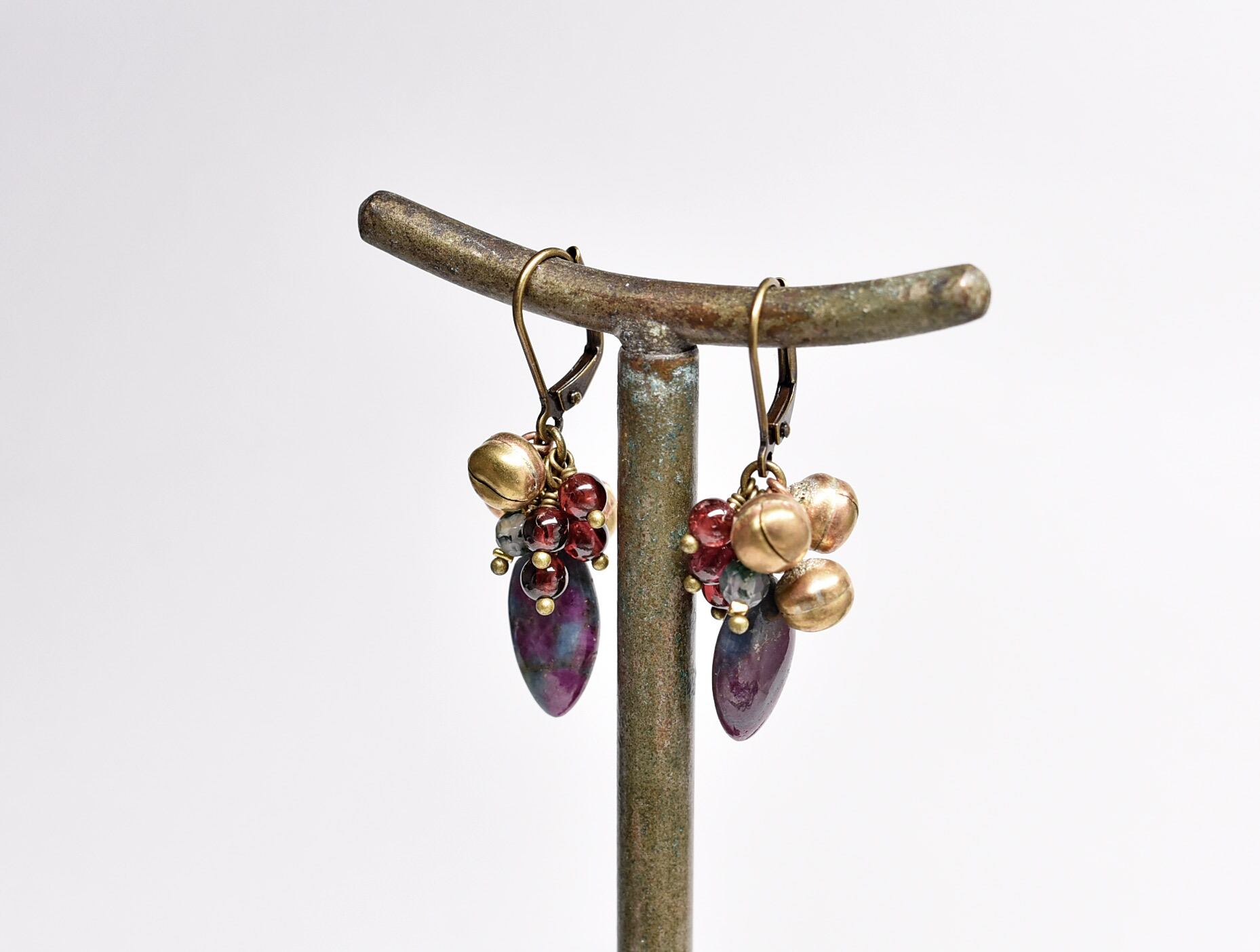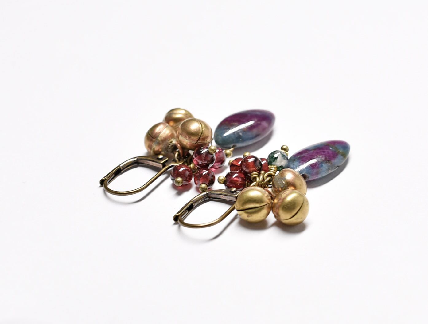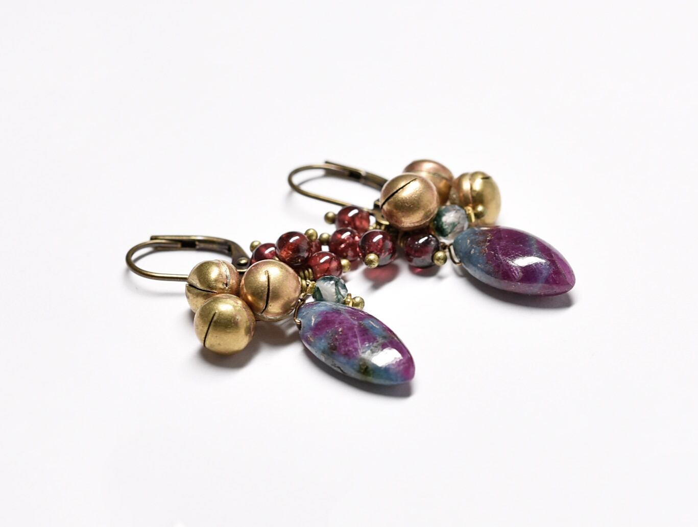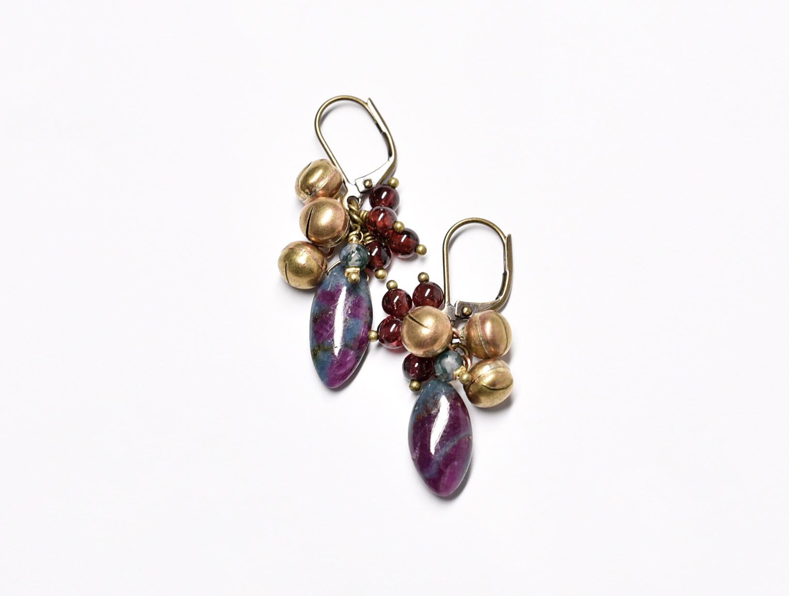 ルビーインゾイサイト、たわわな鈴とガーネット、モスアゲートを繋いだピアスです。