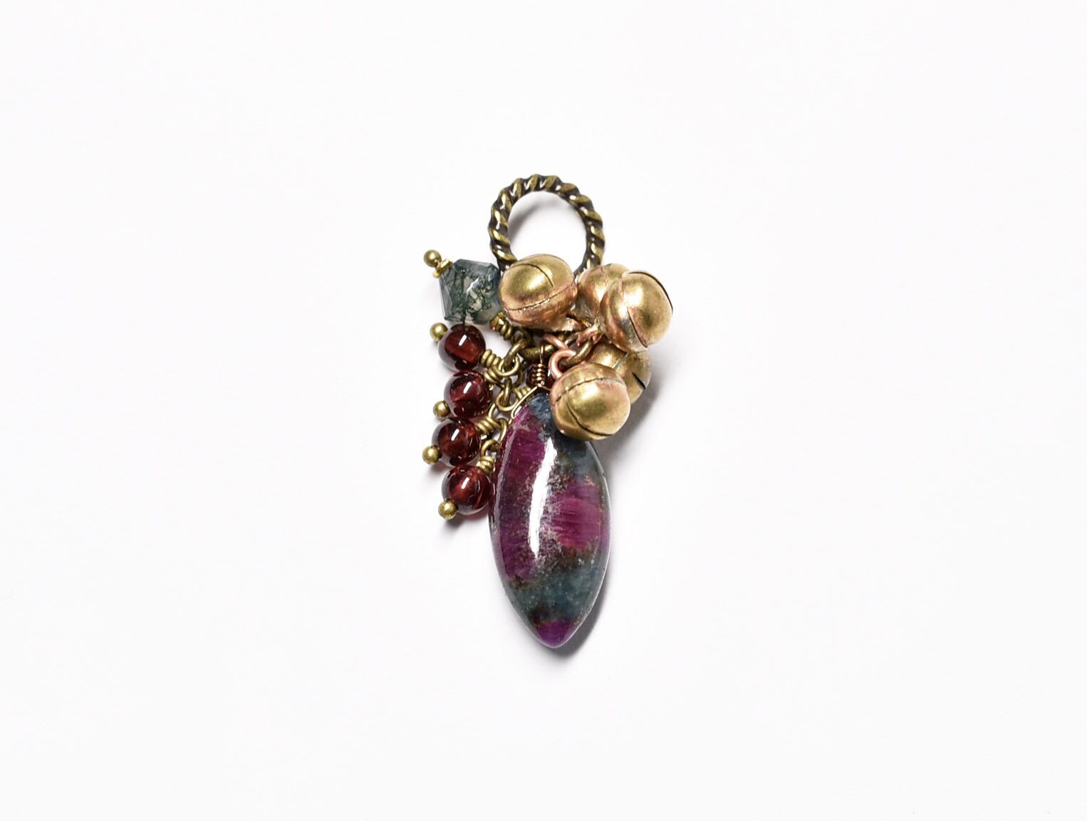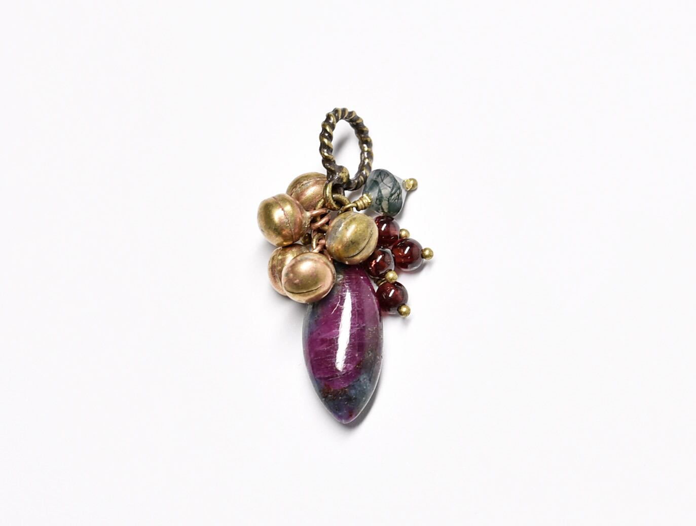 ルビーインゾイサイト、たわわな鈴とガーネット、モスアゲートを繋いだペンダントトップです。