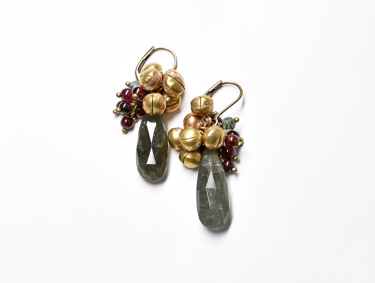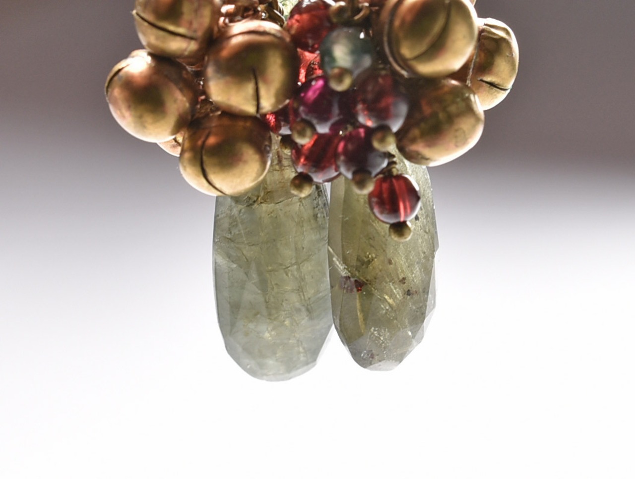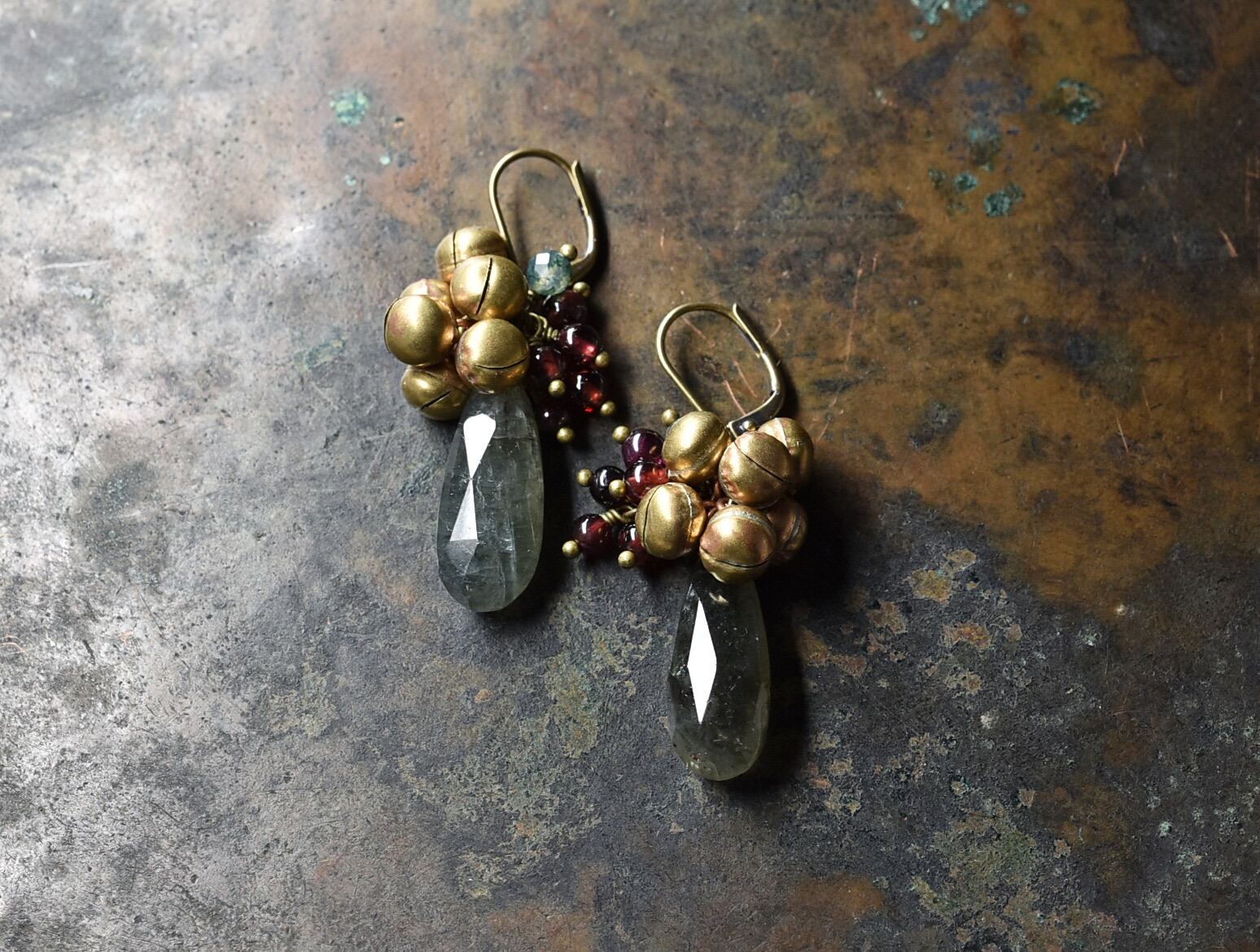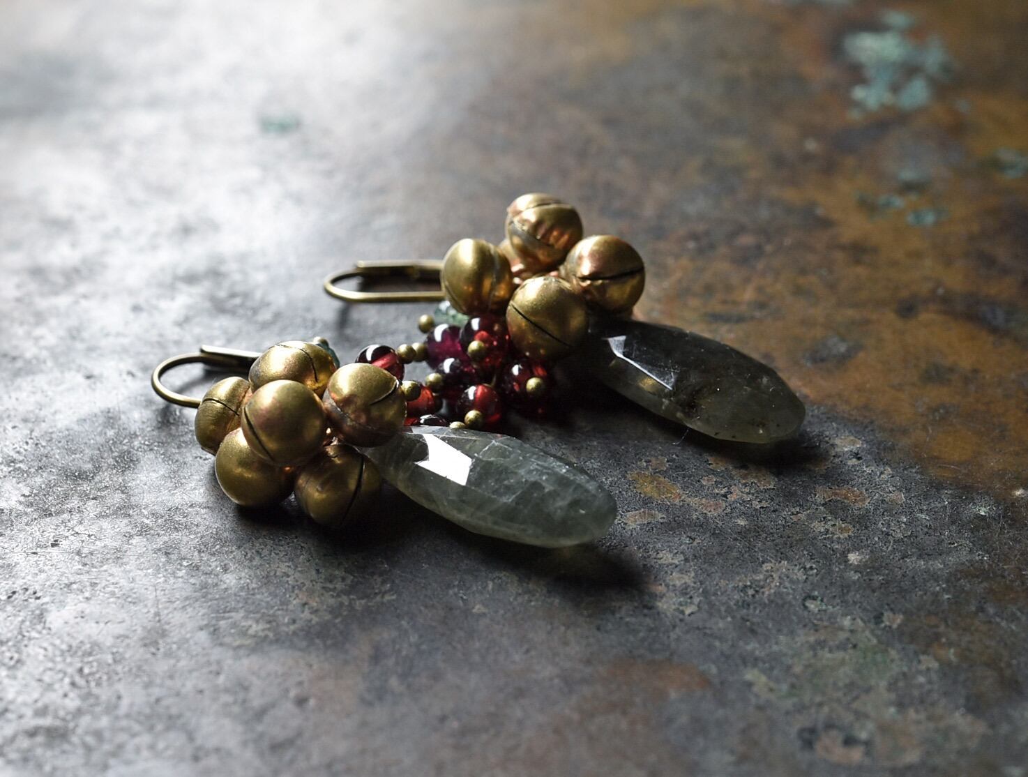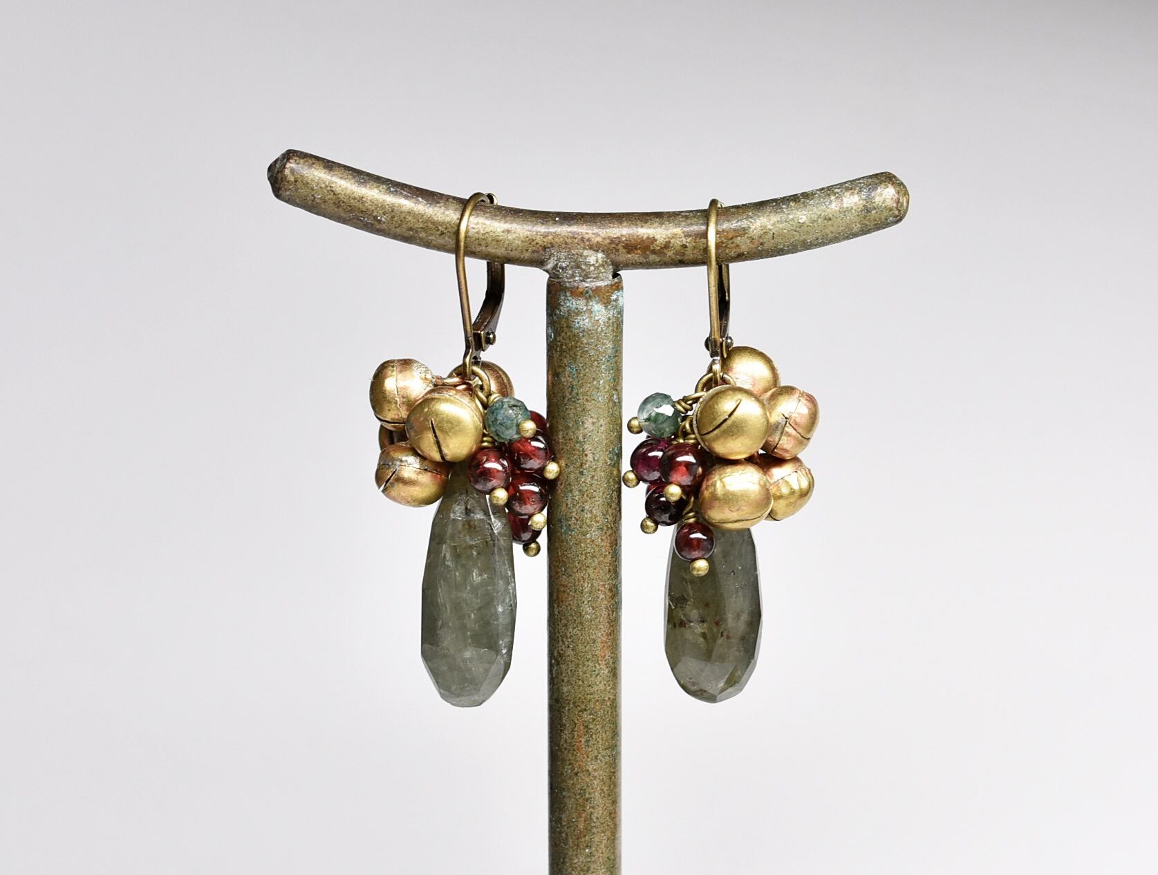 ガーデンクォーツ、たわわな鈴とガーネット、モスアゲートを繋いだピアスです。