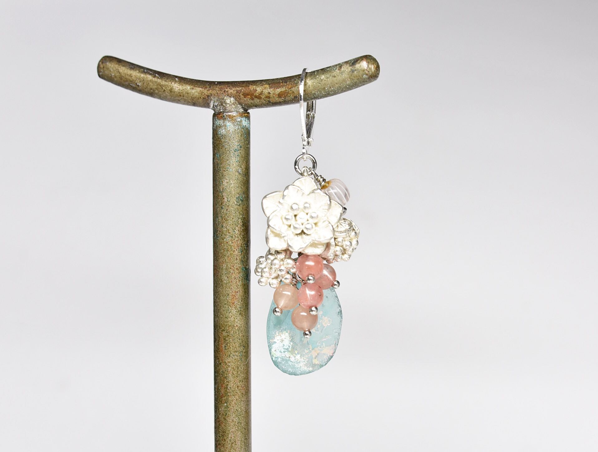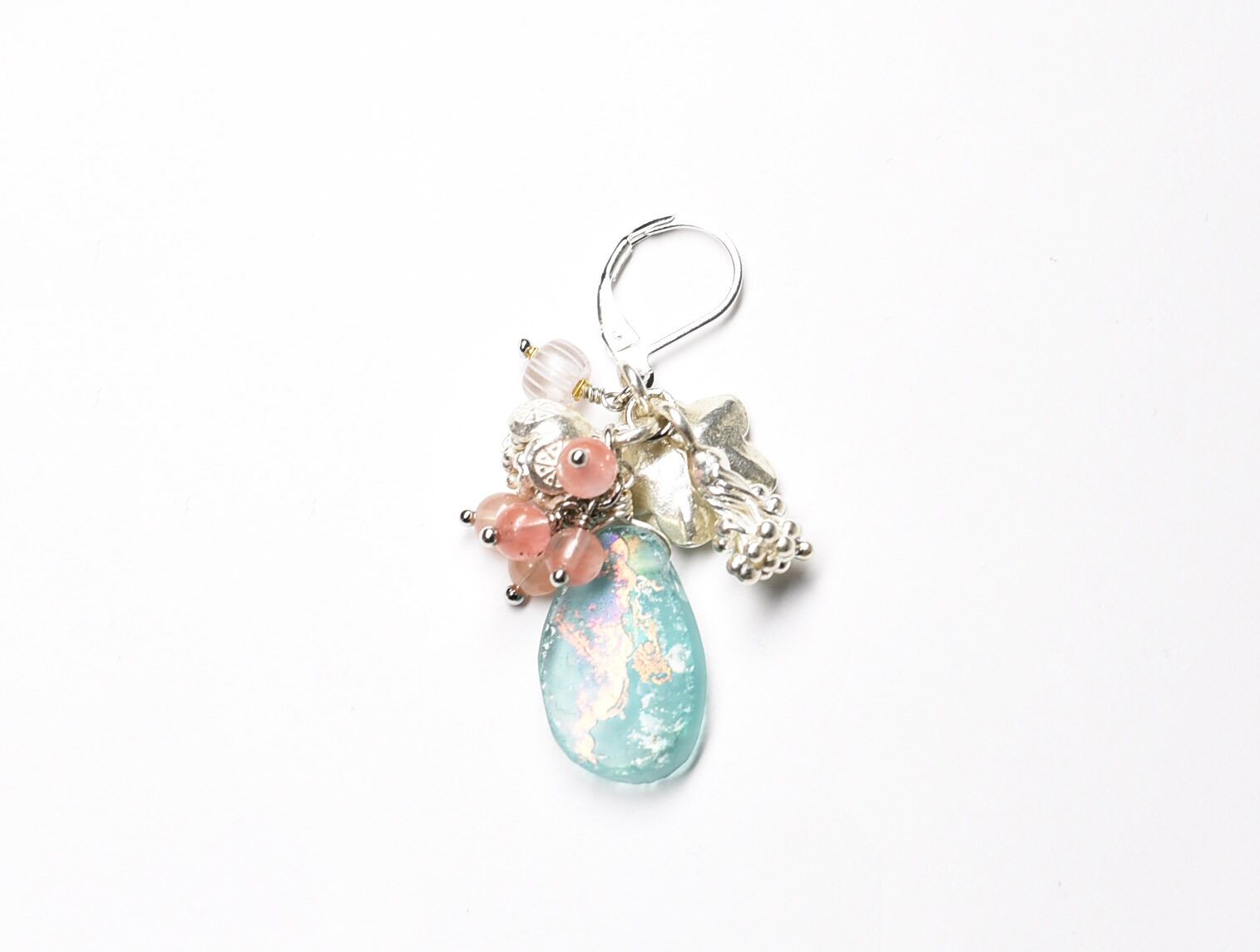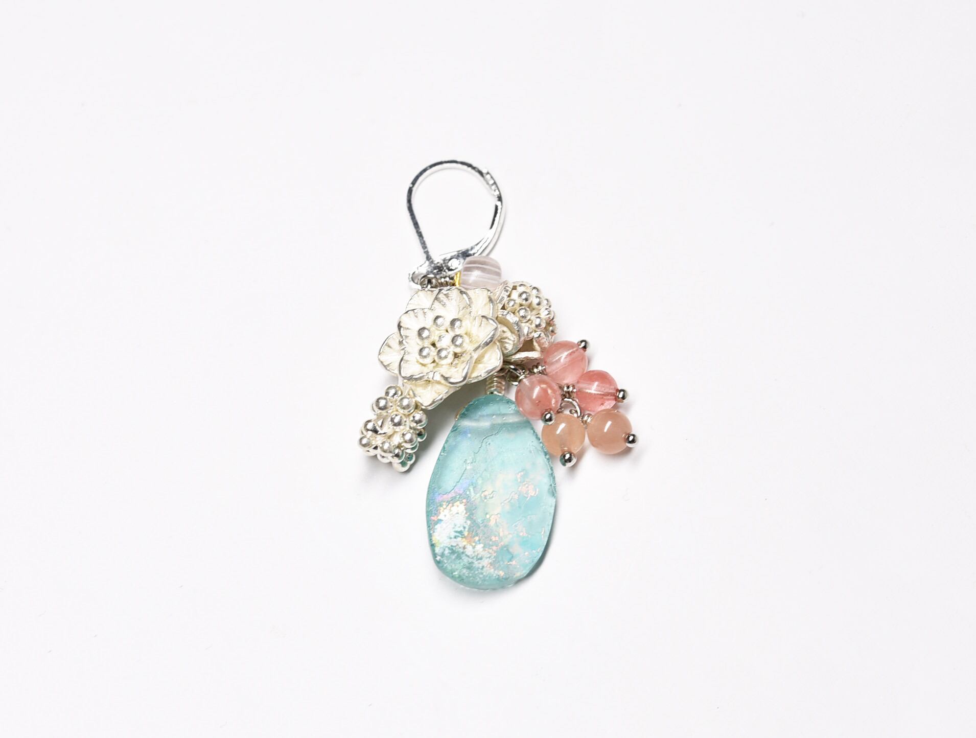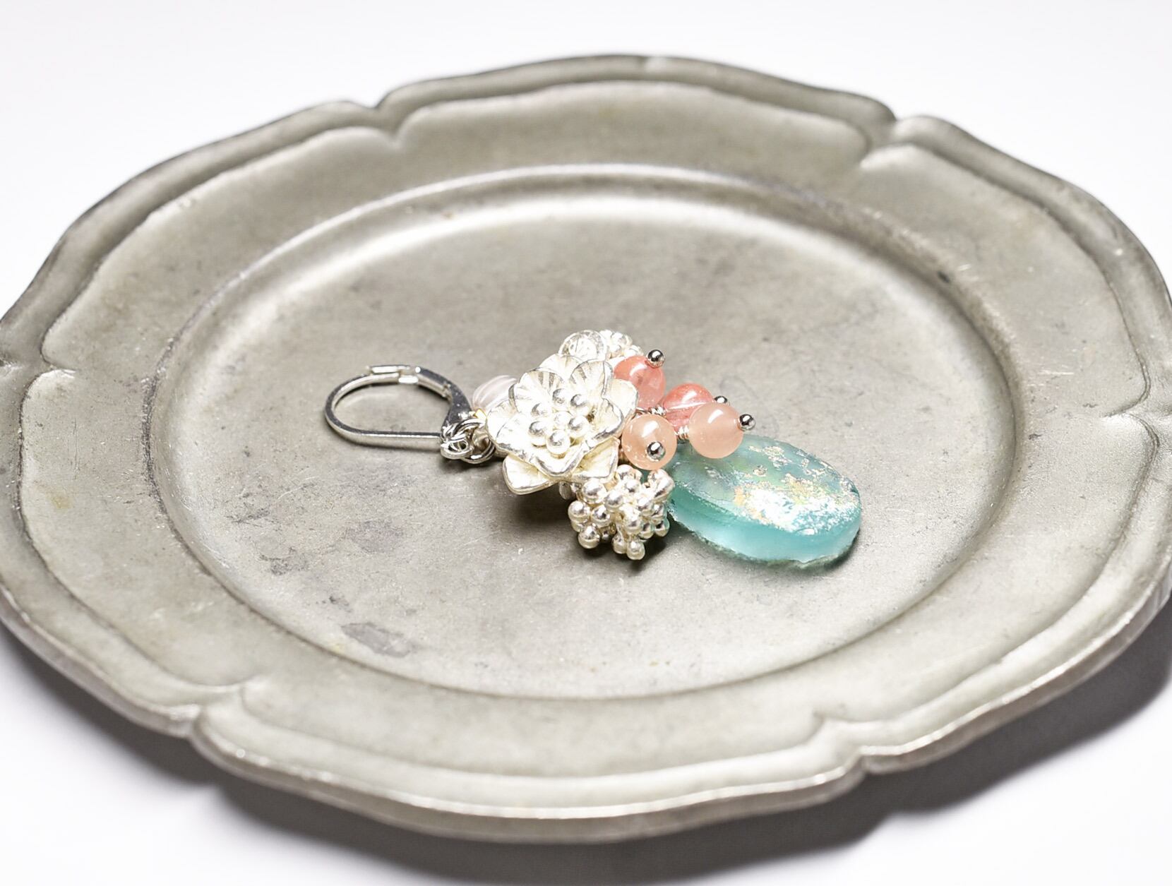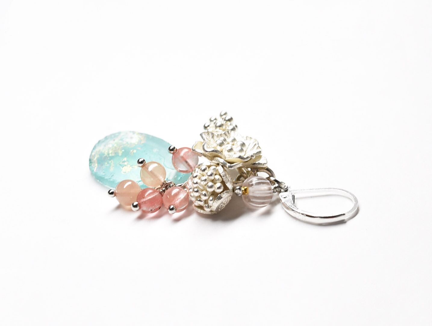 アクアブルー銀化ローマングラスと花と蕾カレンシルバー、グーズベリー、桜色ストーンビーズの片耳ピアス