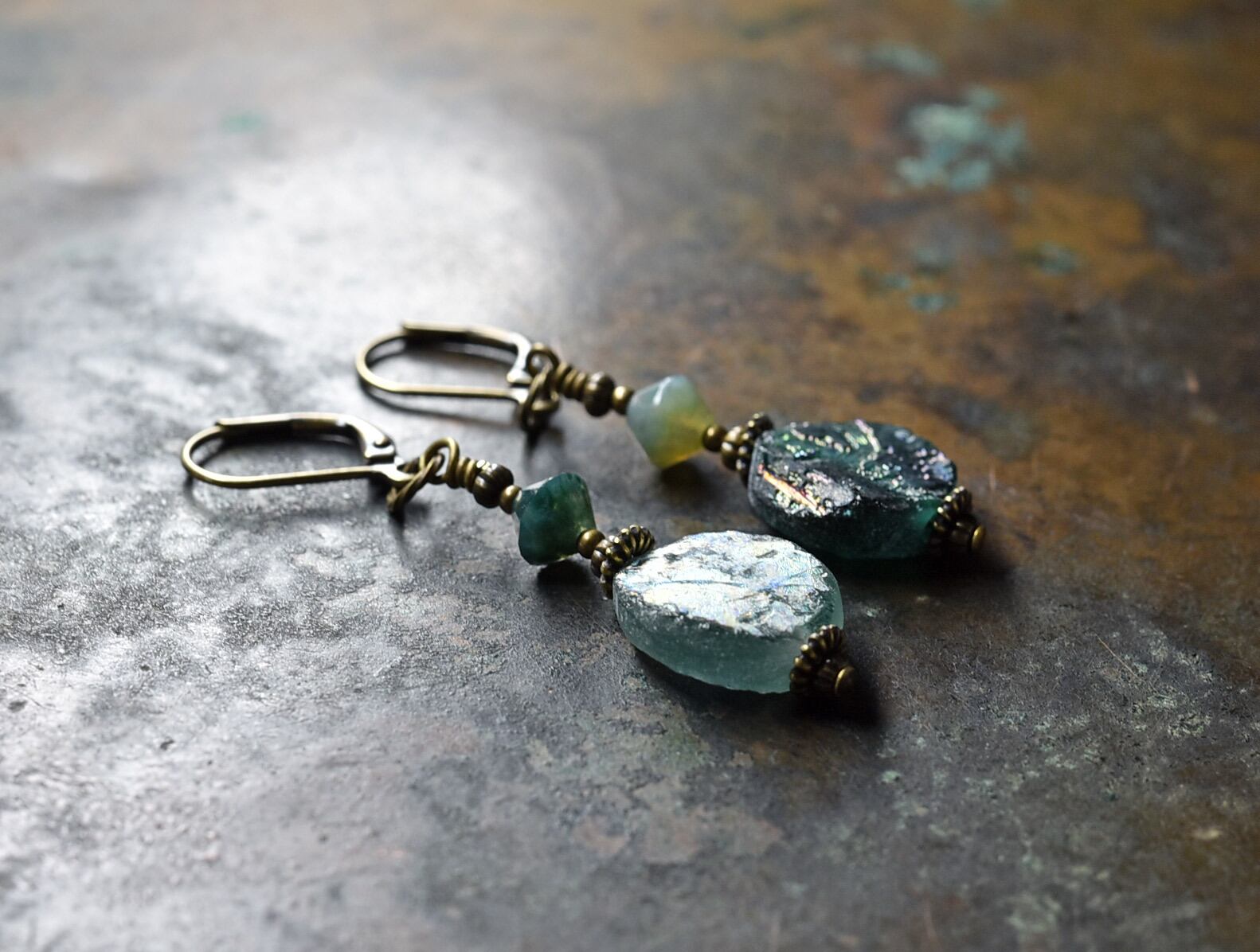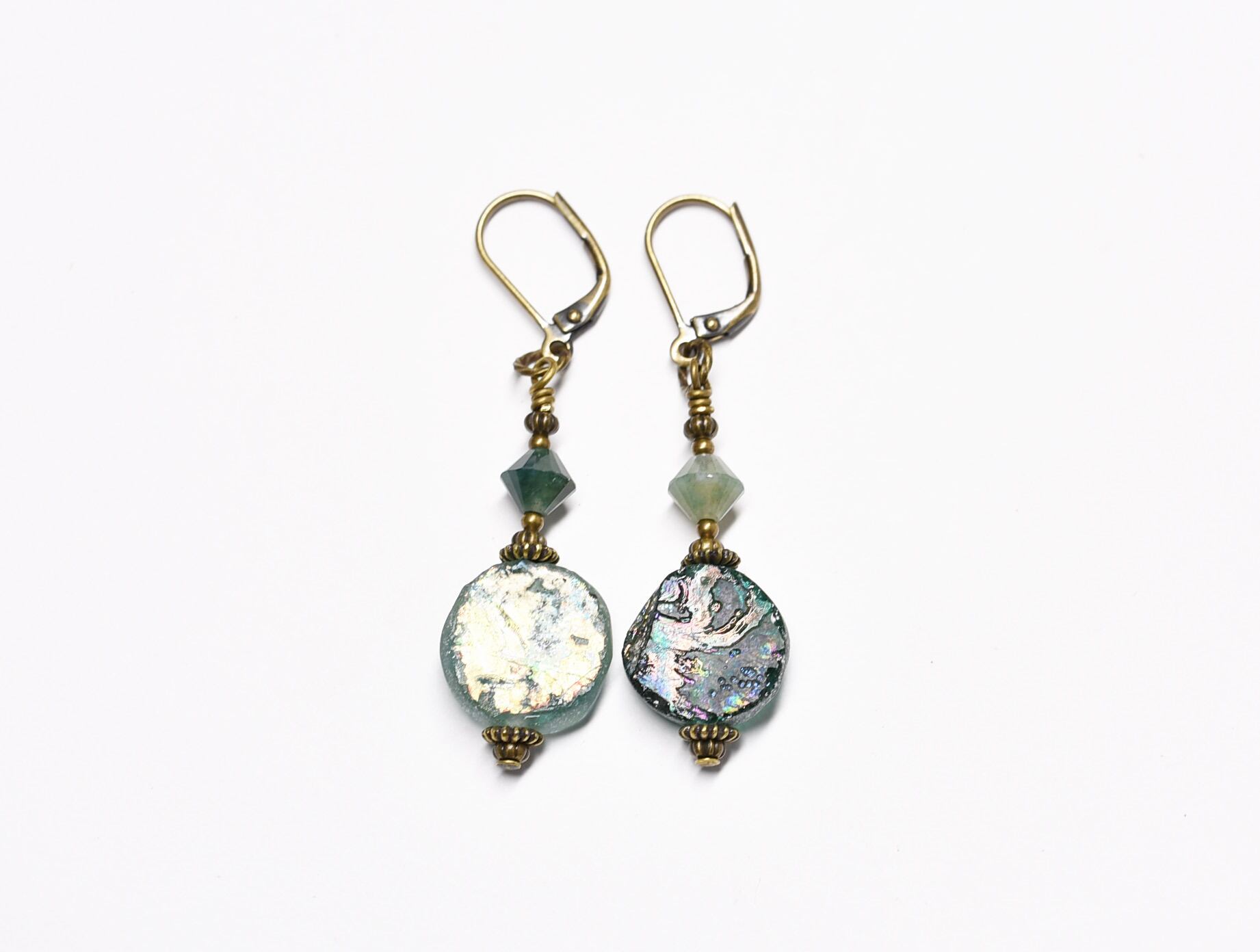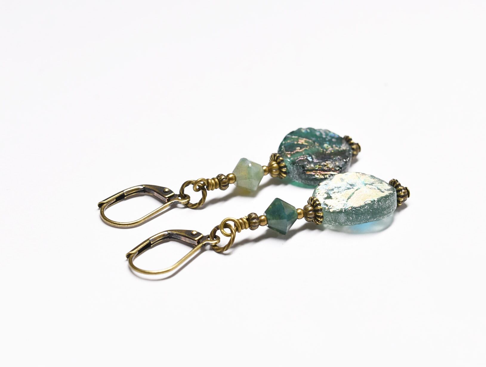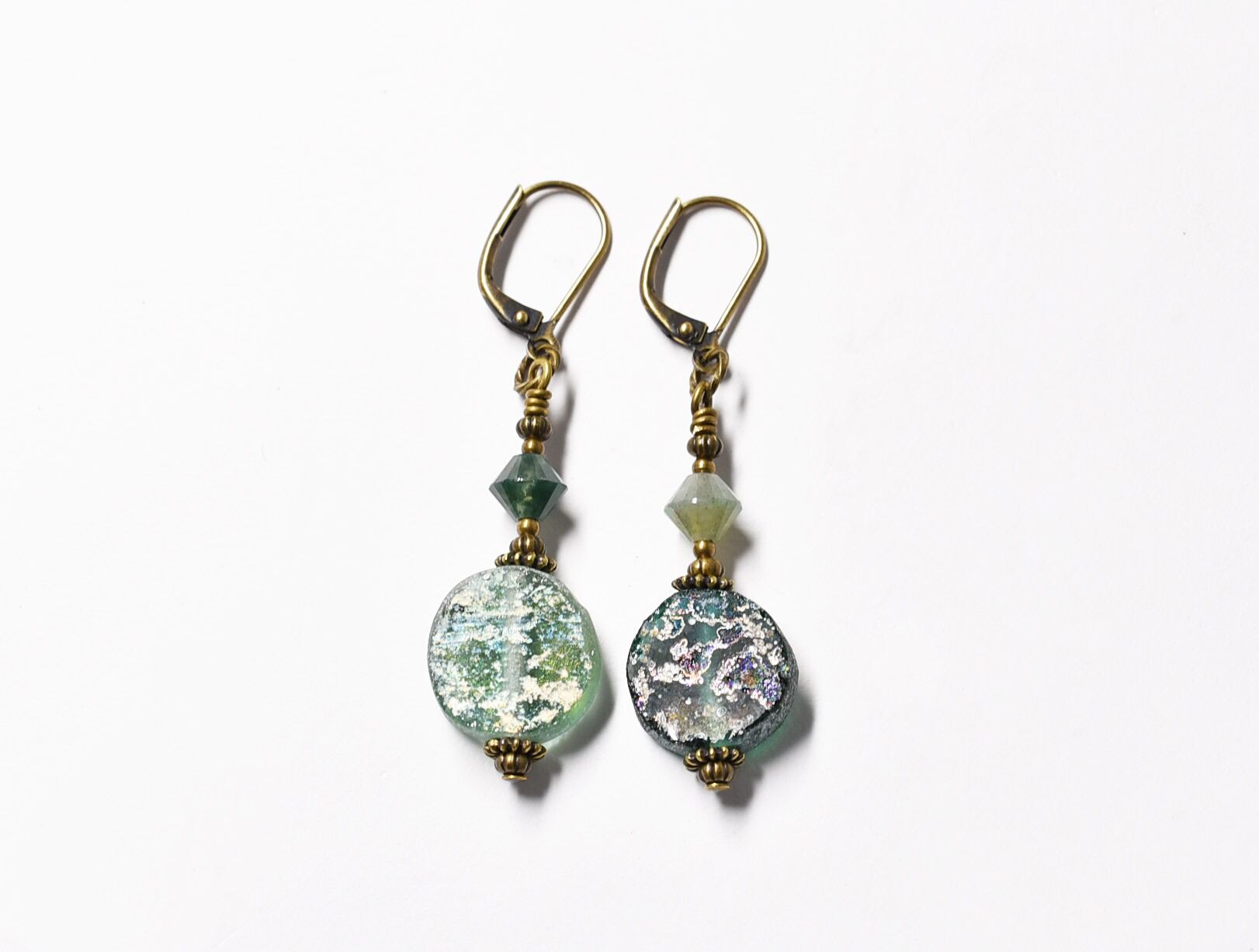 銀化したローマングラスとモスアゲートを繋いだカラーアンシメトリーなピアスです。