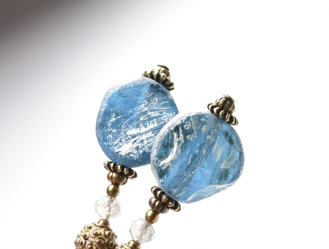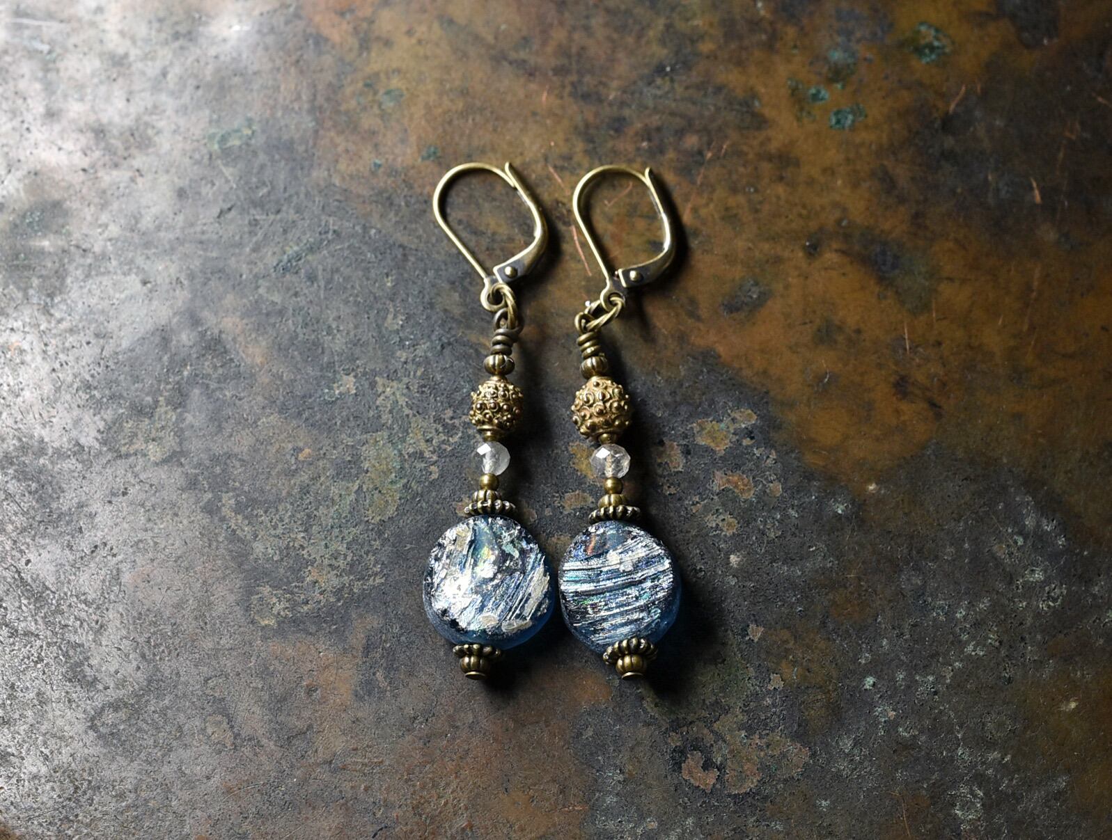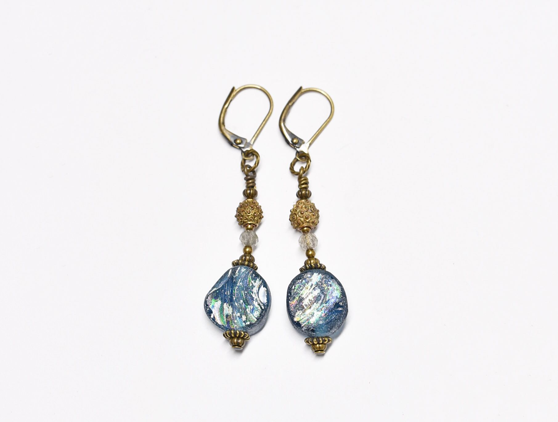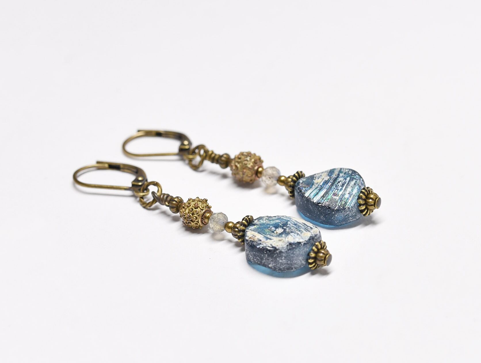 空色銀化ローマングラスとつぶつぶ民族ブラス、ラブラドライトのピアス