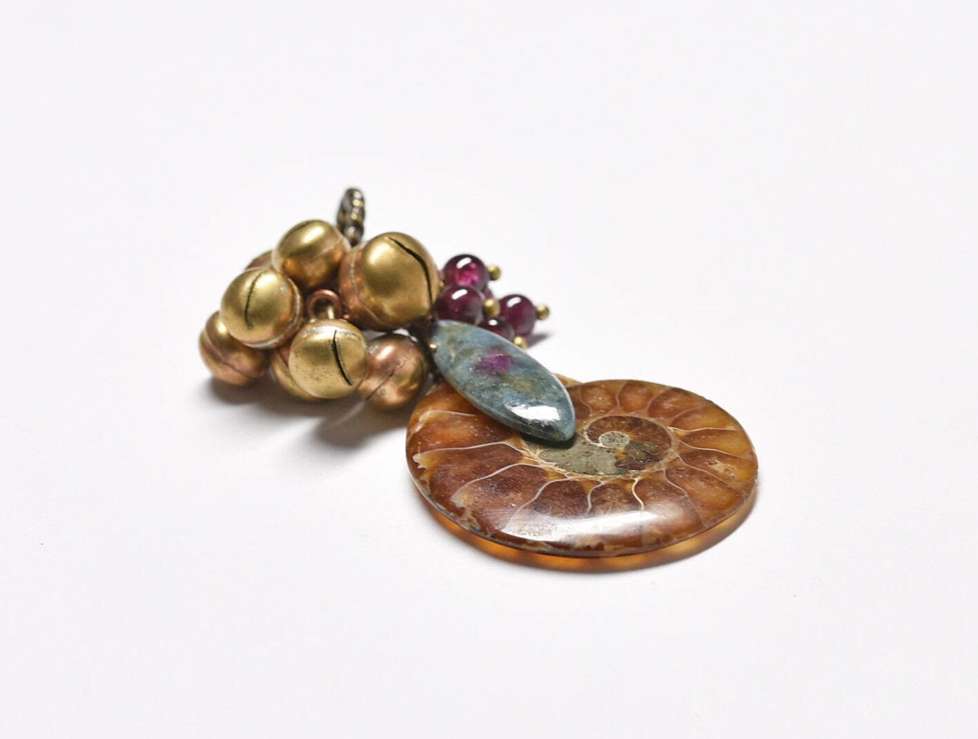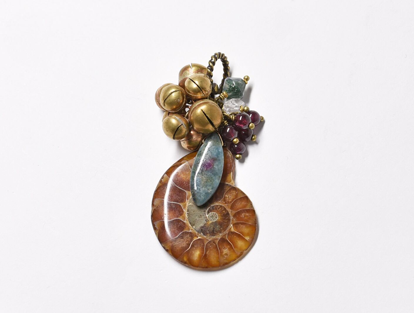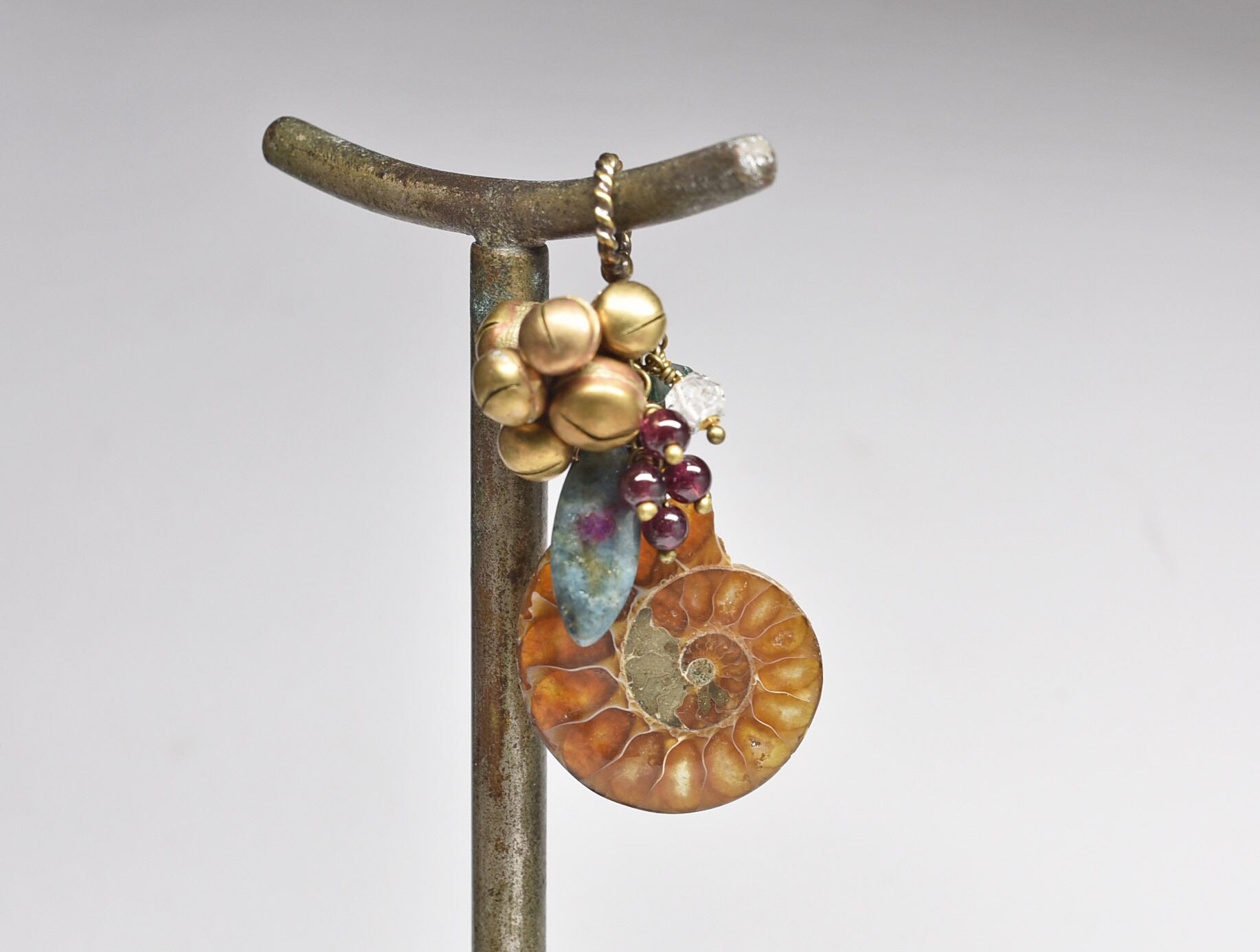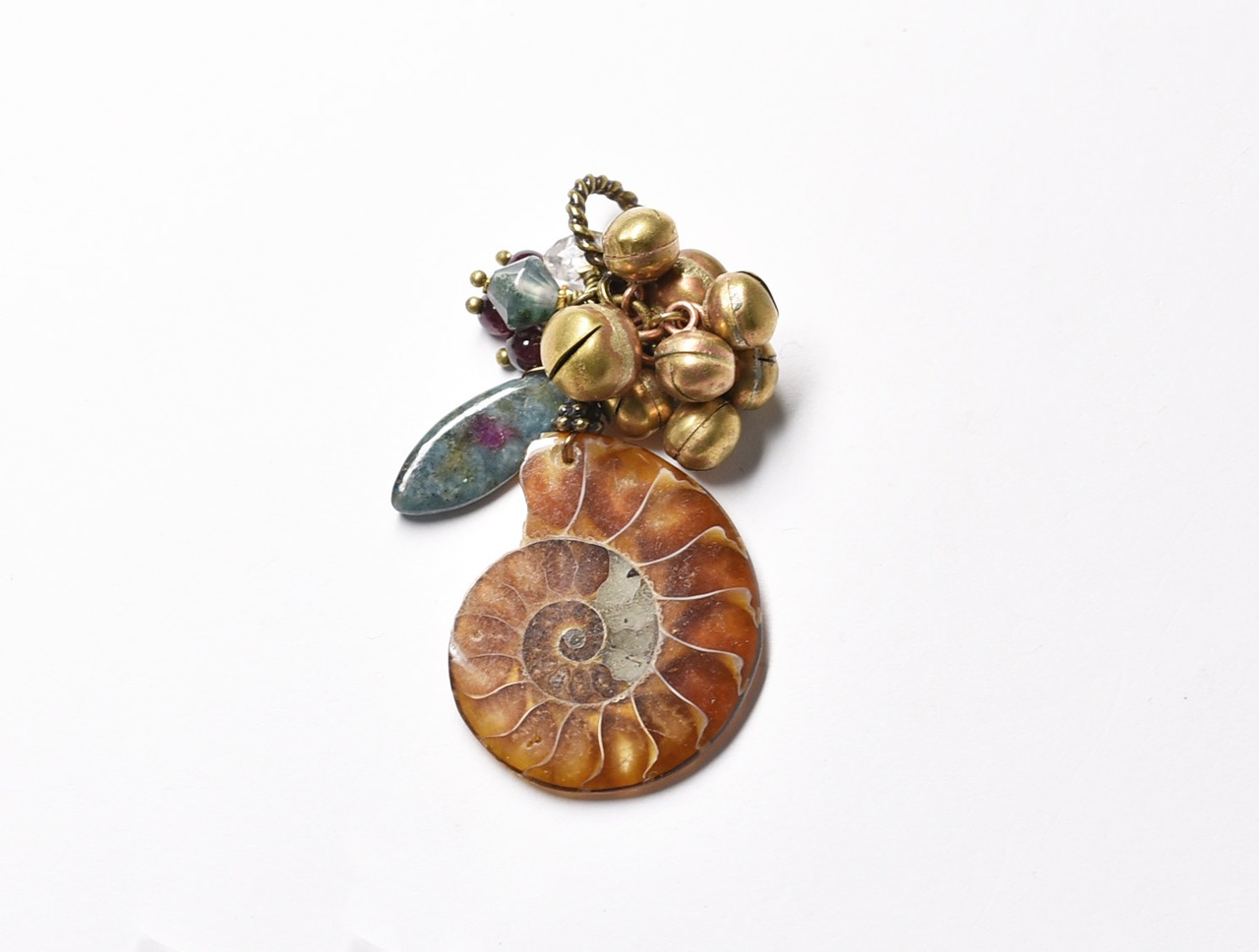 アンモナイトとたわわな鈴、ルビーインゾイサイト、ガーネットとハーキマーダイヤモンド、モスアゲートを繋いだペンダントトップです。