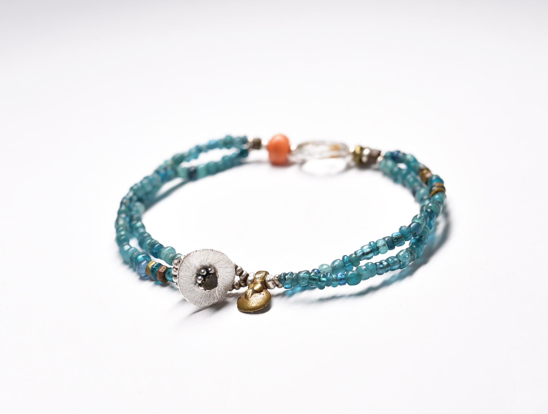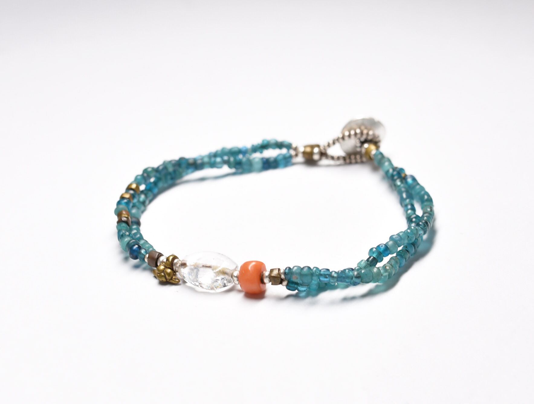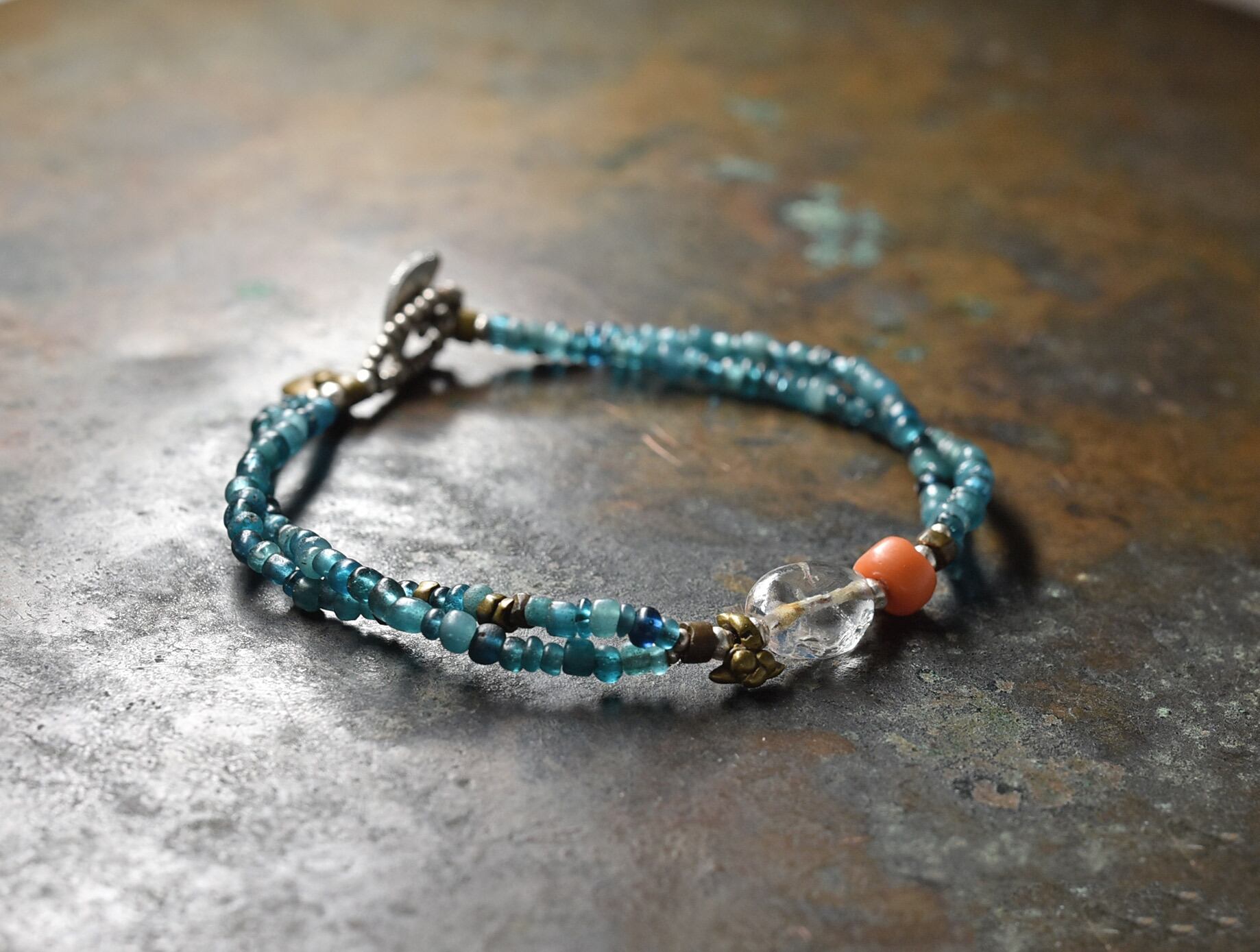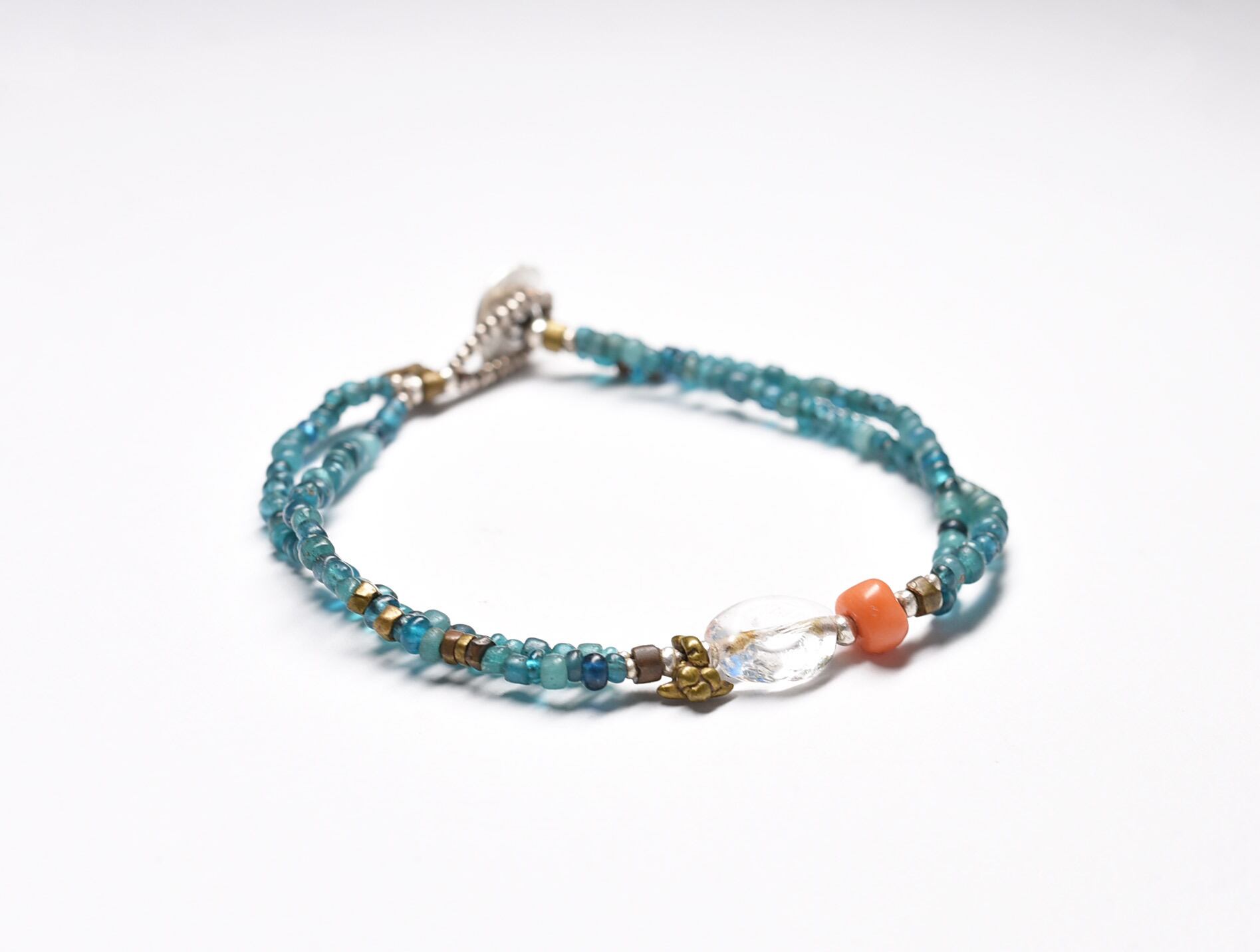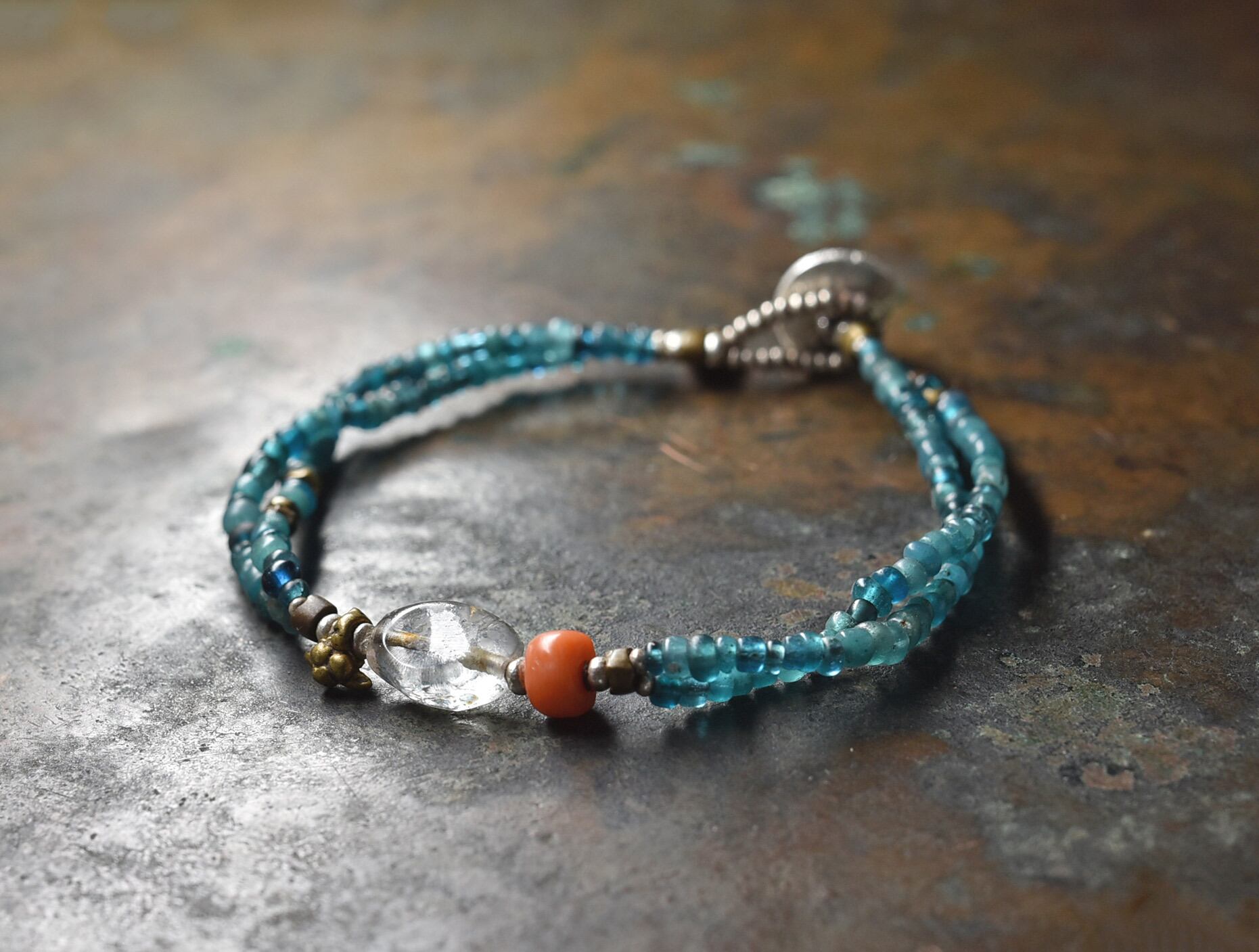 古代水晶、oldチベタンコーラルとエメラルドブルービーズ、oldオリッサブラスの2連ブレス