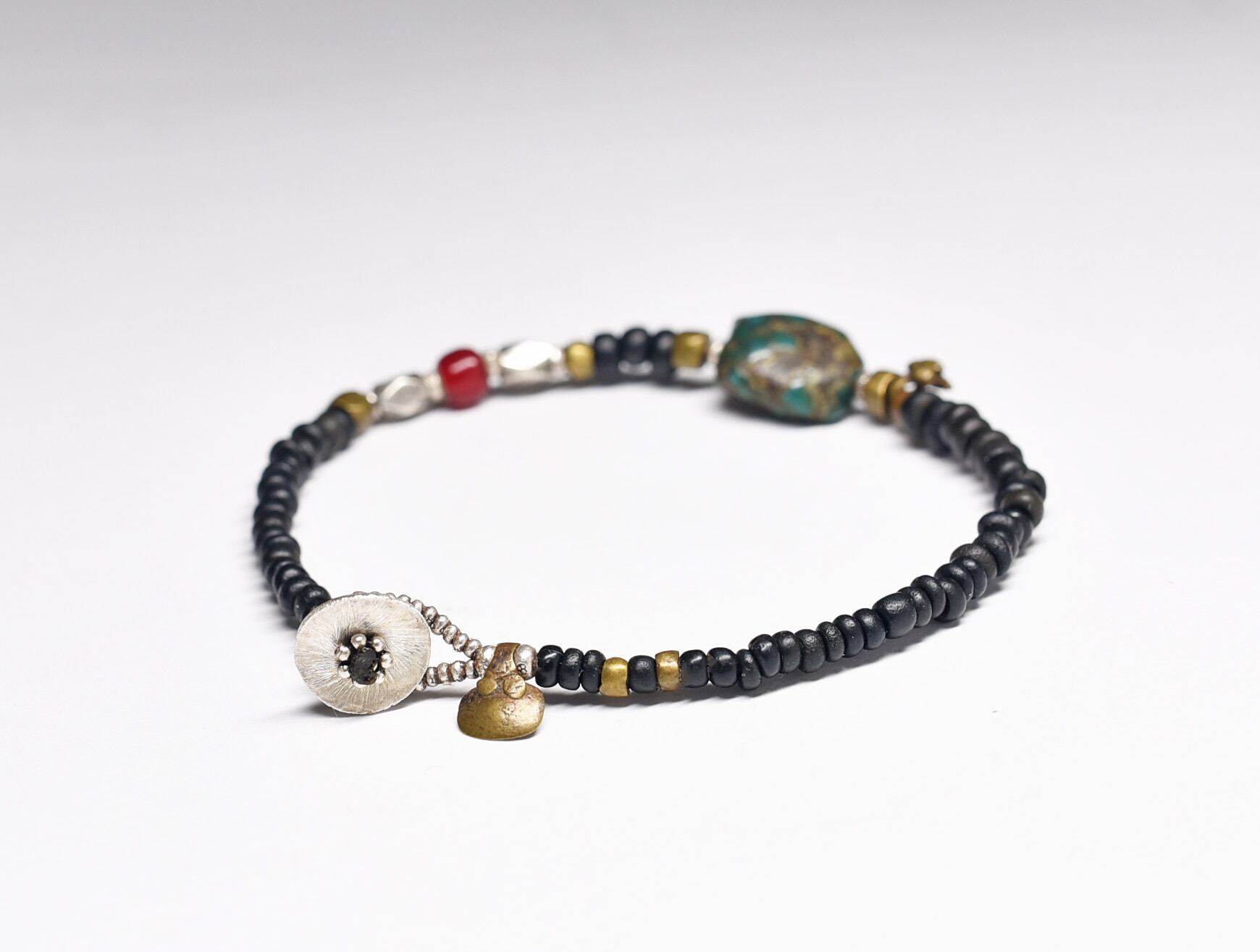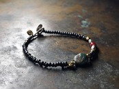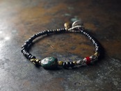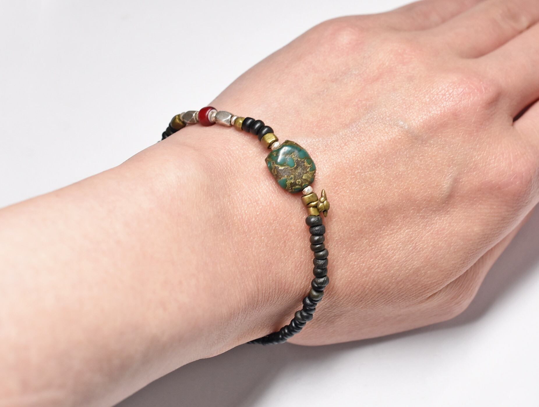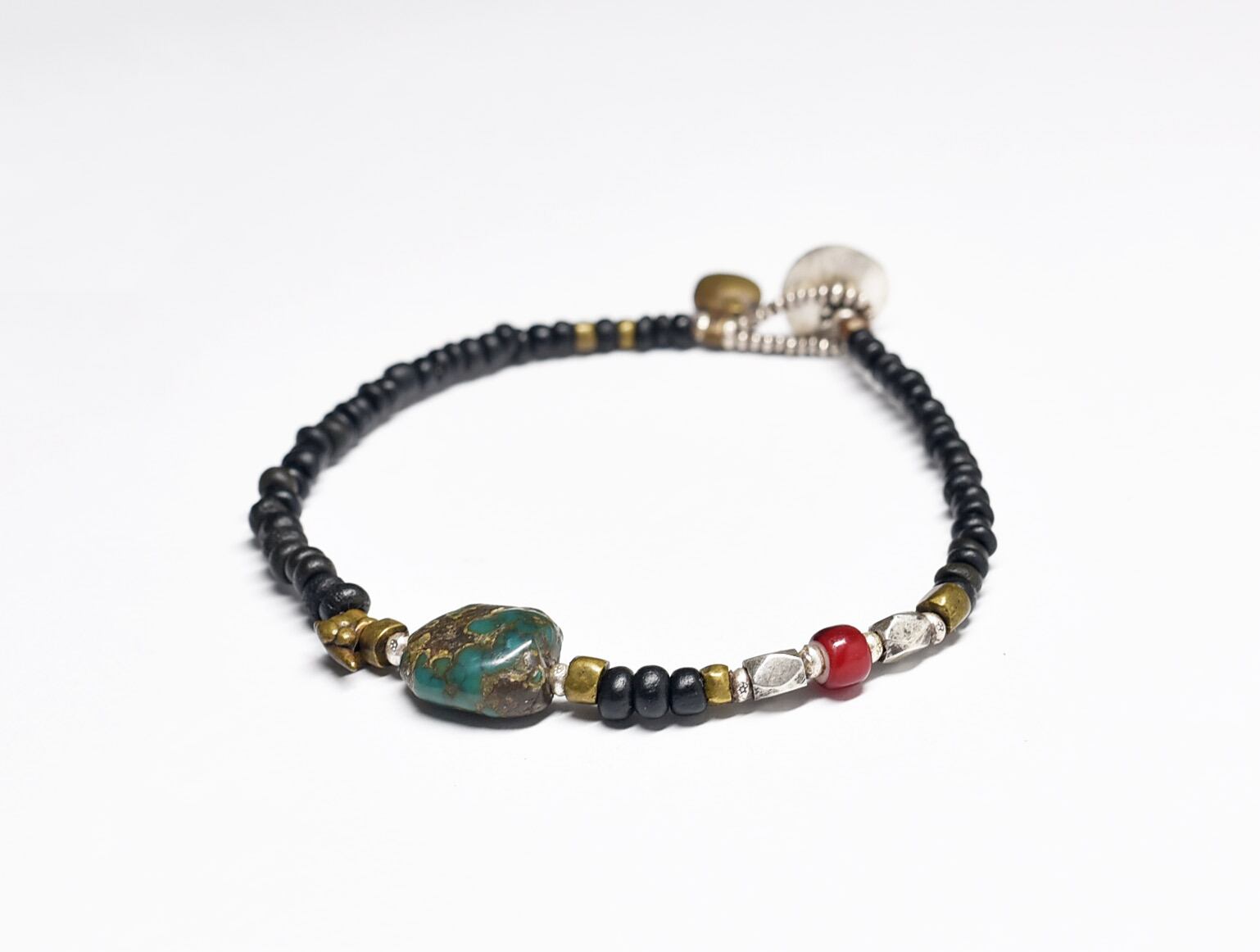 oldチベタンターコイズ、oldチンシルバー、ホワイトハーツ、漆黒のビーズ、oldオリッサブラスなどを繋いだブレスです。