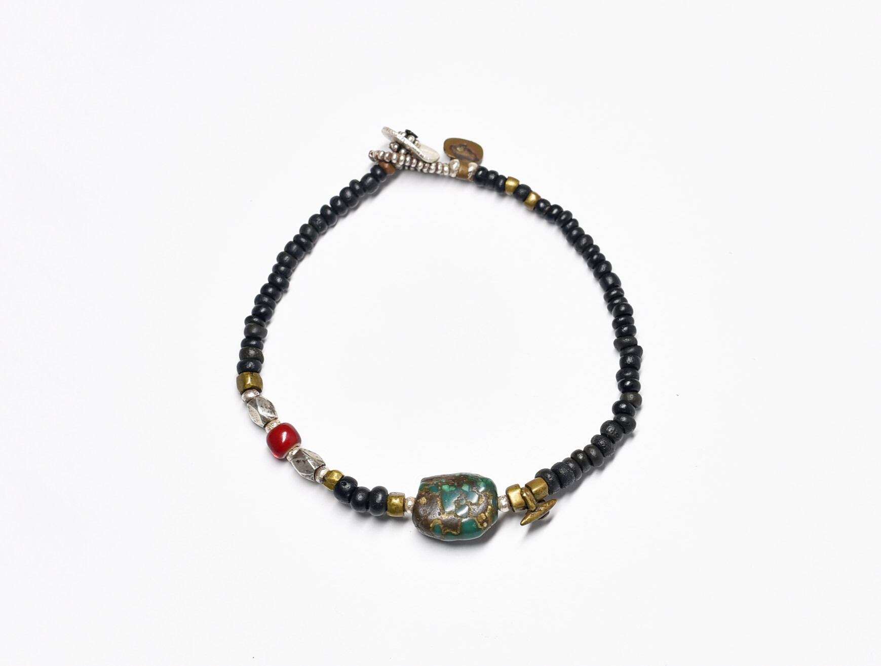 oldチベタンターコイズ、oldチンシルバー、ホワイトハーツ、発掘ビーズの漆黒ブレス