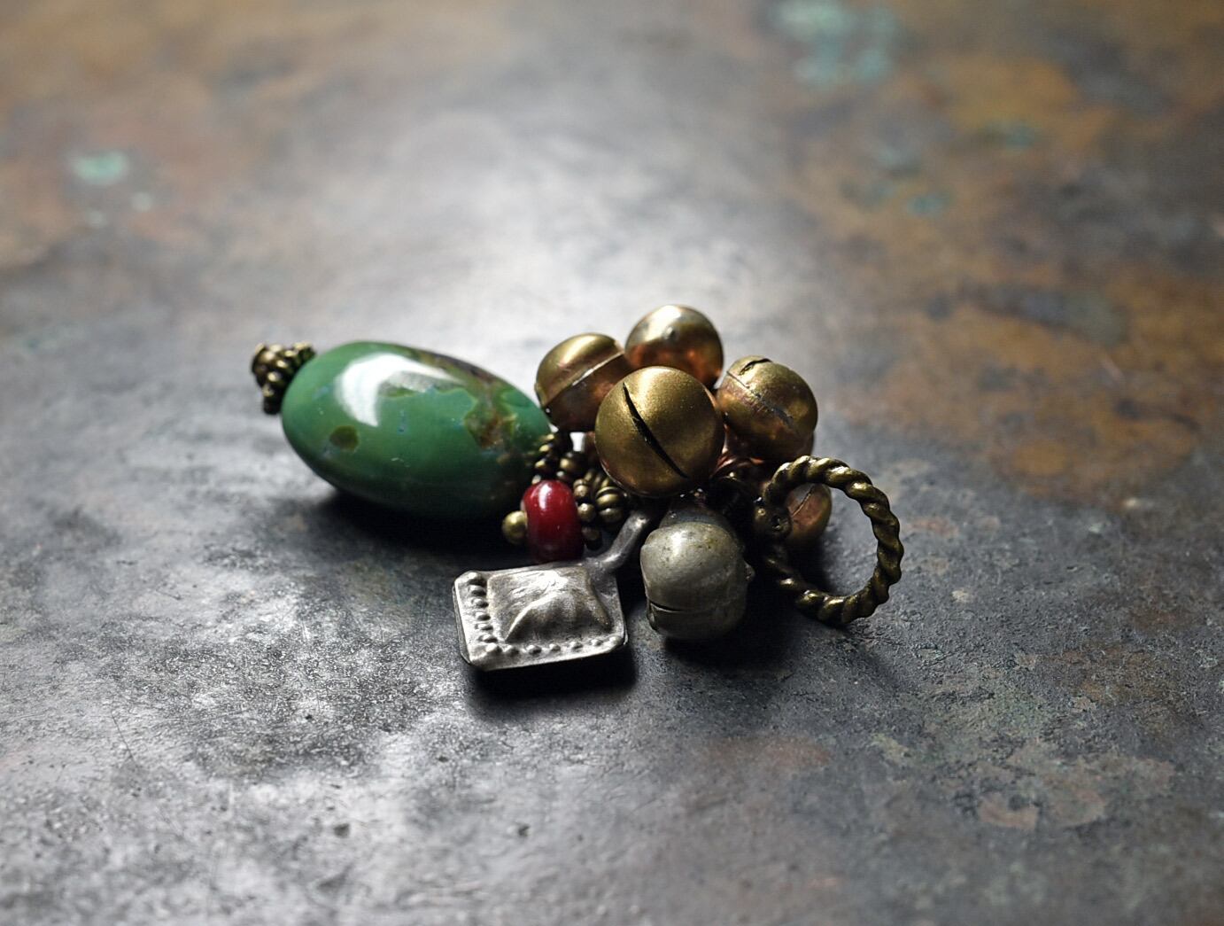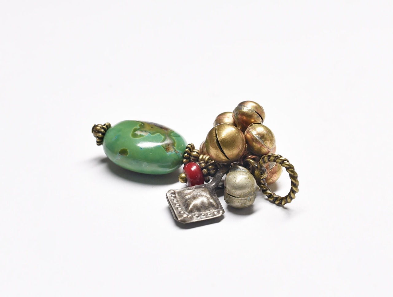 スクエア型のメタルパーツと一粒異なる色合いの鈴はクチ族のものです。装飾品などとして使われていたものです。
