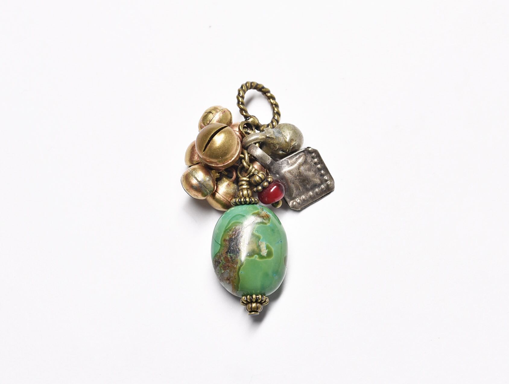 チベタンターコイズとホワイトハーツとたわわな鈴、アフガンパーツを繋いだペンダントトップです。