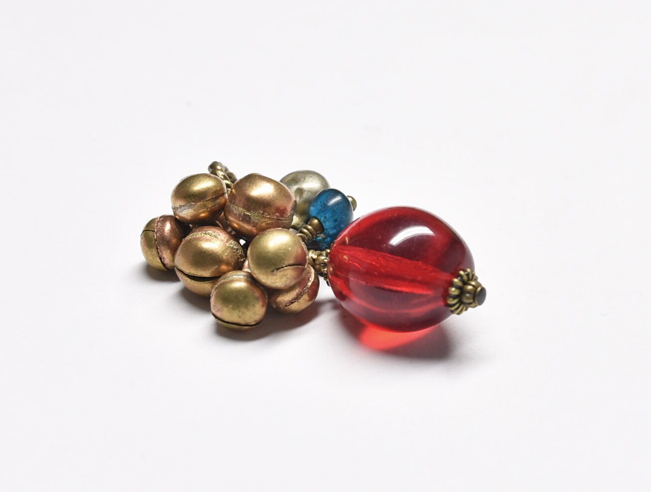 スクエア型のメタルパーツと一粒異なる色合いの鈴はクチ族のものです。装飾品などとして使われていたものです。