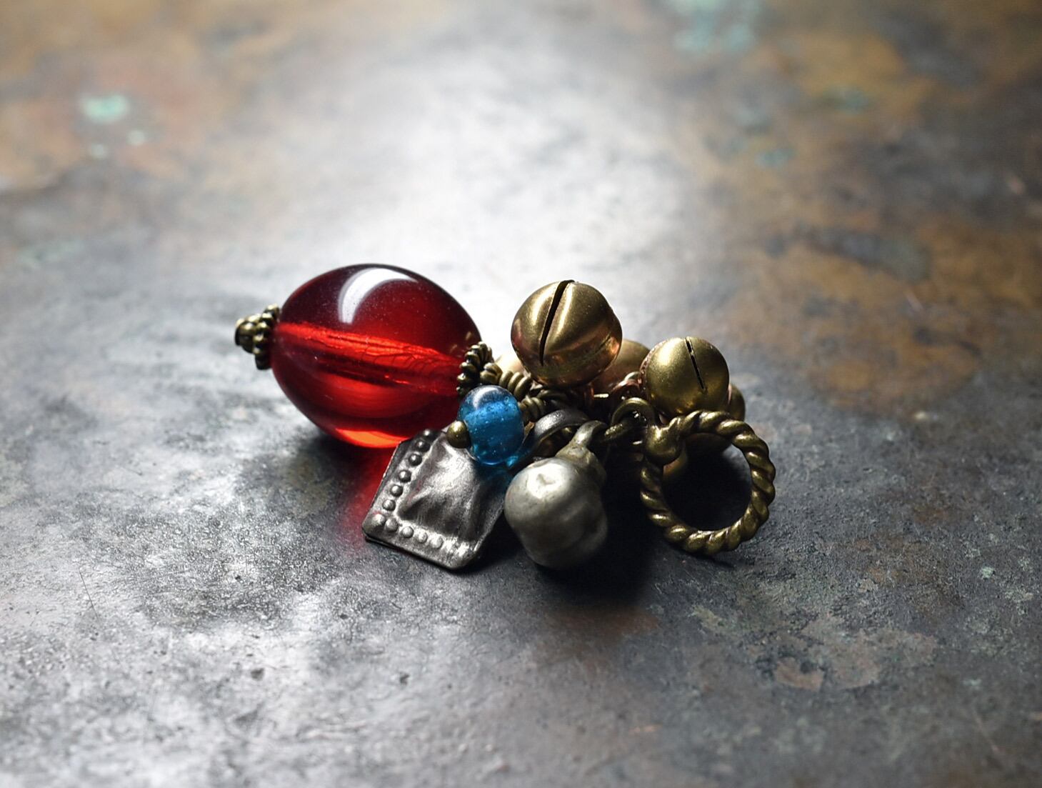 真っ赤なボヘミアビーズとエメラルドブルービーズとたわわな鈴、アフガンパーツを繋いだペンダントトップです。