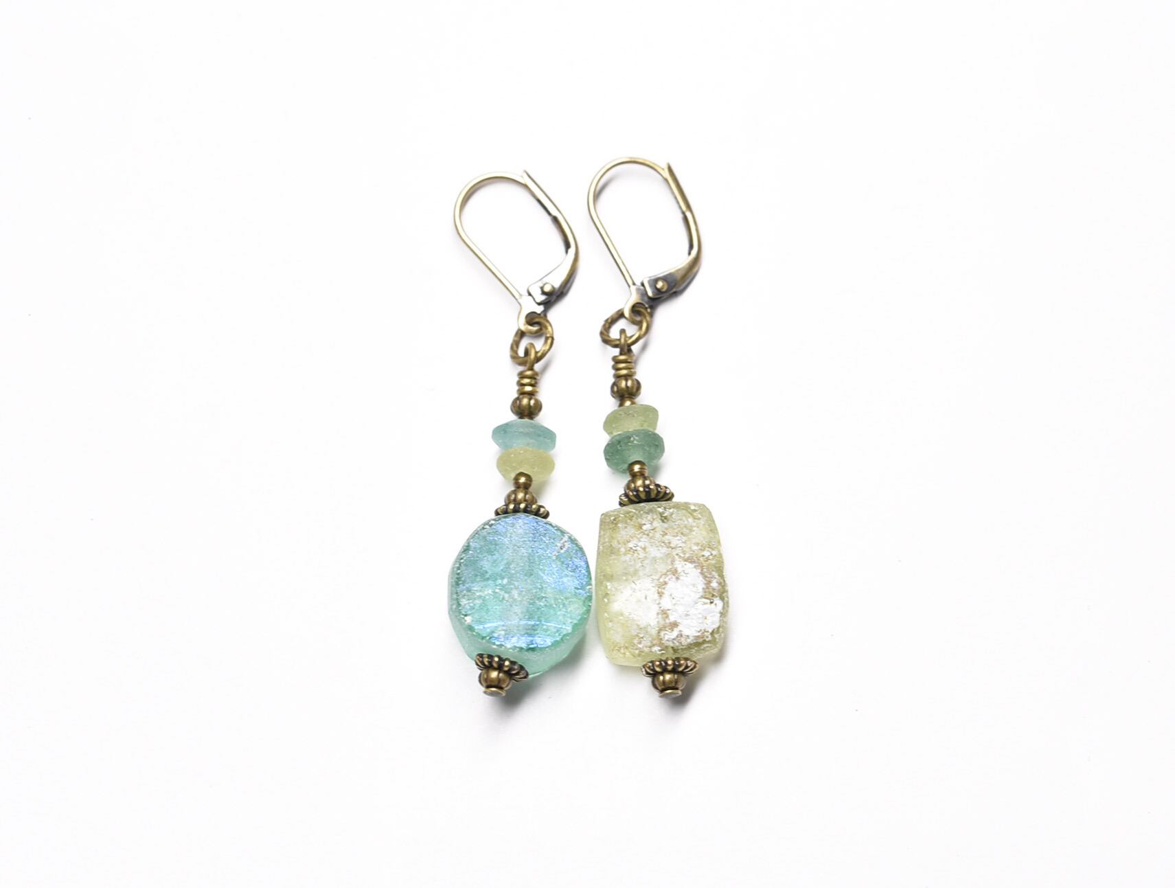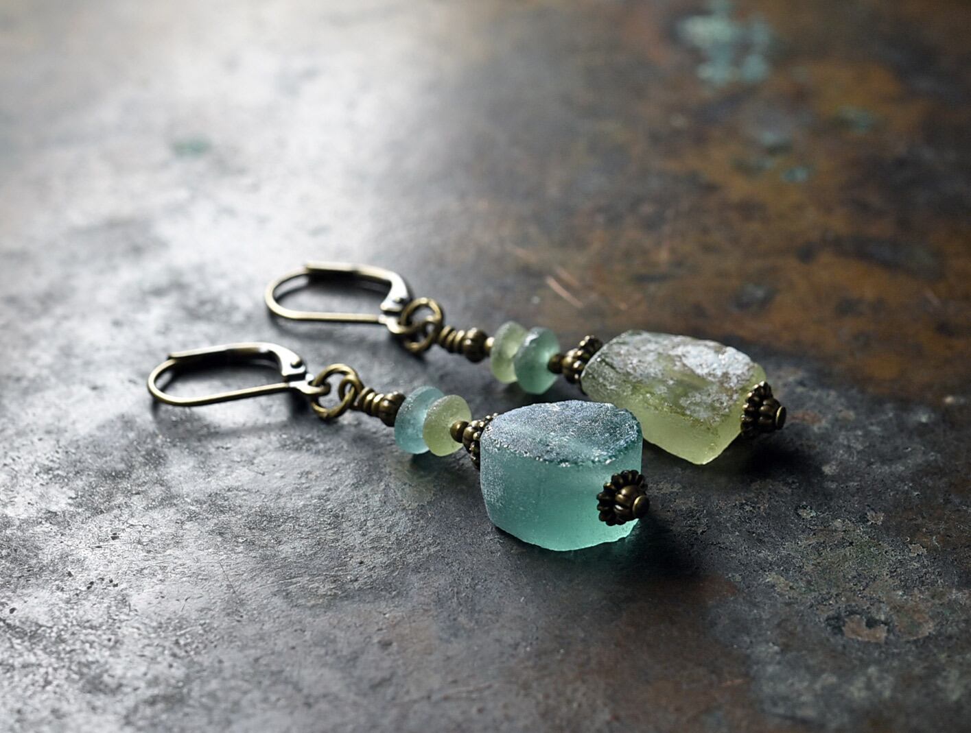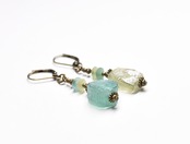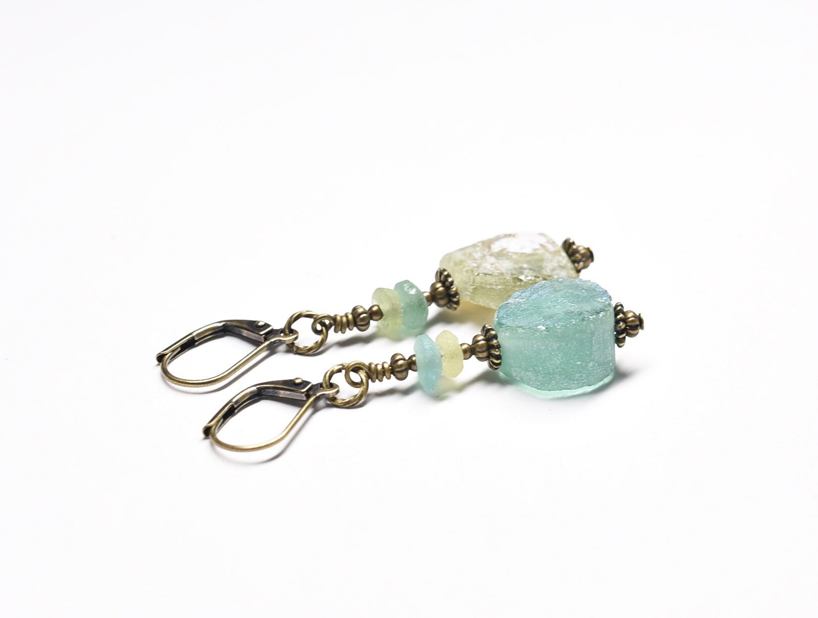 ソーダグリーン&オリーブグリン銀化ローマングラスのピアス