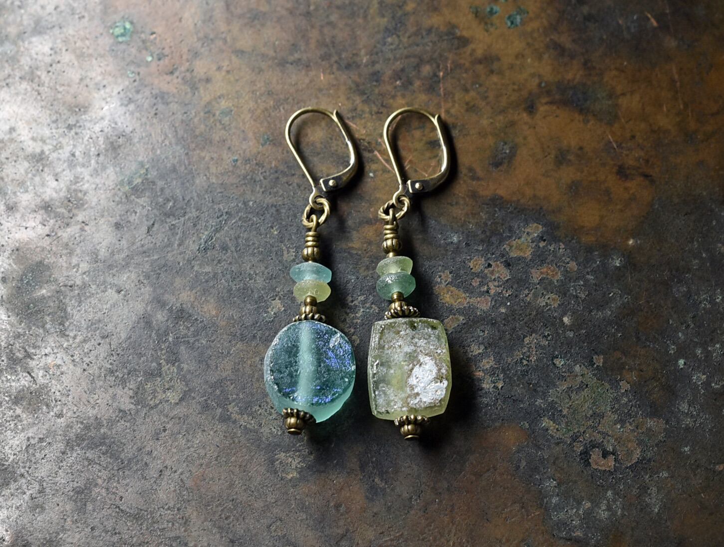 銀化したローマングラスと小さな手削りローマングラスを繋いだピアスです。