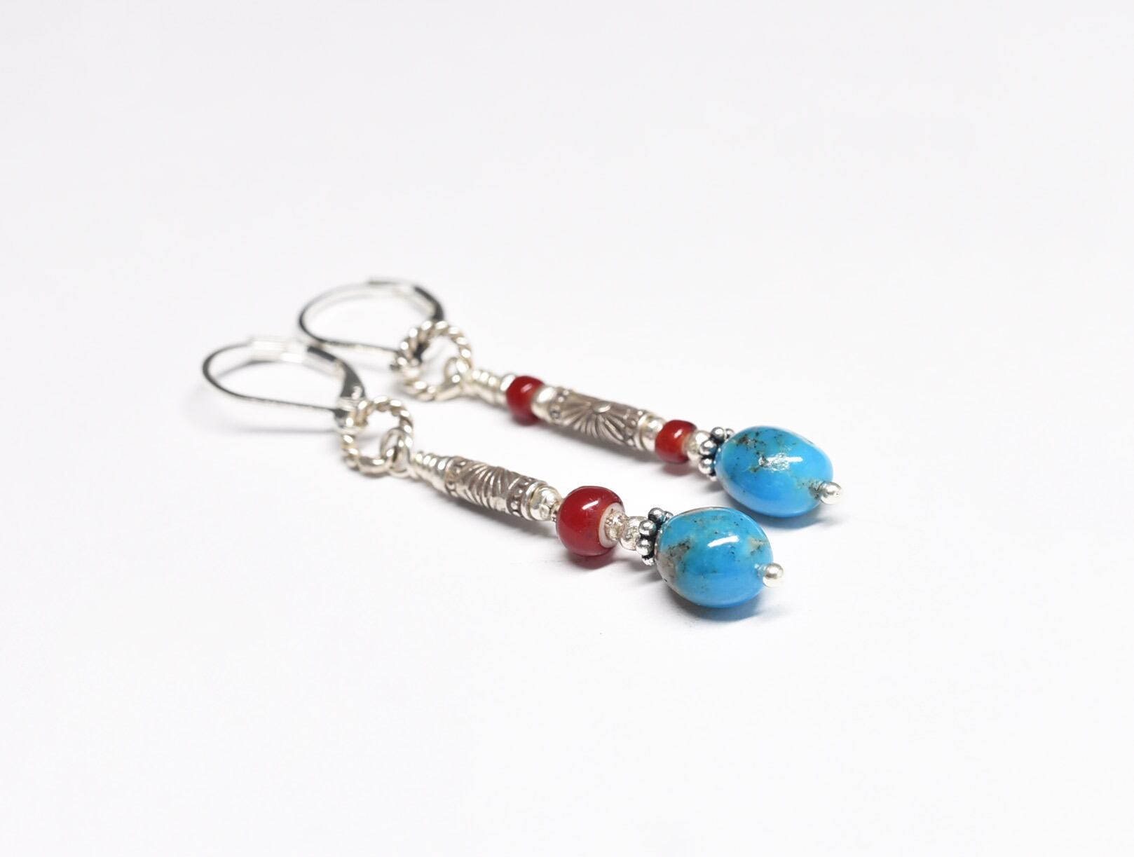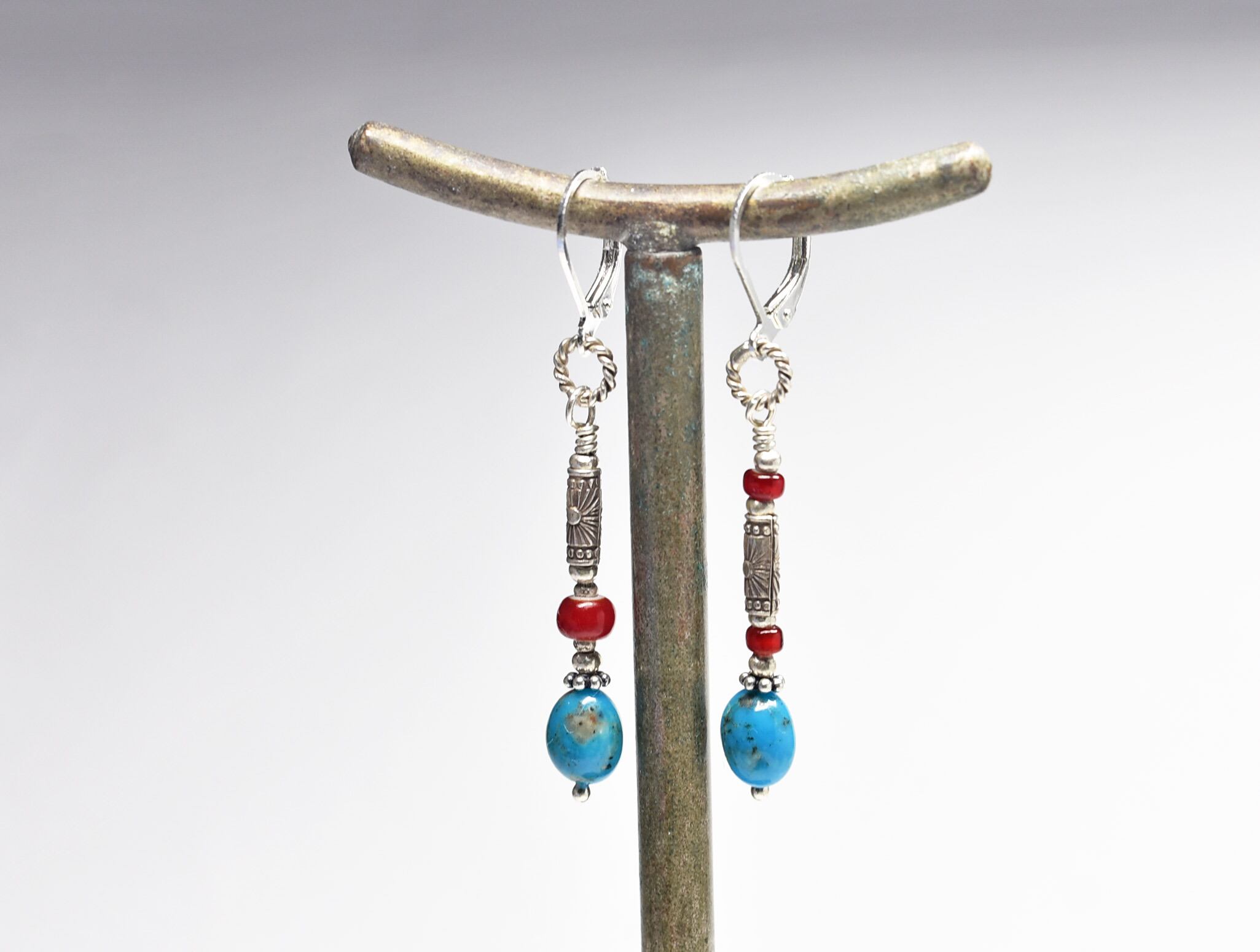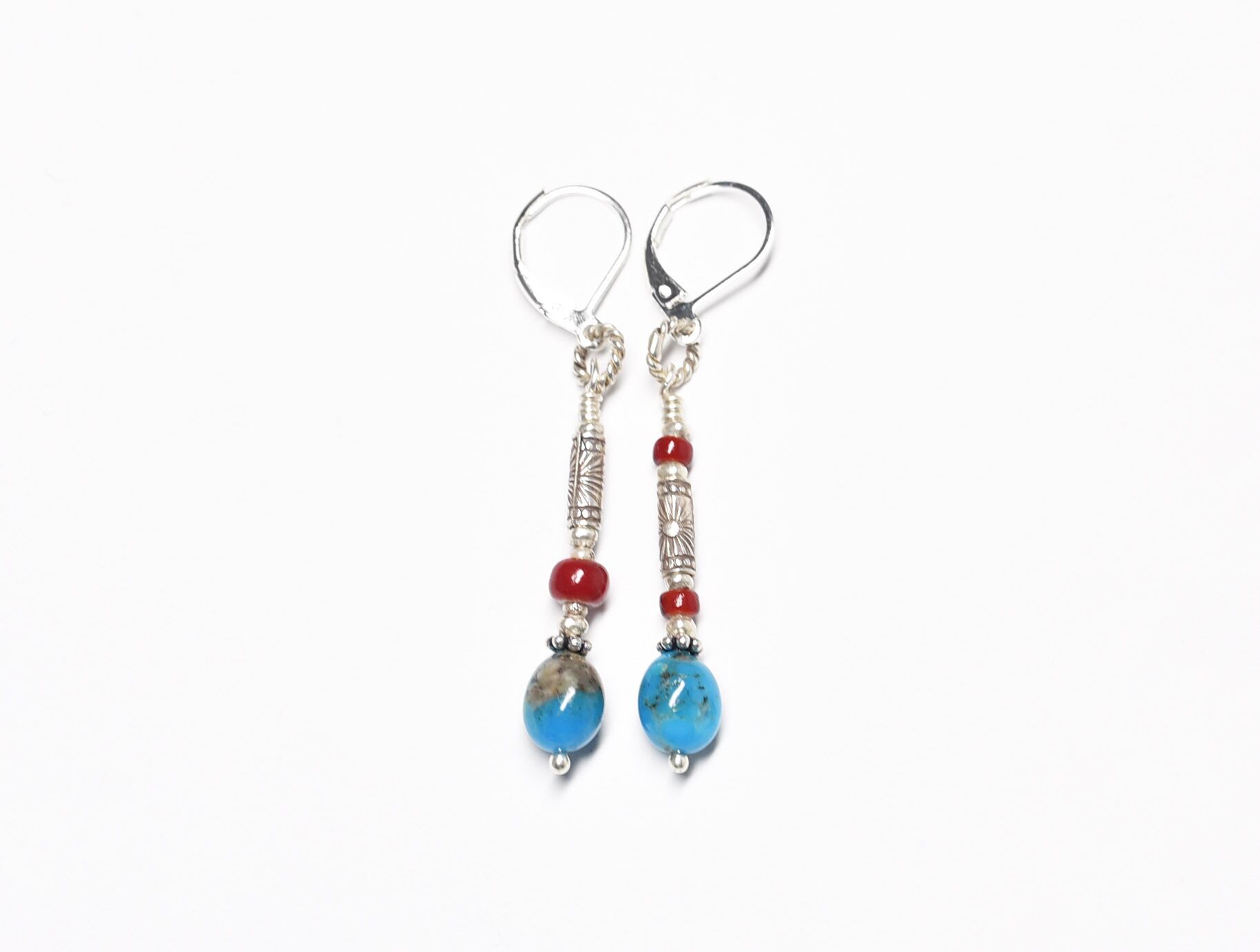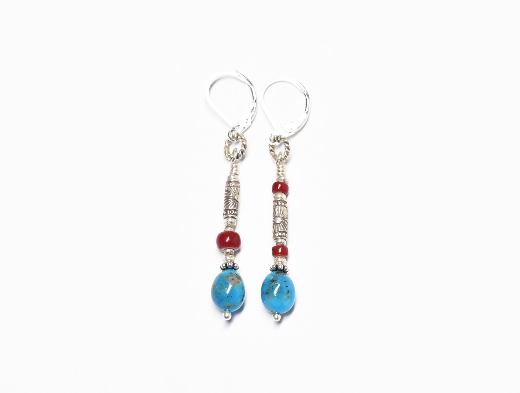 キングマンターコイズと、濃赤ホワイトハーツをカレンシルバーのリングへ繋いだピアスです。
