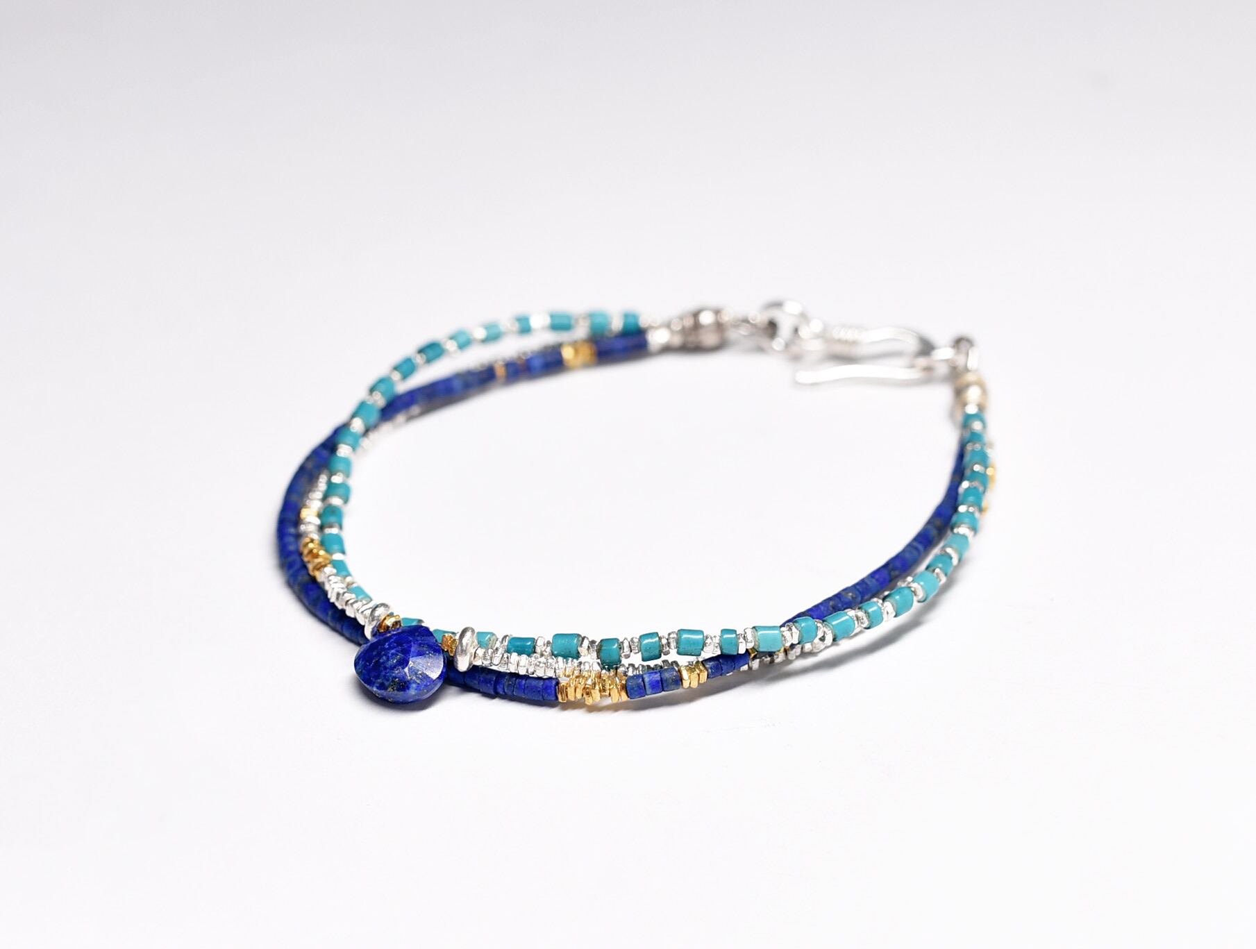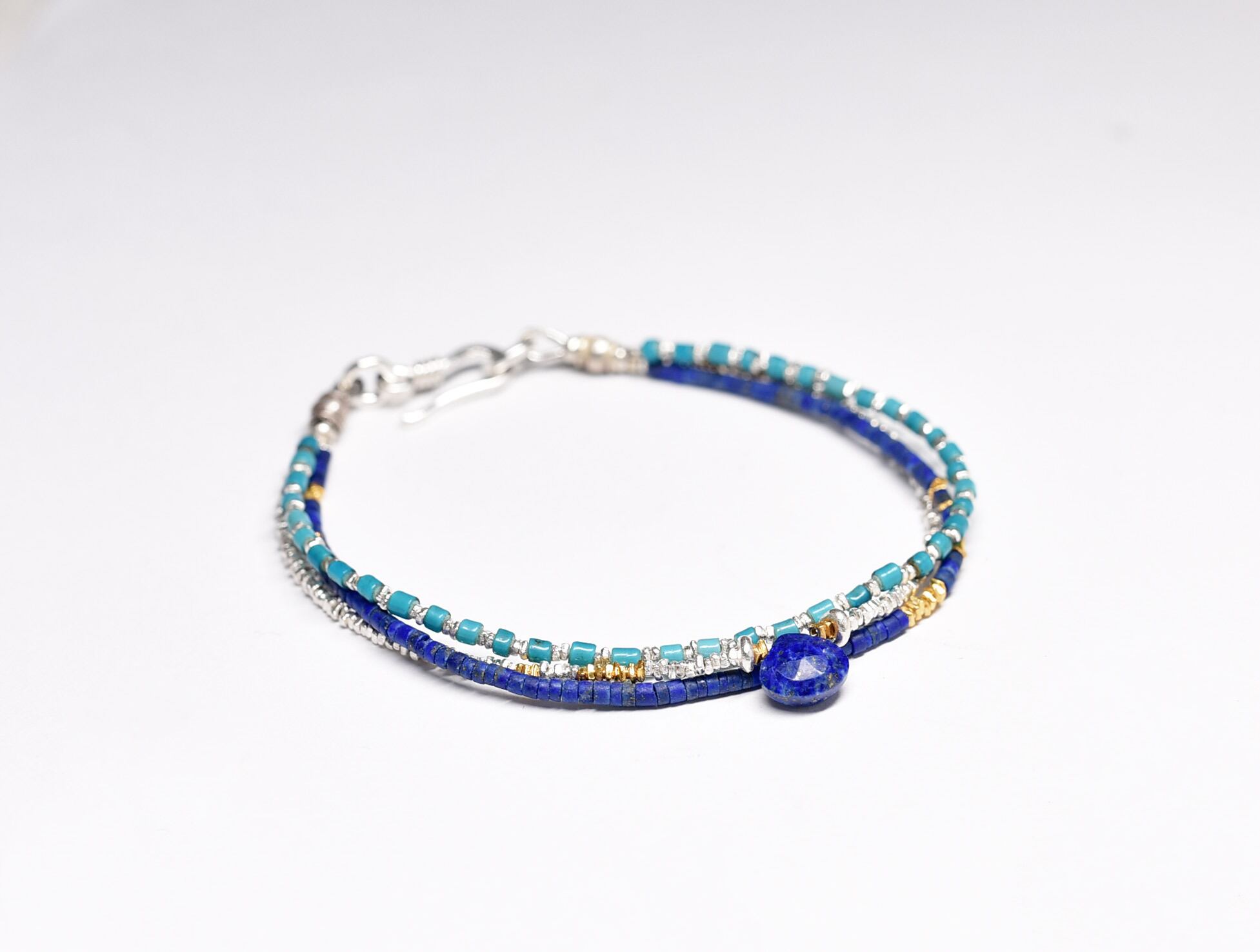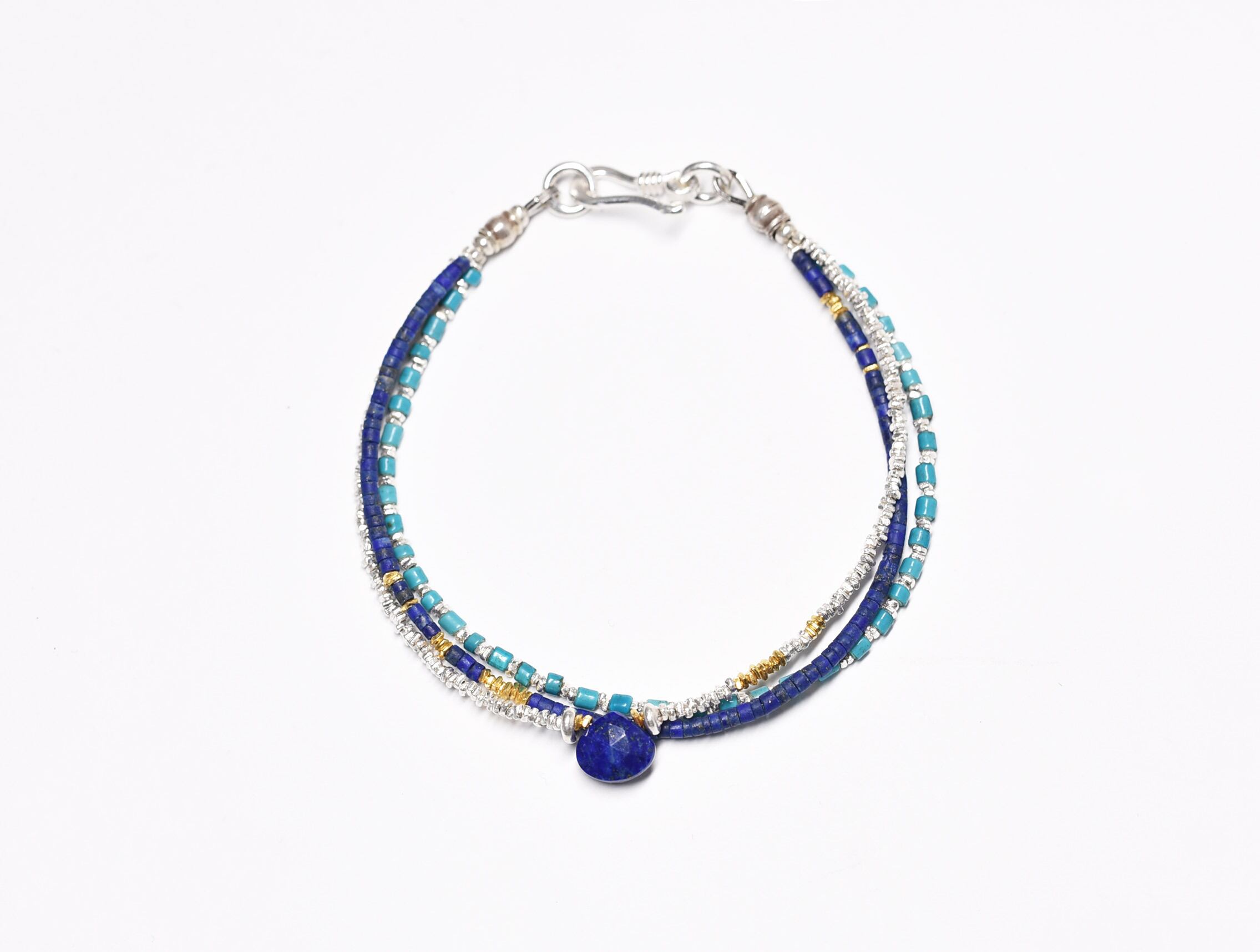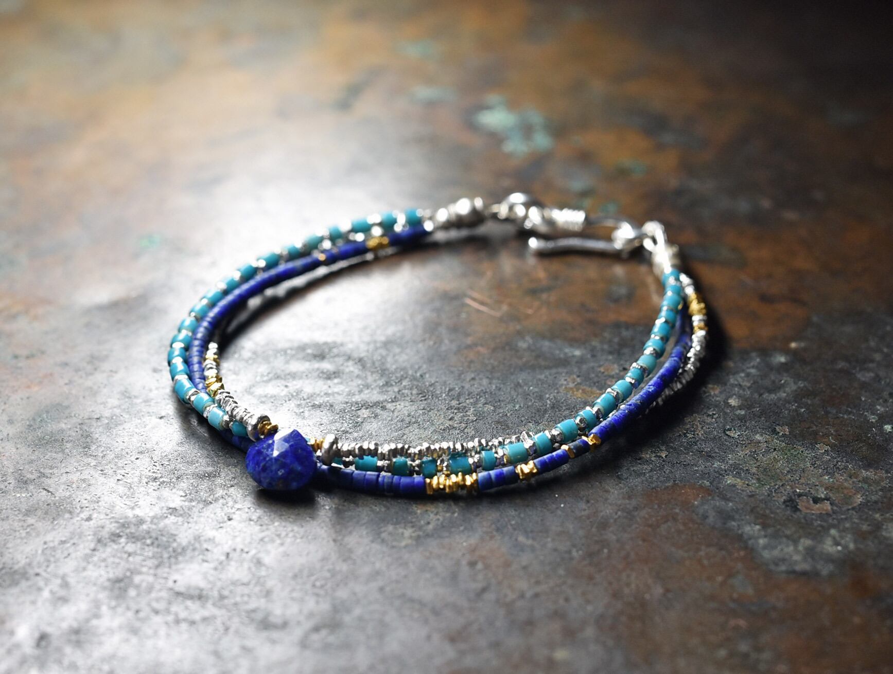 ラピスとターコイズブルーホワイトハーツ、カレンシルバーの3連ブレス(再販)