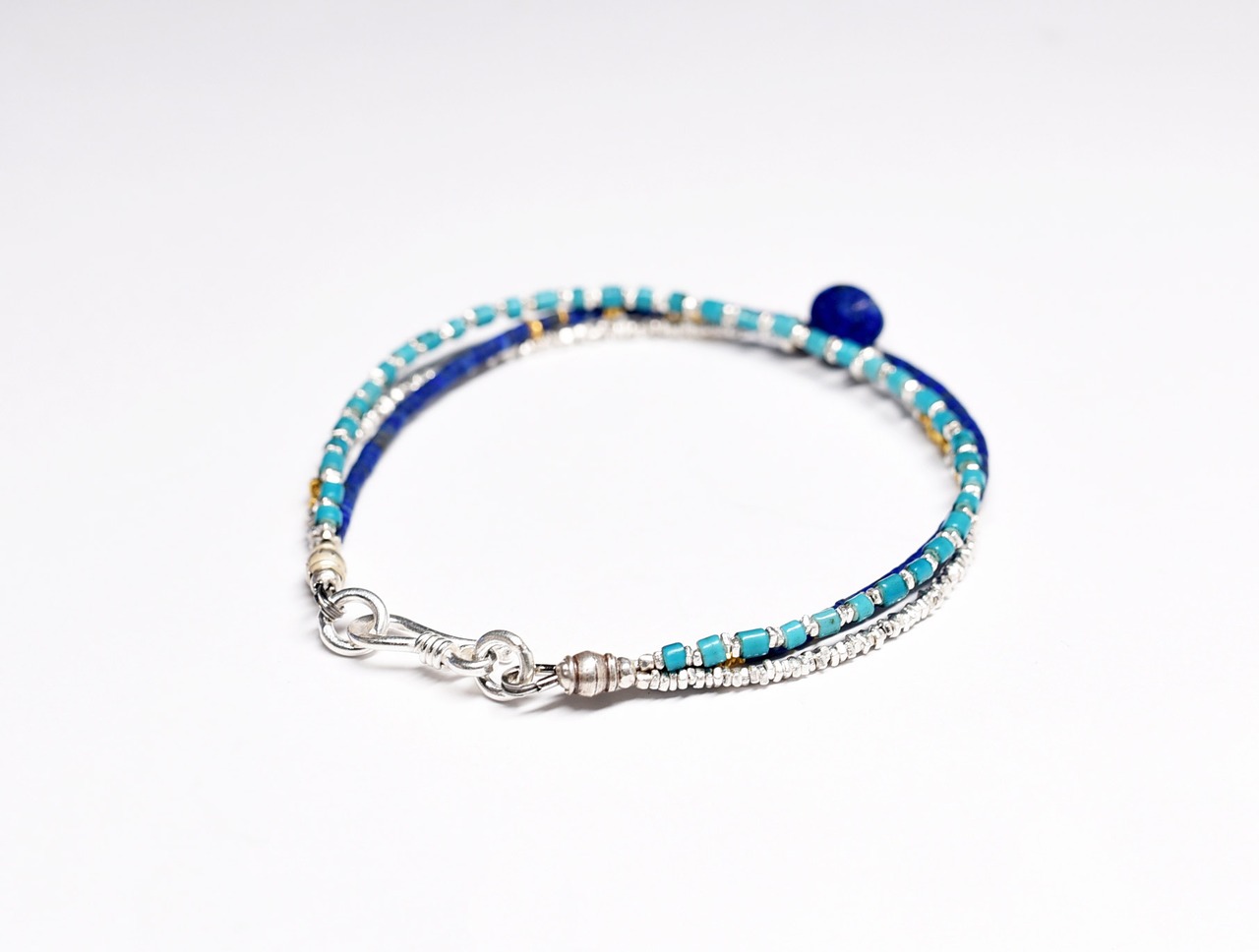 ラピスとターコイズブルーホワイトハーツ、小さなカレンシルバービーズを繋いだ3連のブレスです。