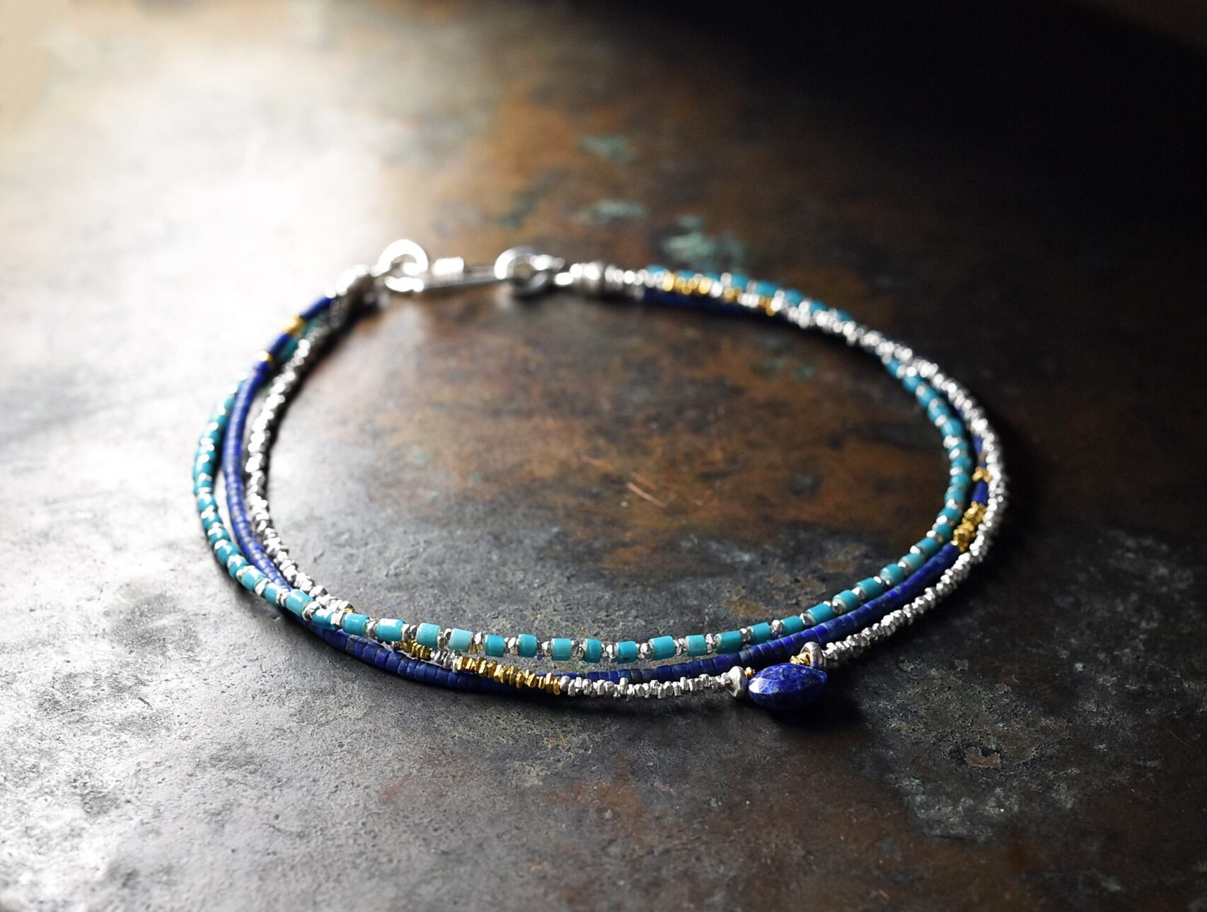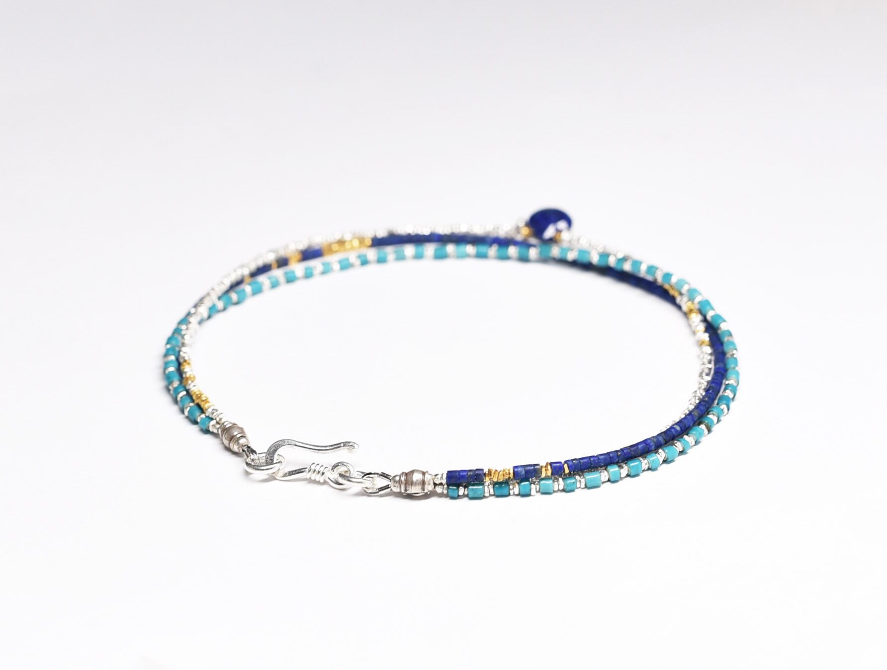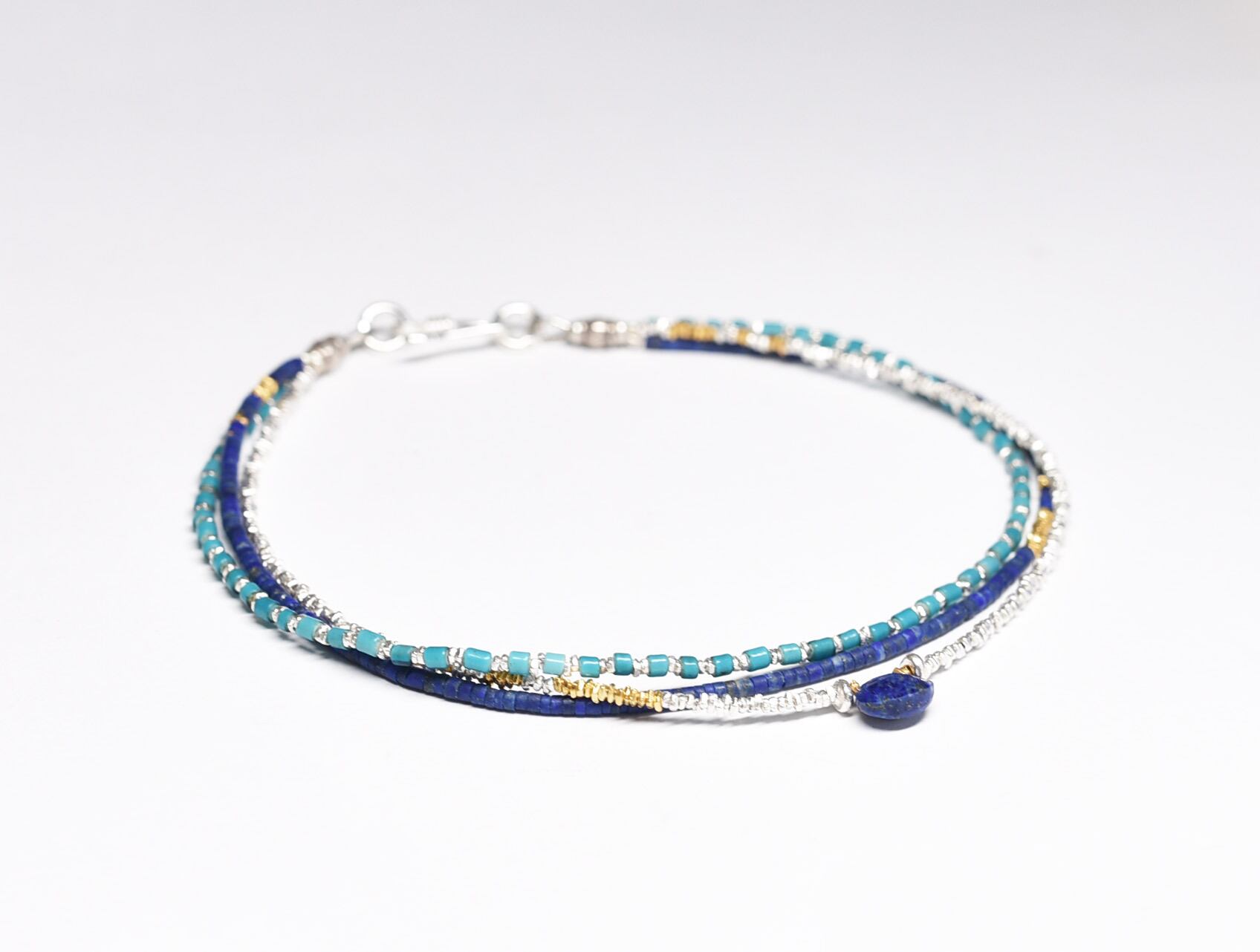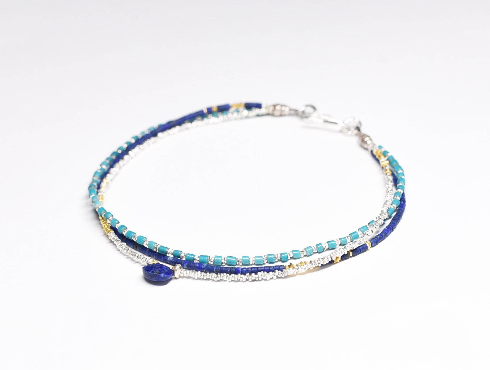 ラピスとターコイズブルーホワイトハーツ、カレンシルバーの3連アンクレット