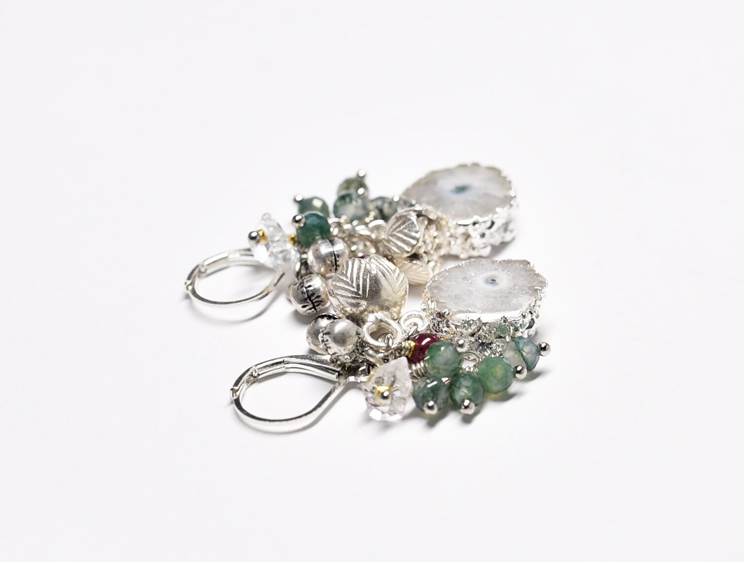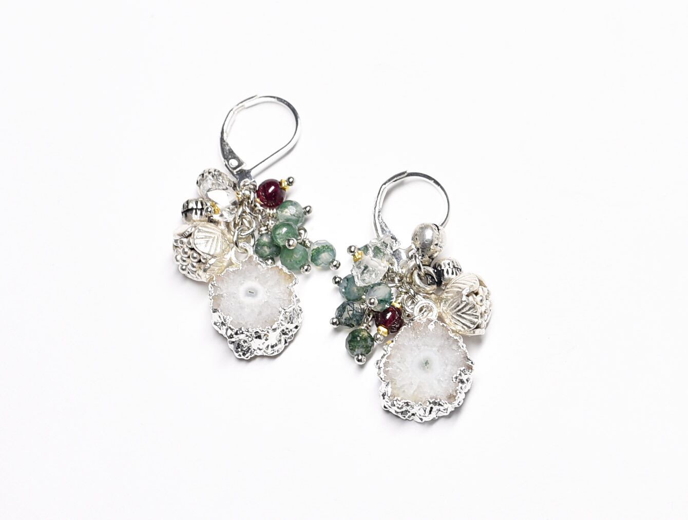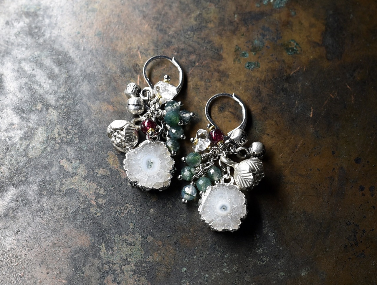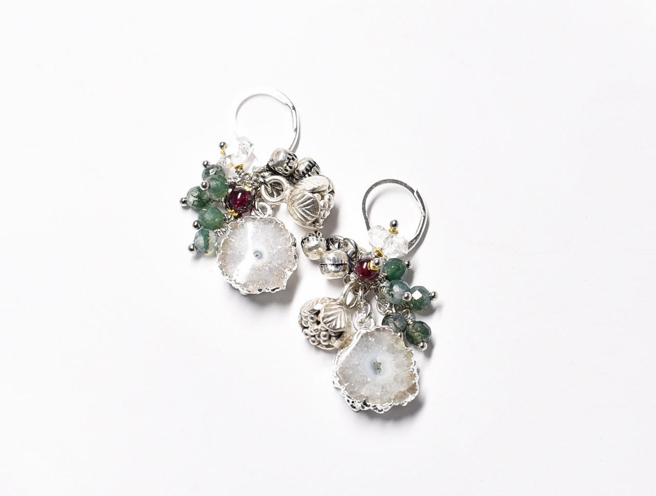 ソーラークォーツとたわわなモスアゲート、ハーキマーダイヤモンド、ガーネットとコロンとしたカレンシルバーを繋いだピアスです。