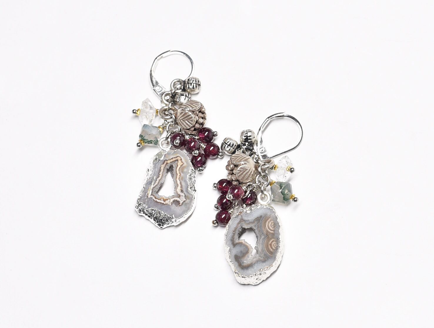 ドゥルジーアゲートとたわわなガーネット、ハーキマーダイヤモンド、モスアゲートとコロンとしたカレンシルバーのピアス