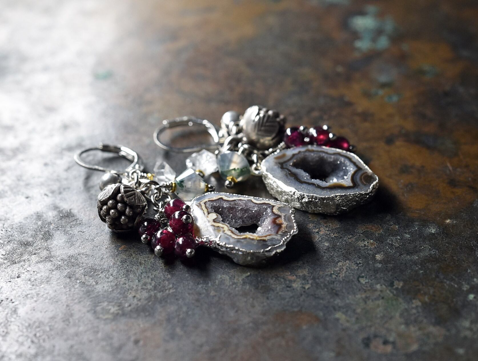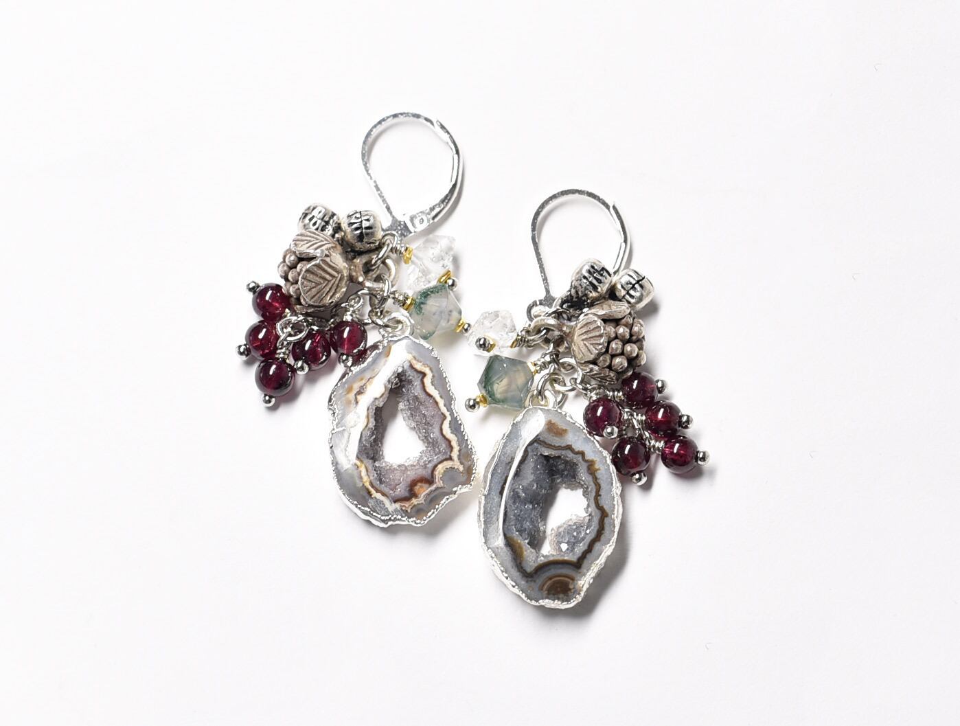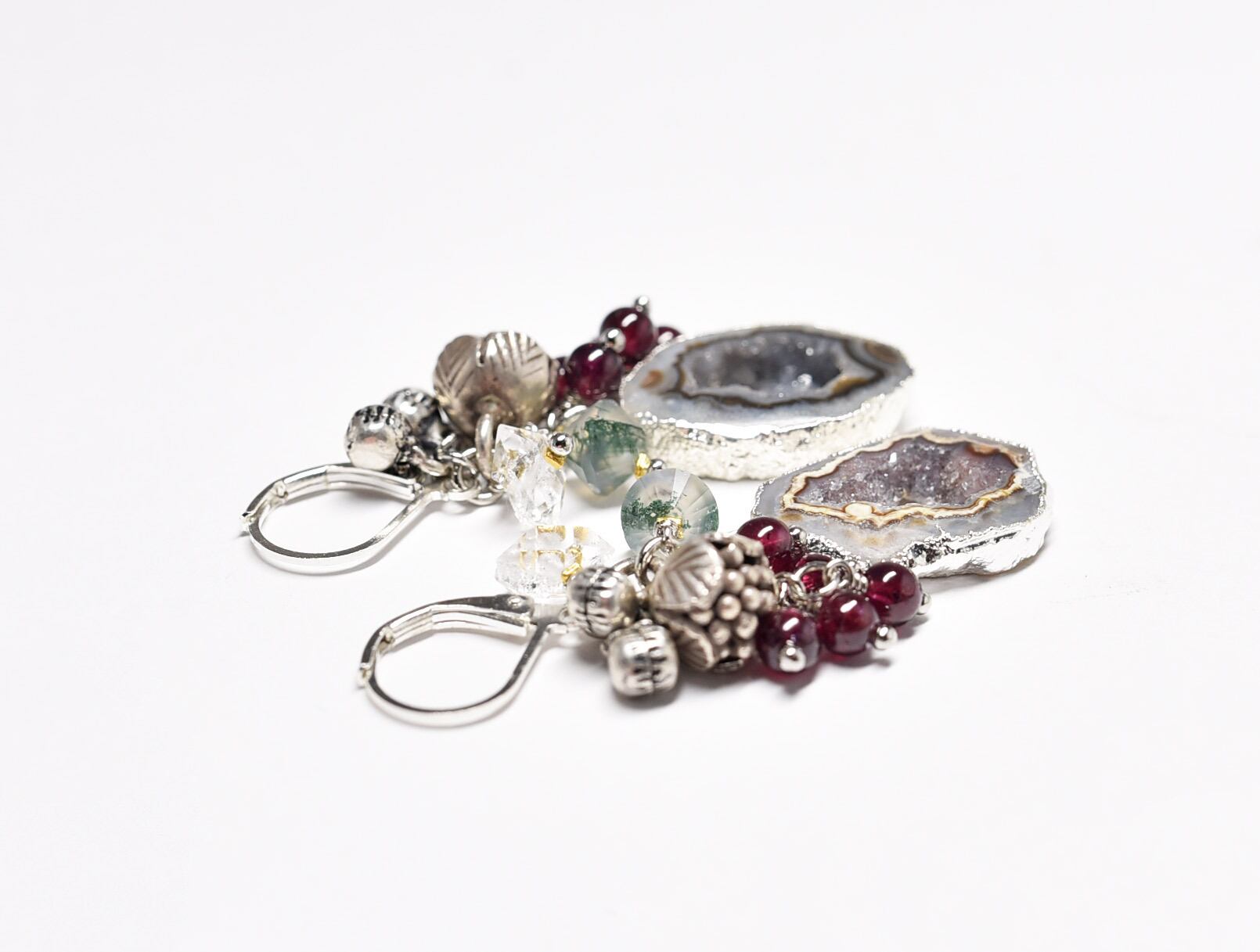 ドゥルジーアゲートとたわわなガーネット、ハーキマーダイヤモンド、モスアゲートとコロンとしたカレンシルバーを繋いだピアスです。