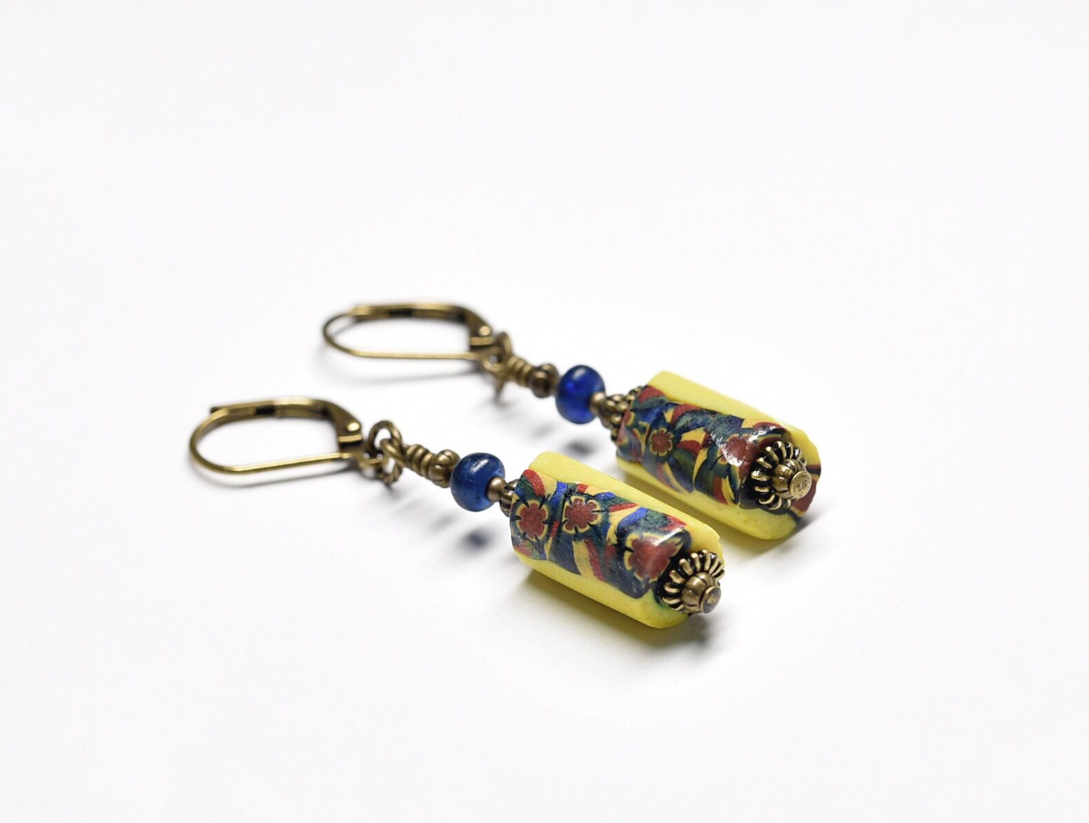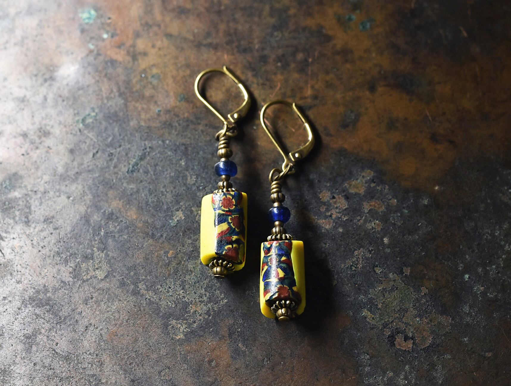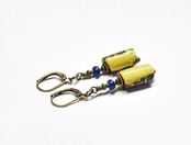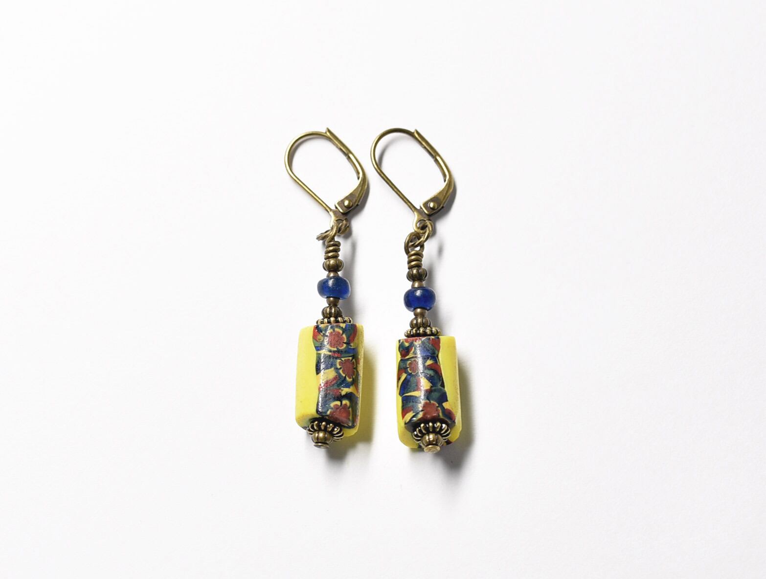 イエロー&クレイジーミックスベネチアアンティークミルフィオリとブルービーズのピアス
