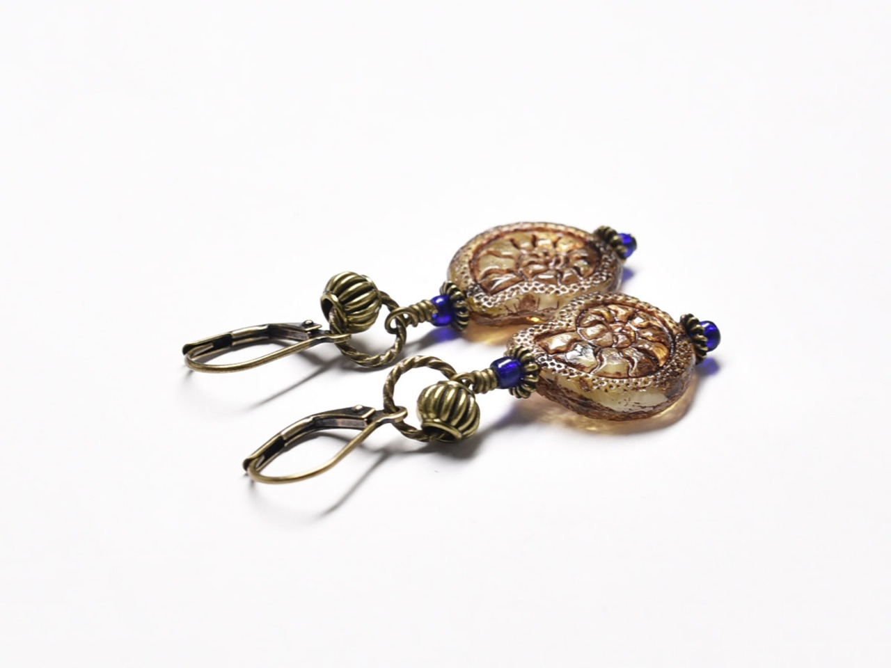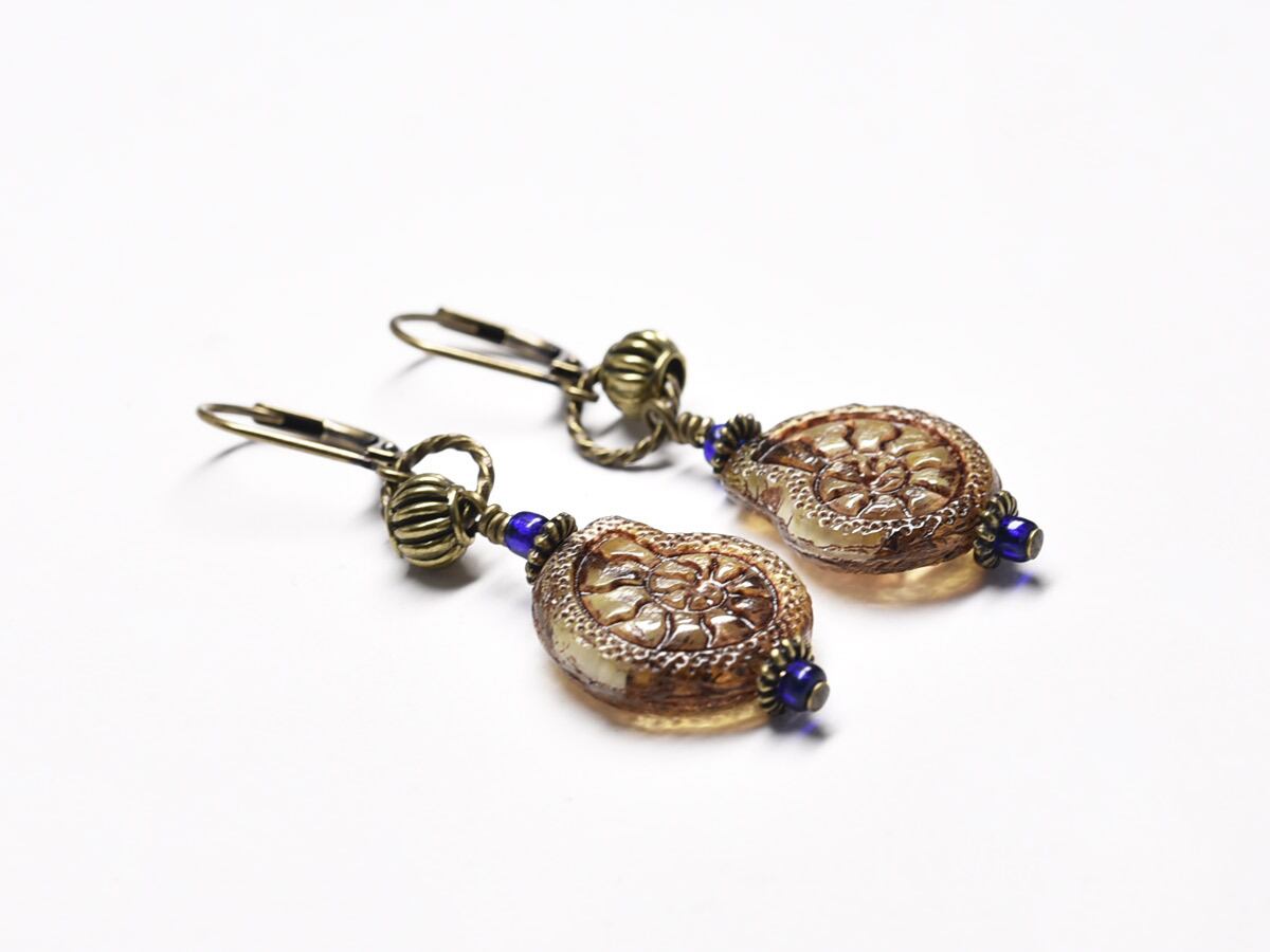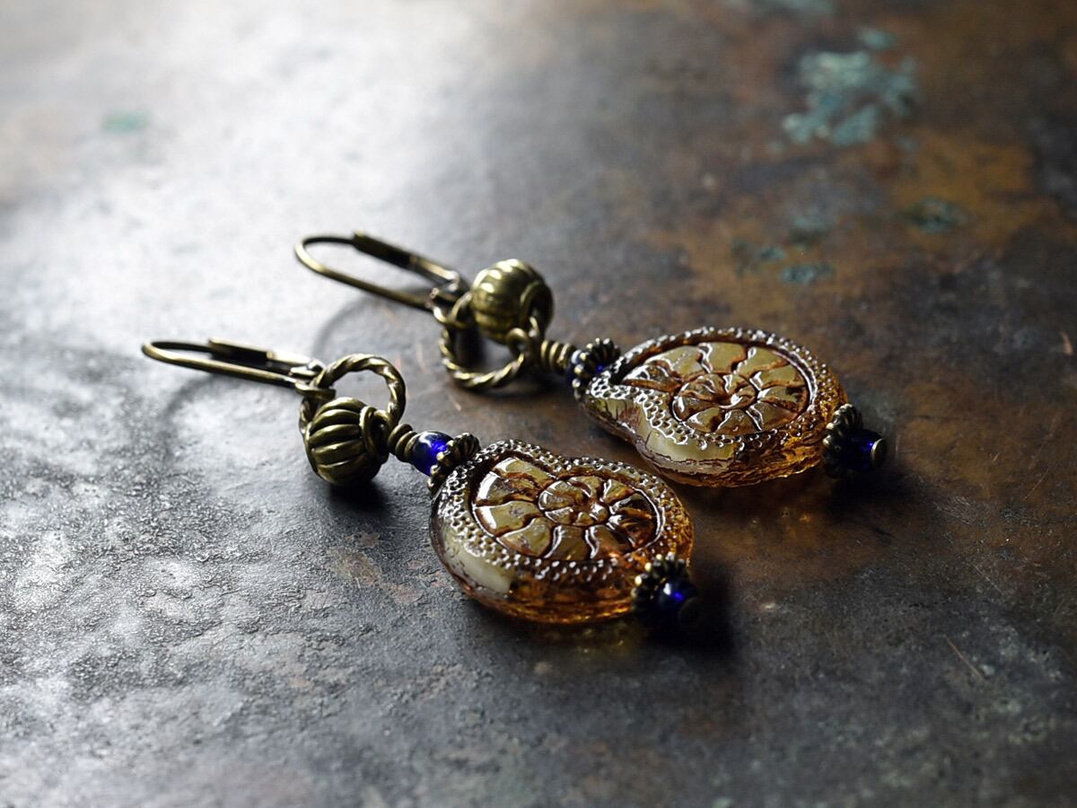 アンモナイト型のチェコビーズと小さな瑠璃色アンティークビーズを繋いだピアスです。
